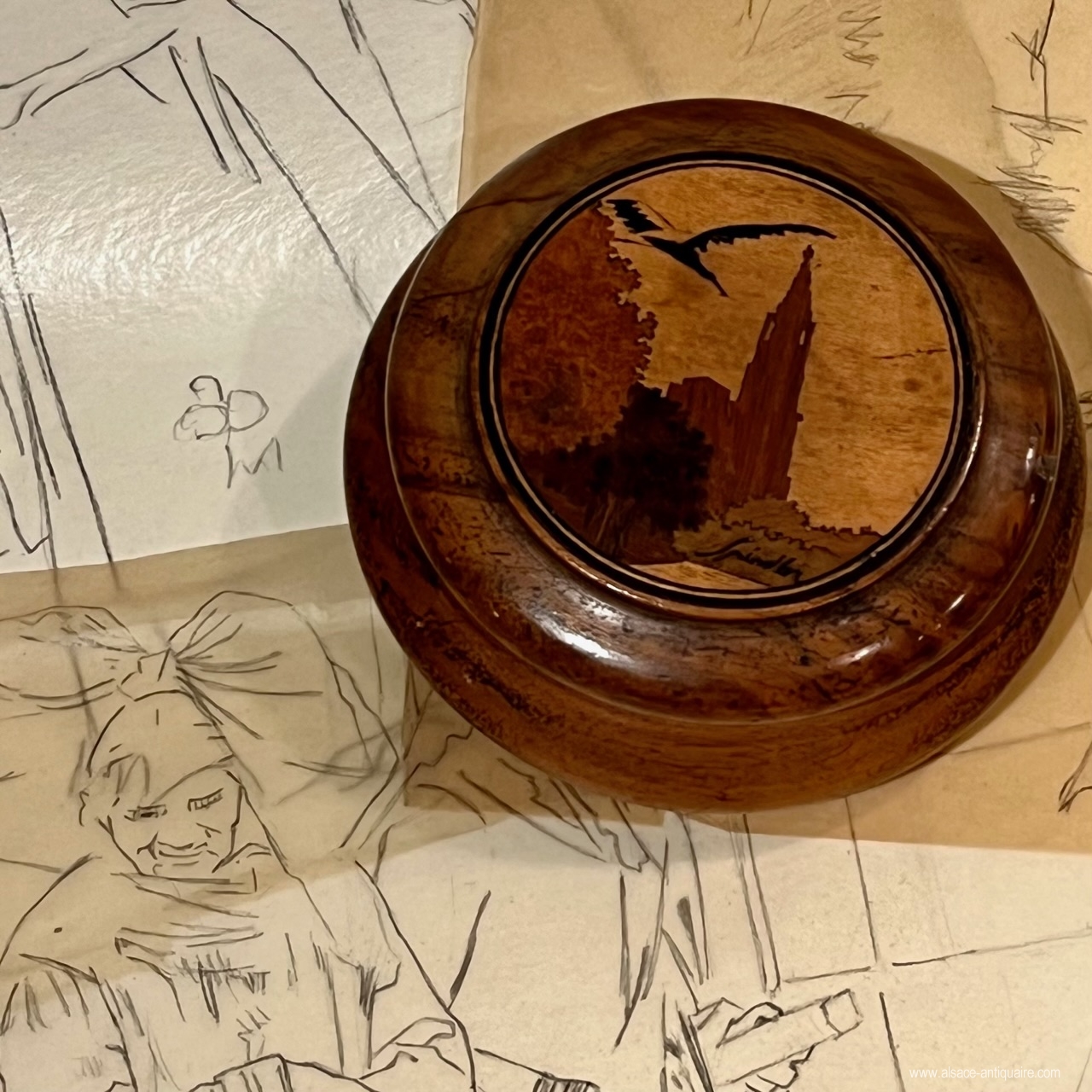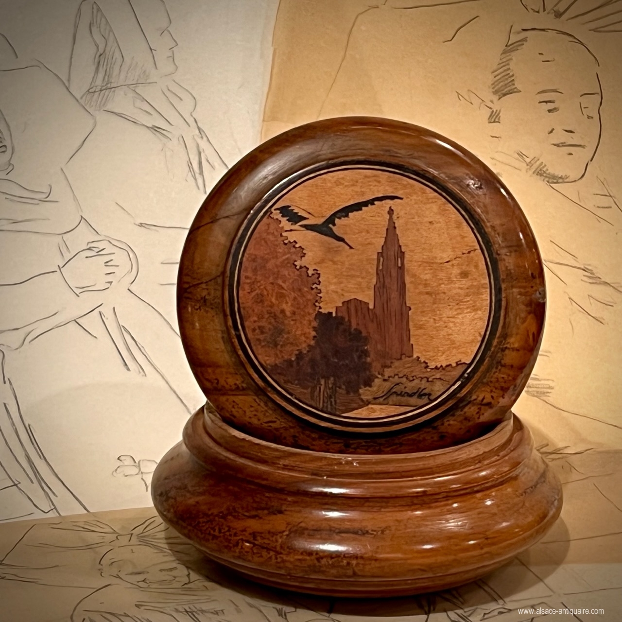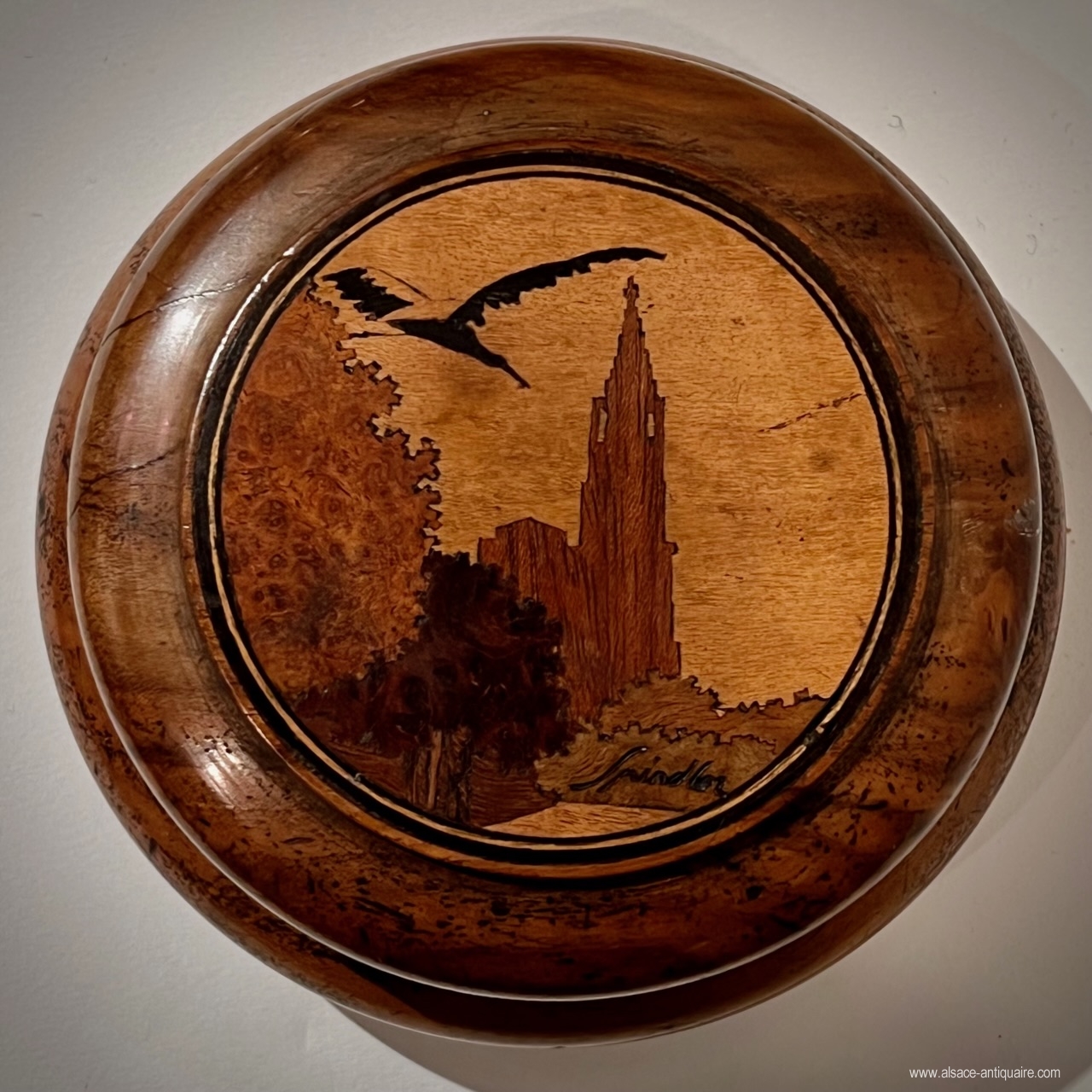 Round box in turned walnut wood, the lid fits on the neck of the body, beautiful inlaid decoration on the top of the lid, stork and Strasbourg cathedral. Signed Spindler