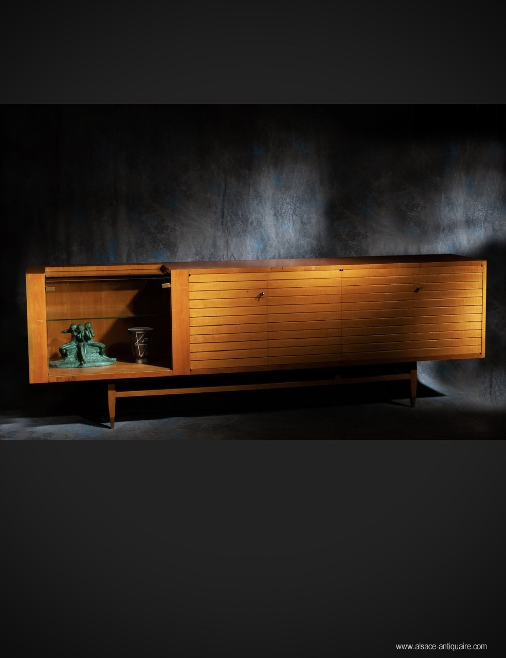 Beautiful design and beautiful manufacture for this important row whose facade opens with 4 doors and a showcase, the furniture is signed by Raphaël. The cabinetwork is of a high standard and conforms to the principles of this designer who has always favored unique pieces and avoided mass production. Contrasts and dynamics are obtained by the horizontal grooves on the blond wood of the doors. The sheathed feet are finished with a brass shoe.