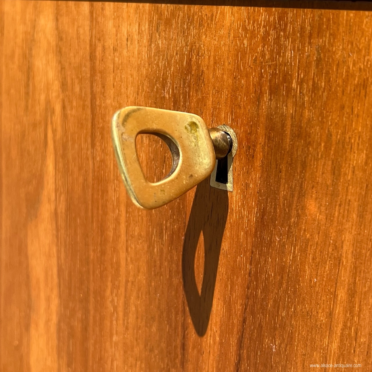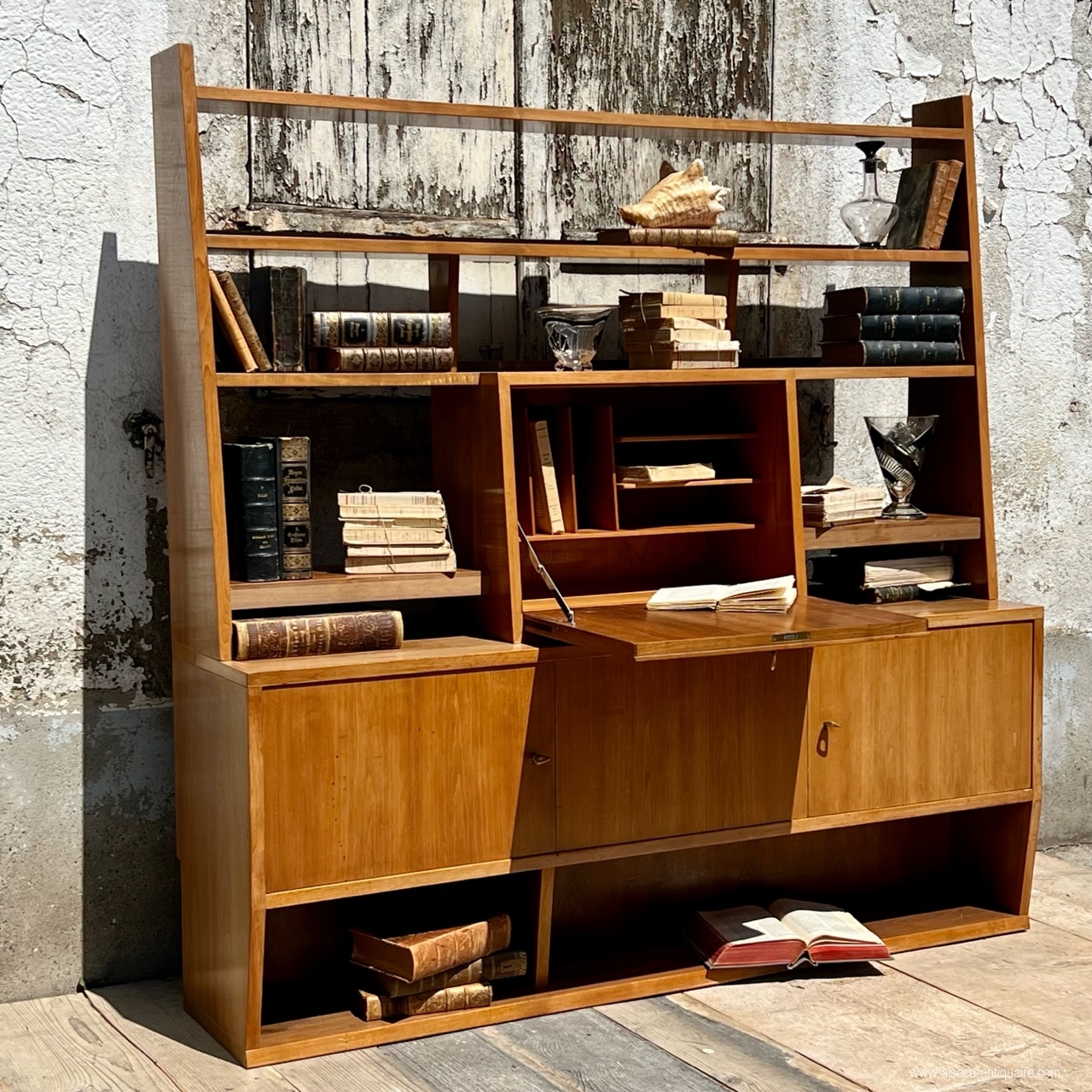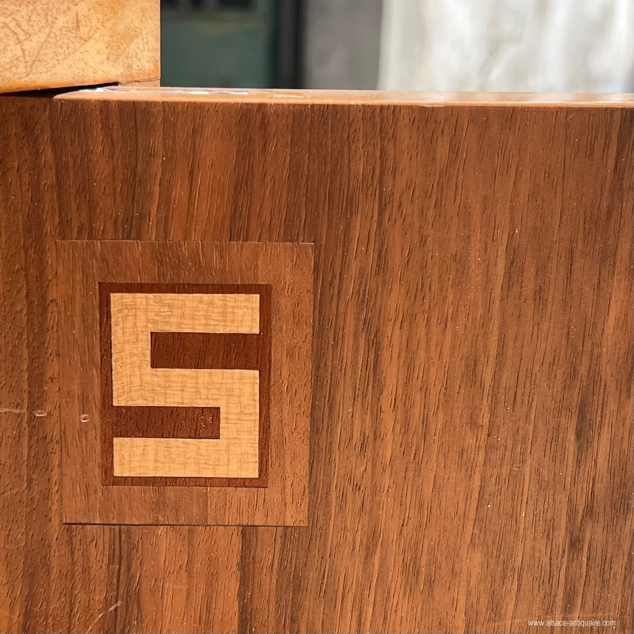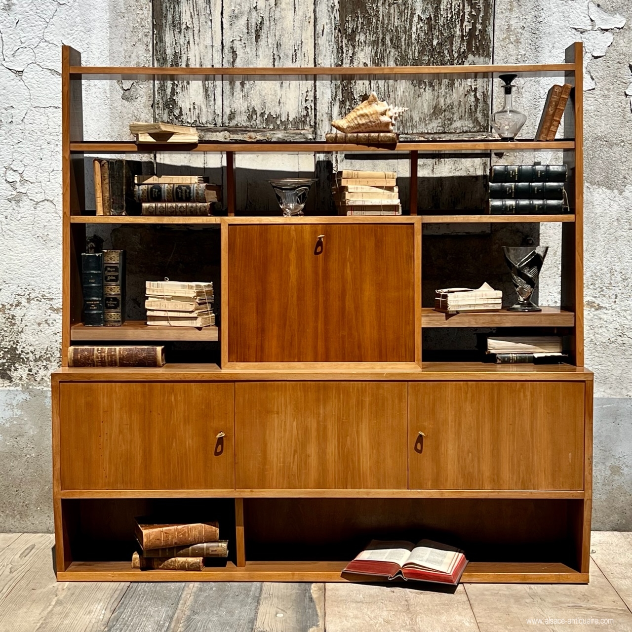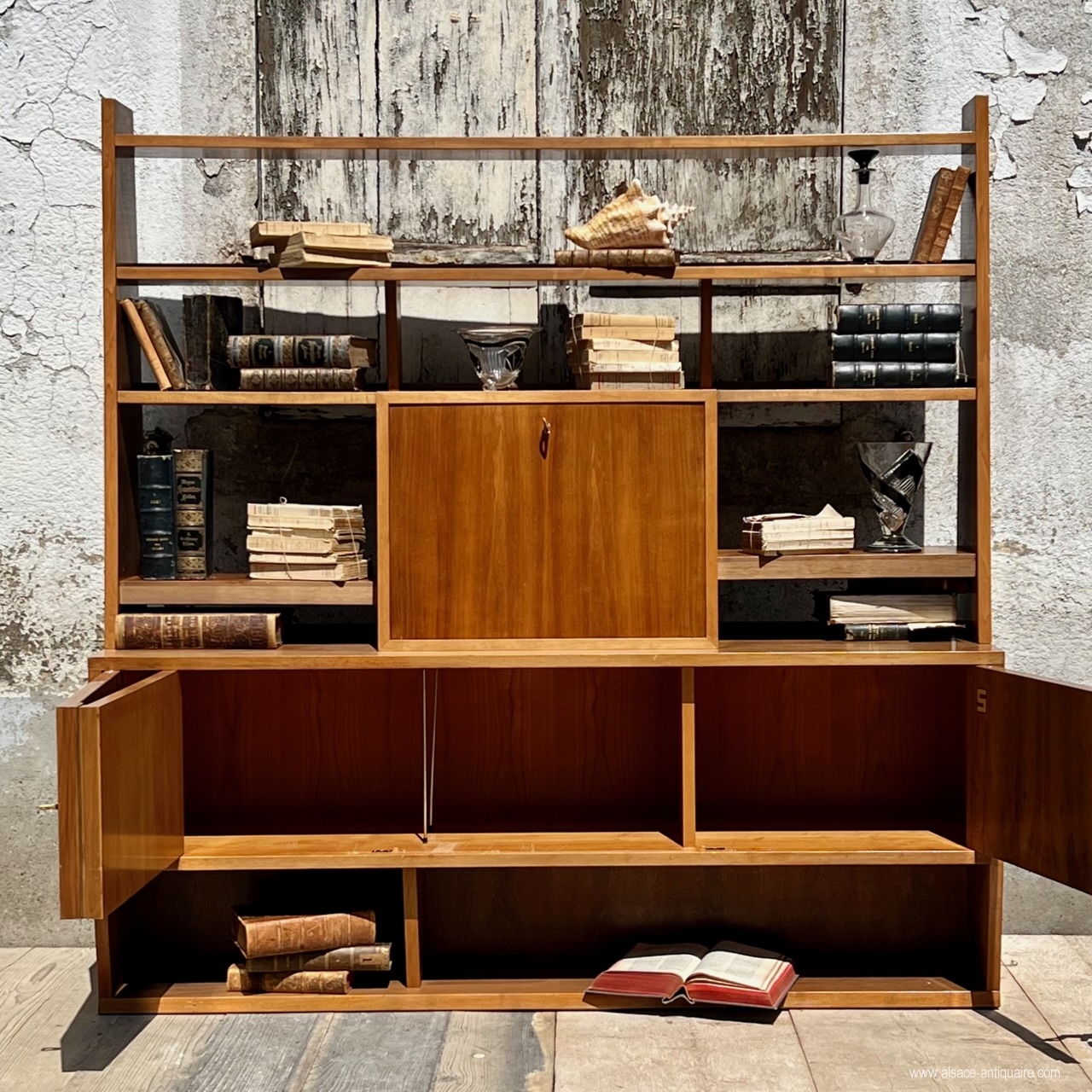 Scandinavian-style design for this original vintage piece of furniture. Sideboard in the lower part with a clever system of folding doors allowing an overall view of the storage space. In the center a flap revealing a layout of small régal , acting as a secretary, the rest of the furniture is composed of shelves allowing use in a library. The piece of furniture is well designed with a bias on the sides allowing to refine the volume in lateral vision. The piece of furniture bears a signature by a logo inlaid on the internal face of one of the doors with an "S"