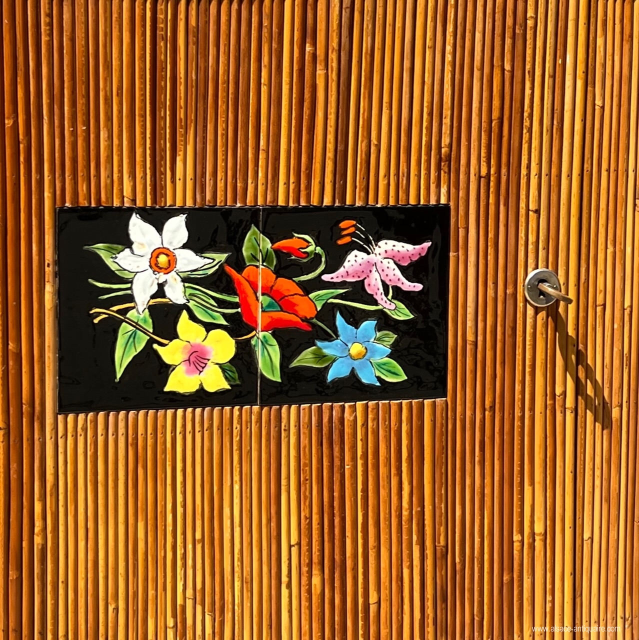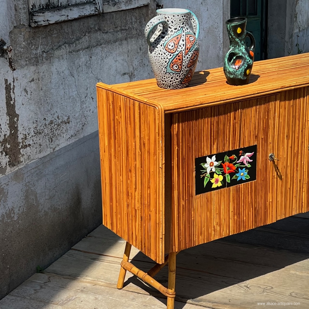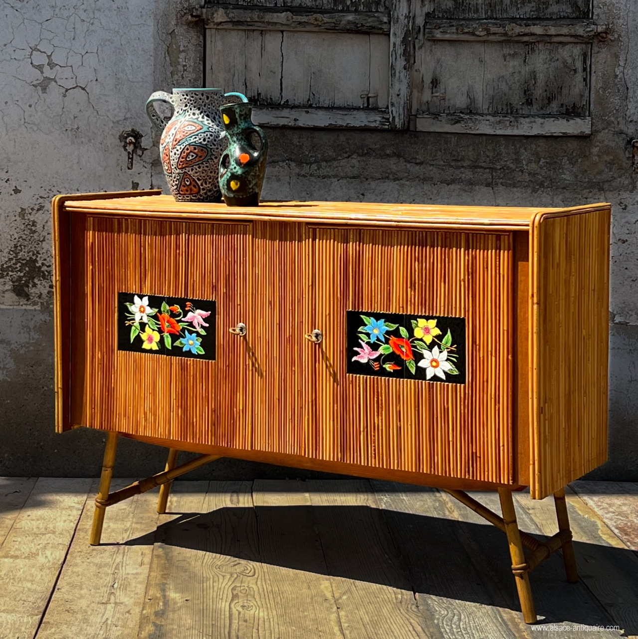 Vintage buffet, covered in Bamboo with ceramic inserts, a rare and pleasant model for a successful veranda atmosphere. Manufacturing from the 1960s.