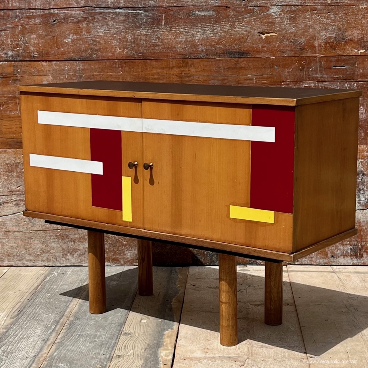 Design inspired by the creations of Charlotte Perriand for this vintage two-door sideboard dating from the 1960s. Beautiful decoration inlaid with pieces of red, white and yellow laminate on a light wood background, black laminate top set with a peripheral wooden border, original base with cylindrical barrels in turned wood.