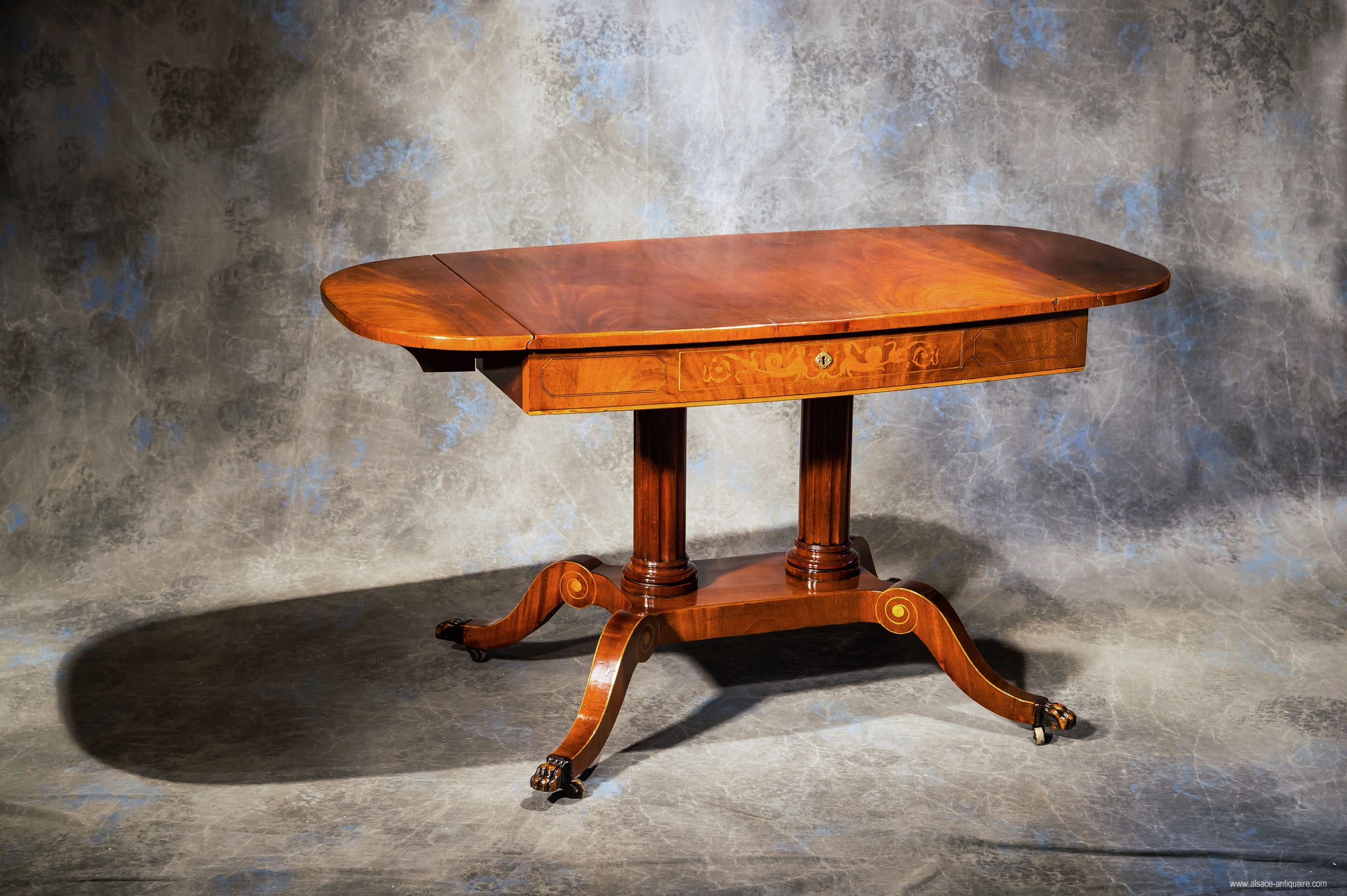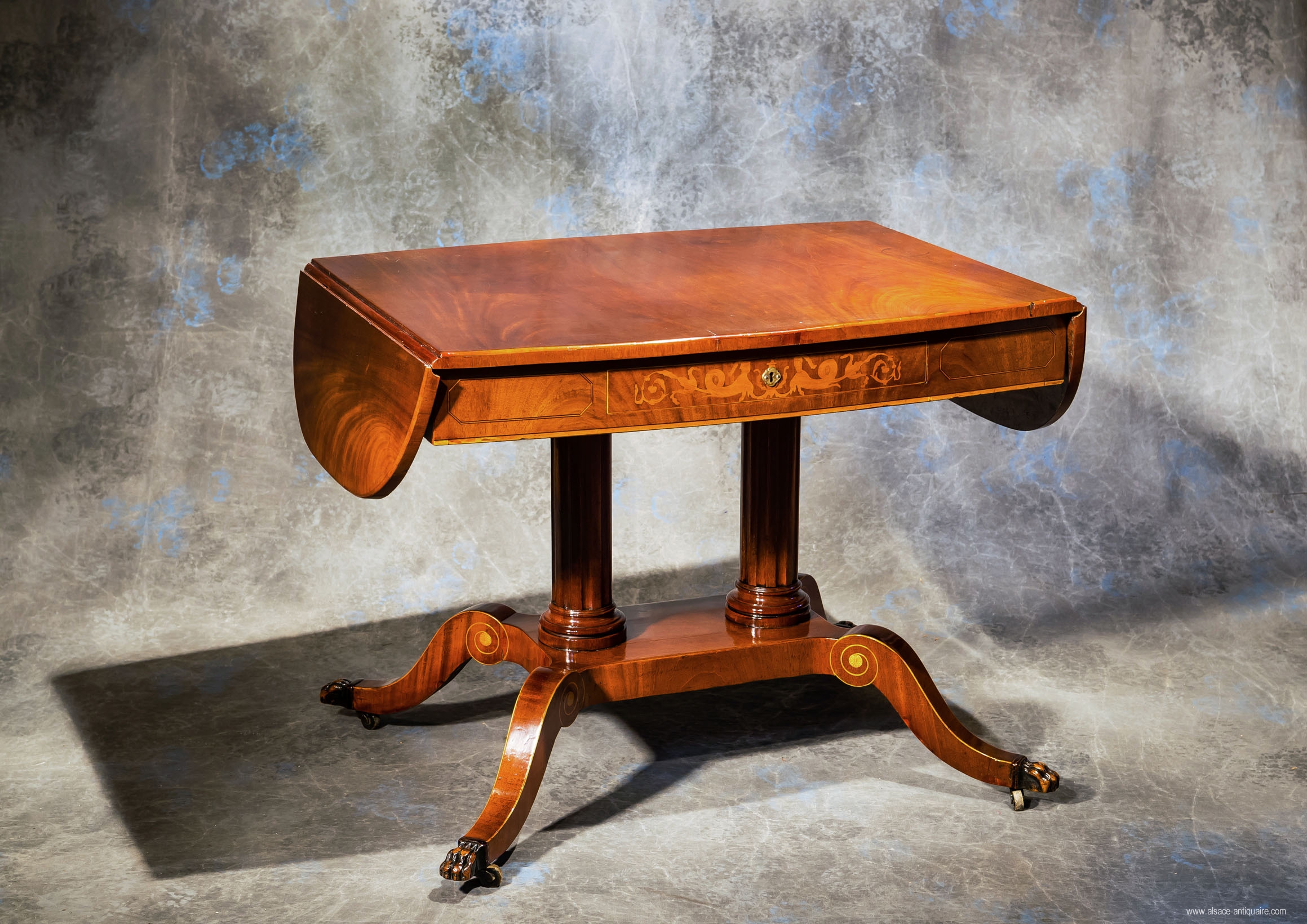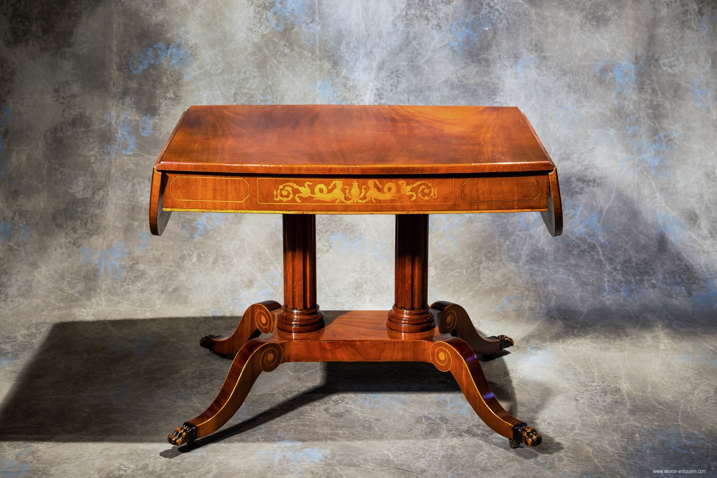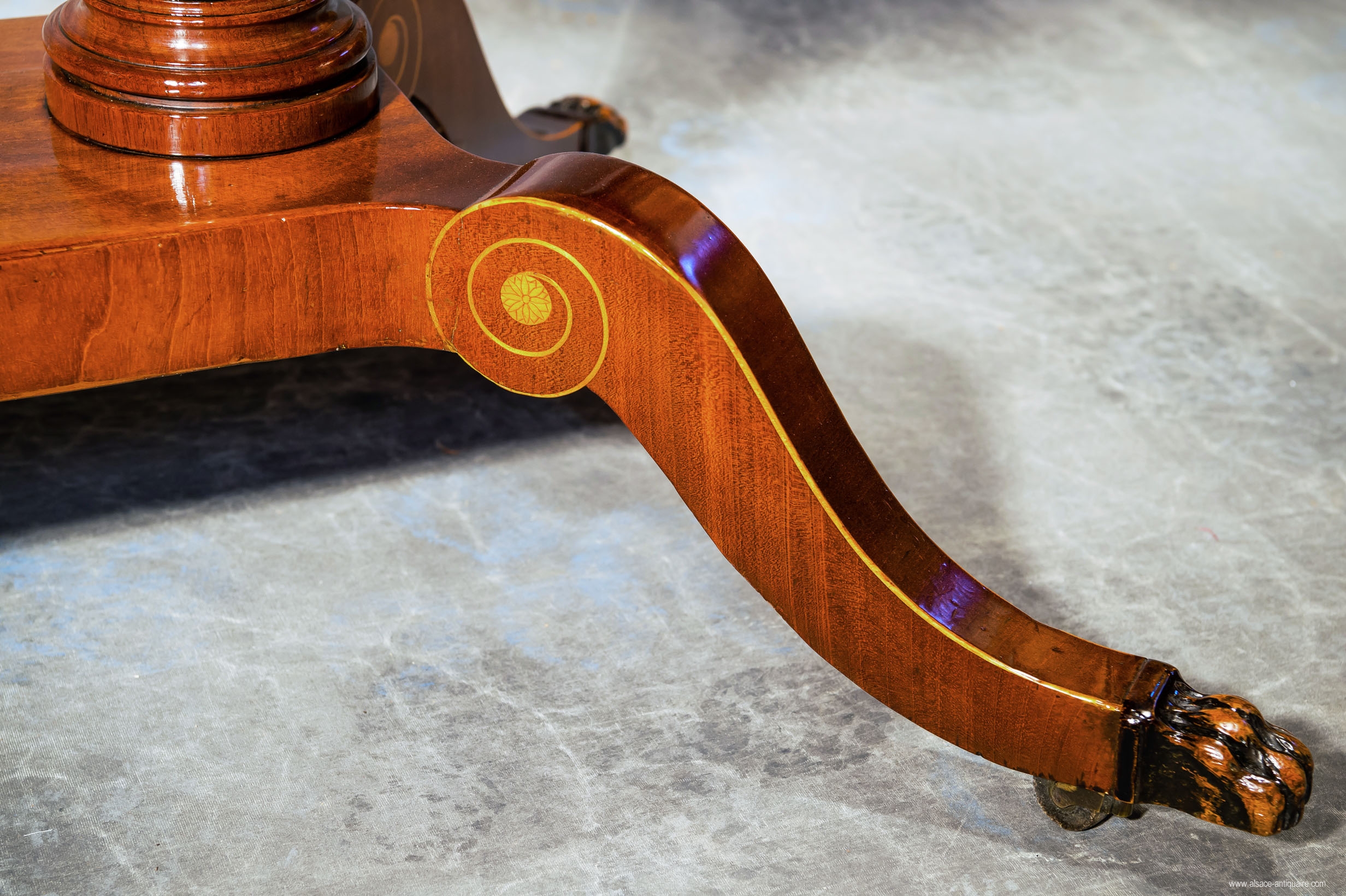 Mahagony desk with maple inlay on oak foundation, decorated with rosaces, curlicue foliage, nettings, Nordic mythology characters and chimeras. Its curved tray lays on a double fluted columns central leg support as well as 4 consoles with scrolls whom the 4 arms are ended with a claw of wildcat. Nordic countries work, from Danemark made in mahagony, maple, beech in the XIX th century.