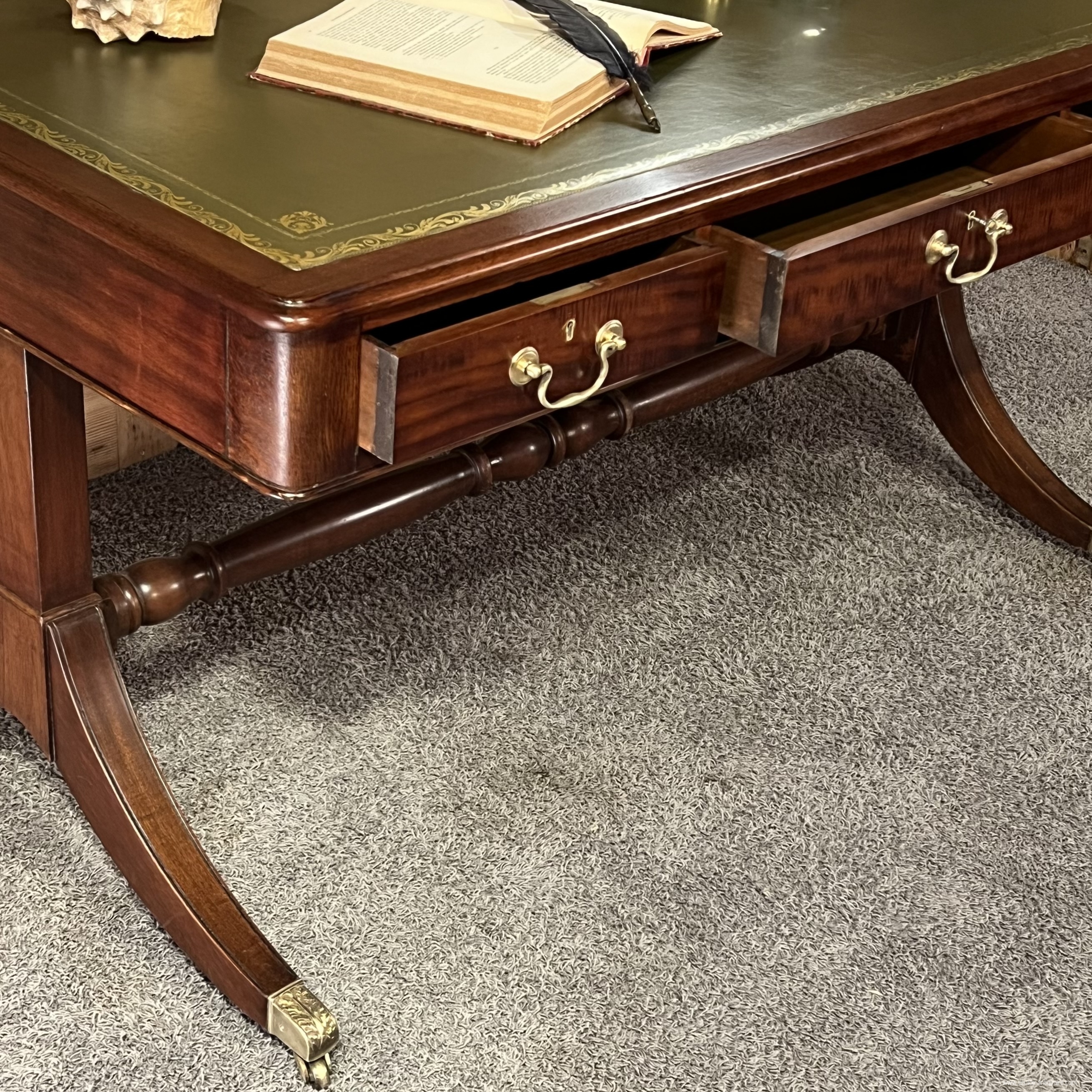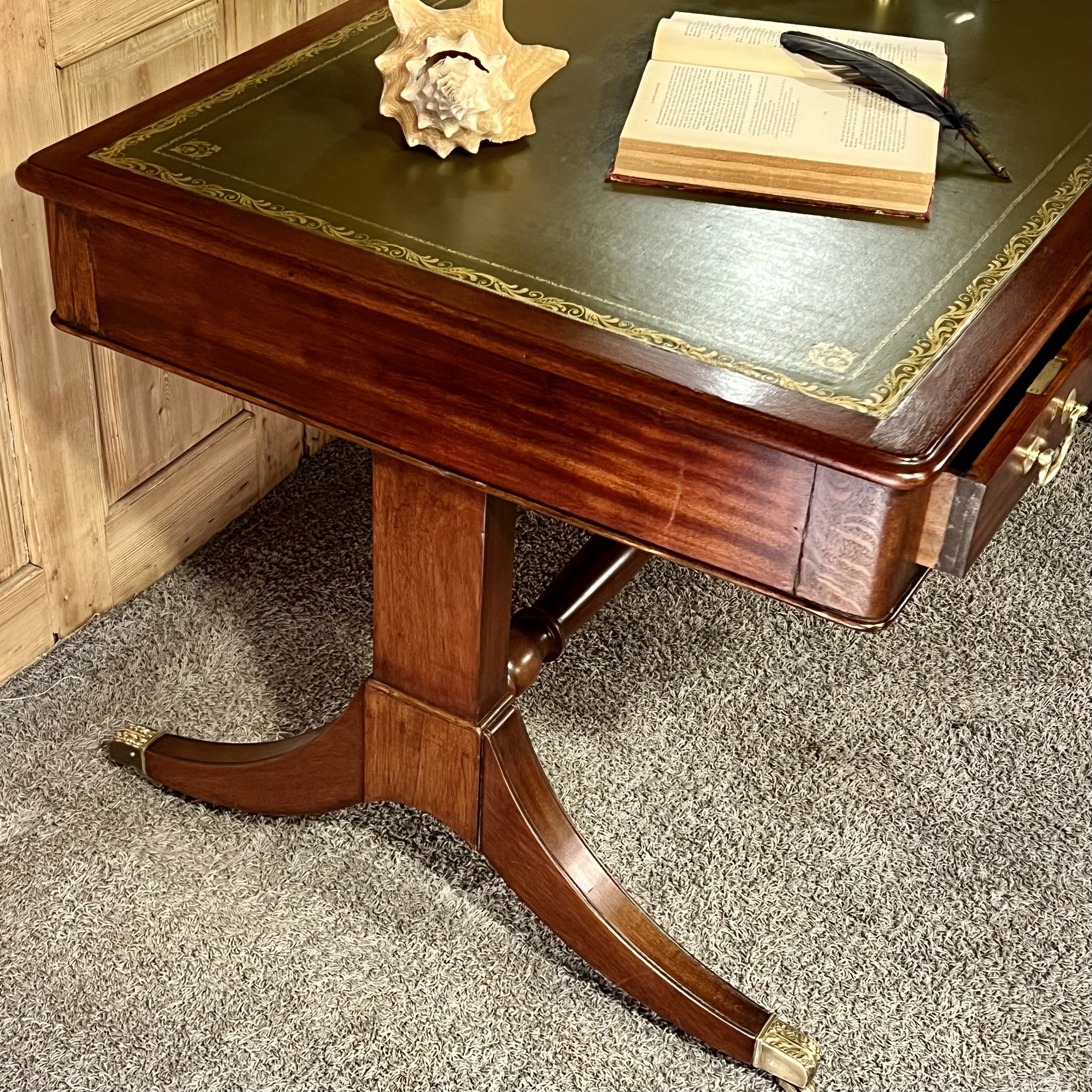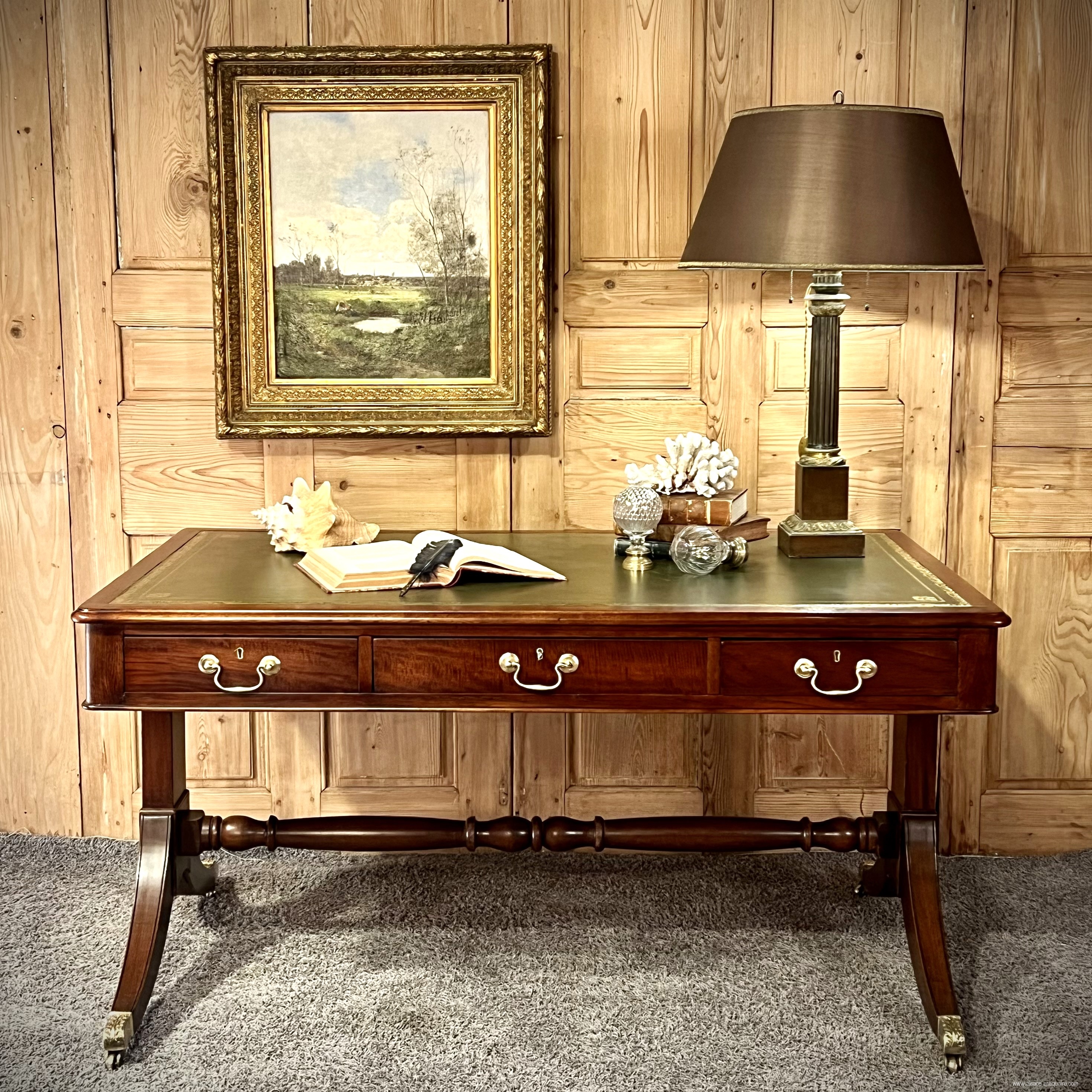 Elegant English Regency style mahogany desk with leather top. The base is made up of two columns supported by a curved leg, these resting on the ground by an ornate lion's claw type shoe, in bronze incorporating a caster, the bases are connected together by a turned wooden crosspiece. The desk opens with three belt drawers with a lock and fitted with bronze drop handles. The aesthetic of the main facade is reproduced on the reverse, on the visitors' side, with three simulated drawers. The top is covered in green leather with gold vignette and stamped motifs in the corners. Dimensions 148 cm x 88 cm x H 76.5 cm. Decorative accessories, desk lamps and objects can be offered for sale on request. delivery possible, please contact us
