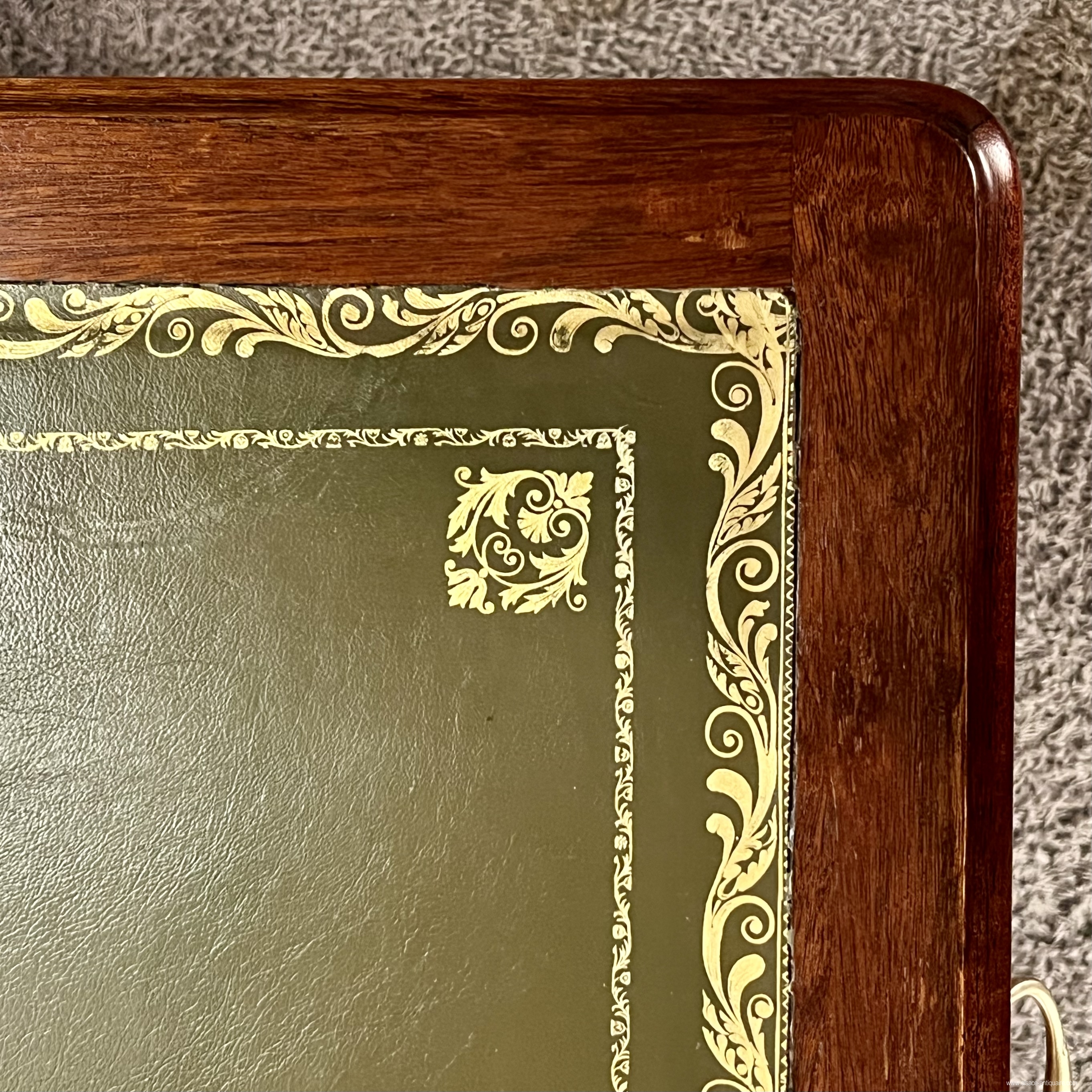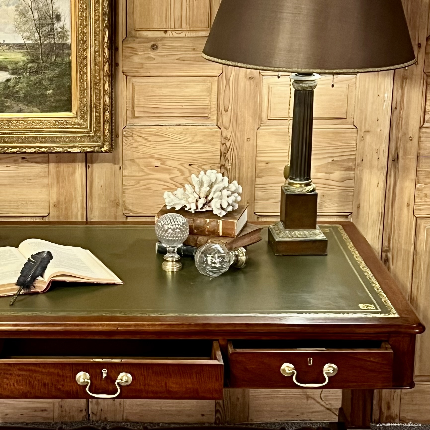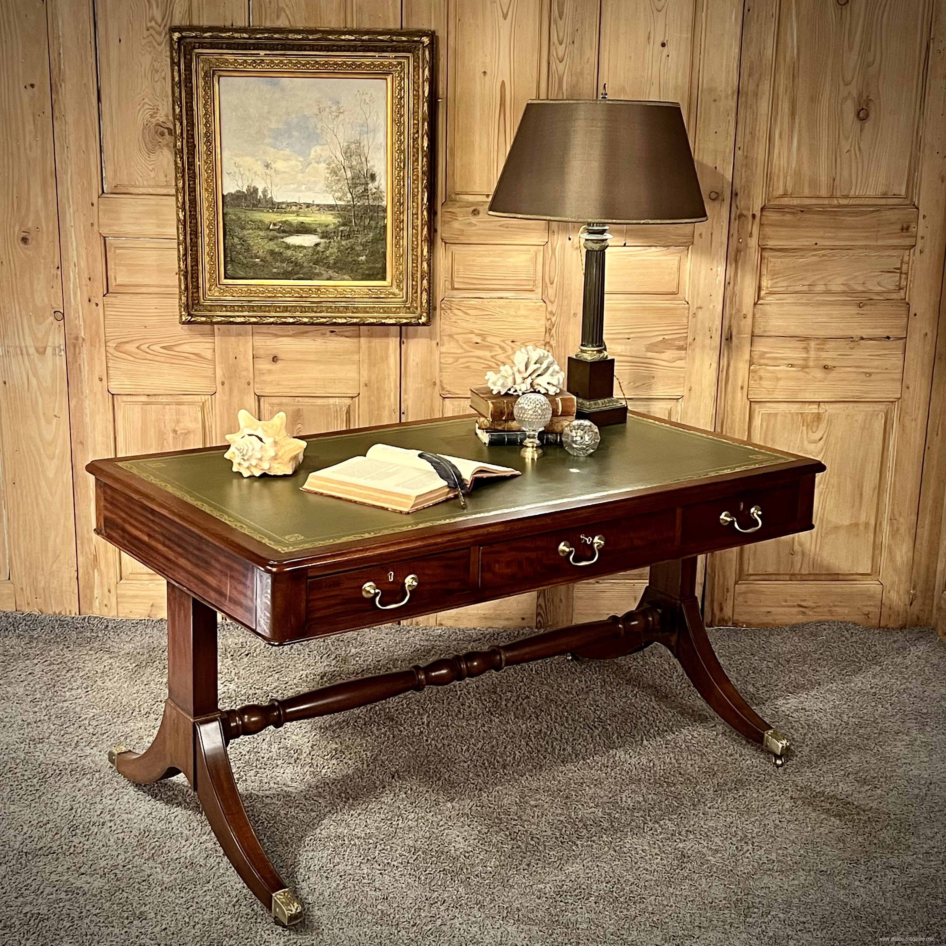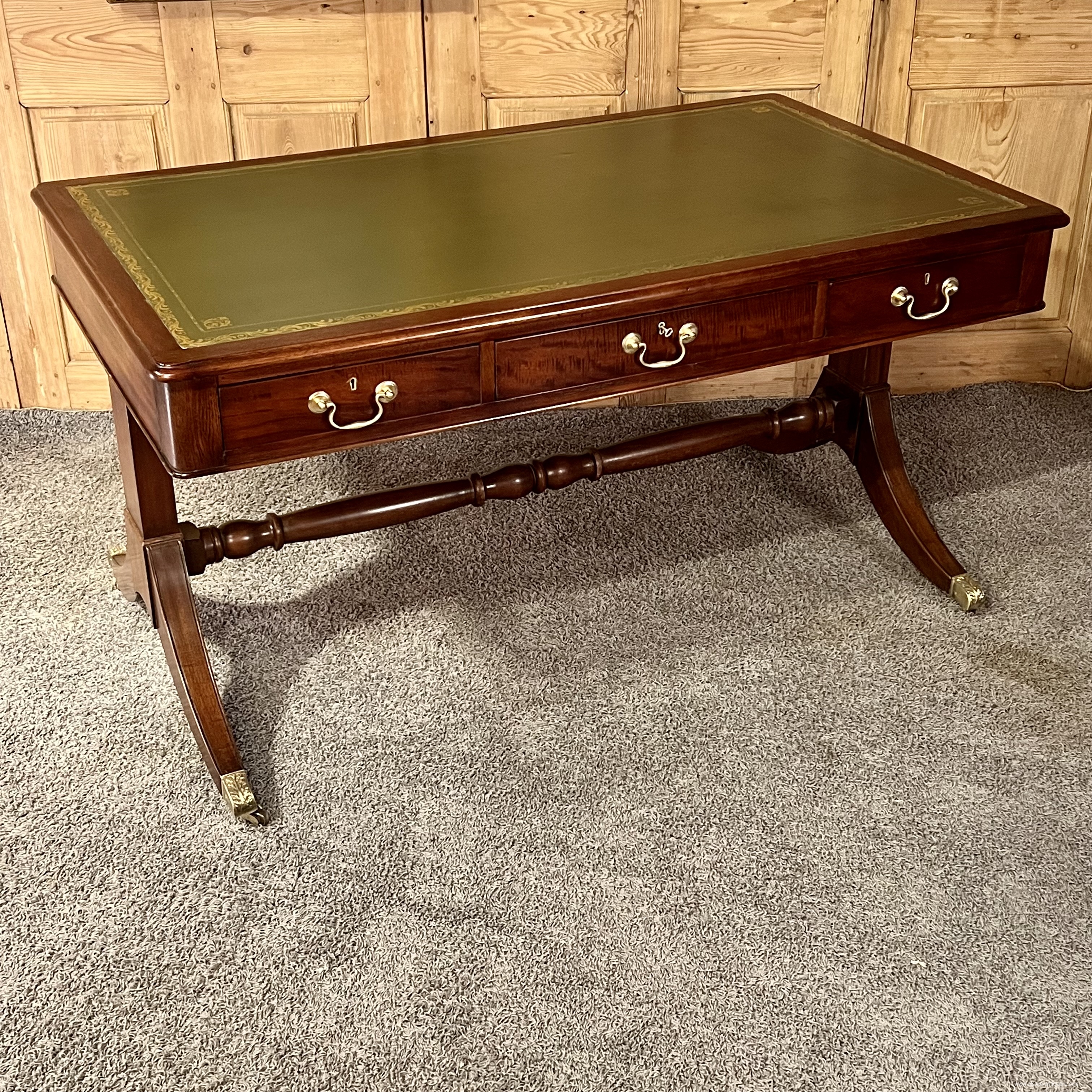 Elegant English Regency style mahogany desk with leather top. The base is made up of two columns supported by a curved leg, these resting on the ground by an ornate lion's claw type shoe, in bronze incorporating a caster, the bases are connected together by a turned wooden crosspiece. The desk opens with three belt drawers with a lock and fitted with bronze drop handles. The aesthetic of the main facade is reproduced on the reverse, on the visitors' side, with three simulated drawers. The top is covered in green leather with gold vignette and stamped motifs in the corners. Dimensions 148 cm x 88 cm x H 76.5 cm. Decorative accessories, desk lamps and objects can be offered for sale on request. delivery possible, please contact us