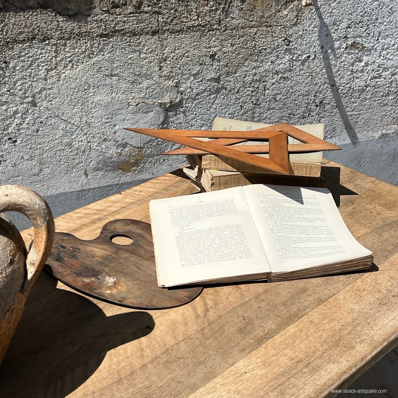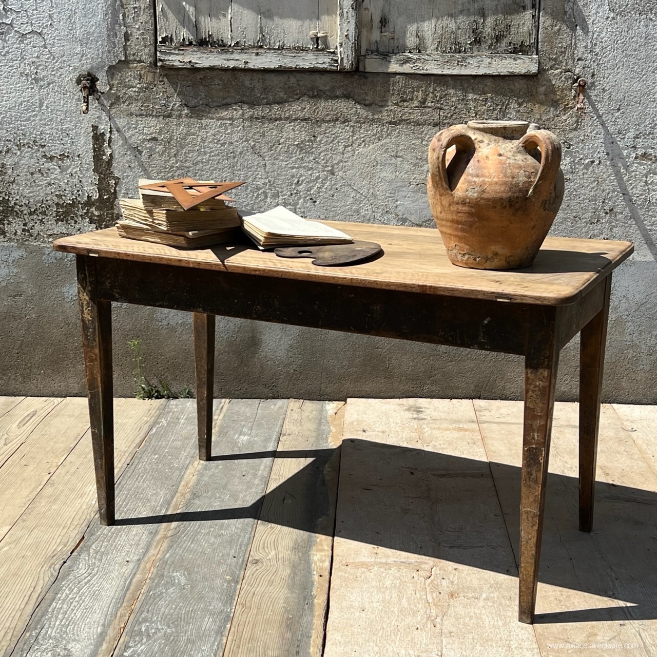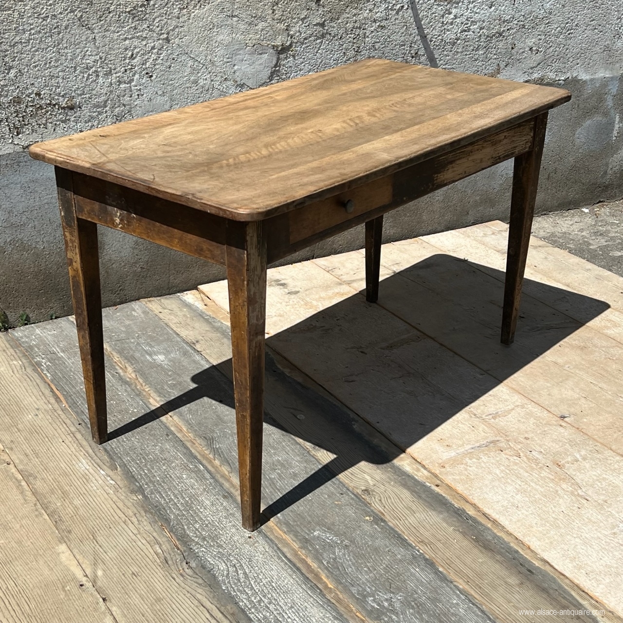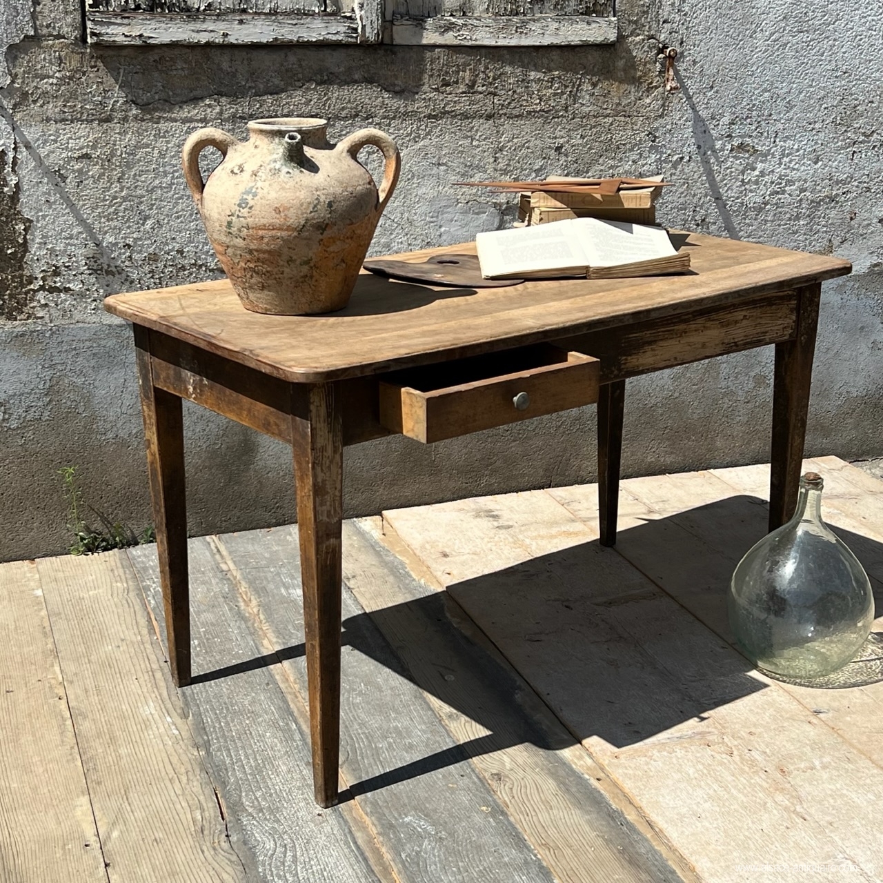 Beautiful proportions for this table which will serve as a console or a small desk. Ideal complement for a bedroom, an entrance or a living room. Feet in sheath, the frame is in walnut with an old patina and the top in raw natural walnut. A small side drawer, probably added later, harmoniously completes this pretty piece of furniture with a beautiful experience.