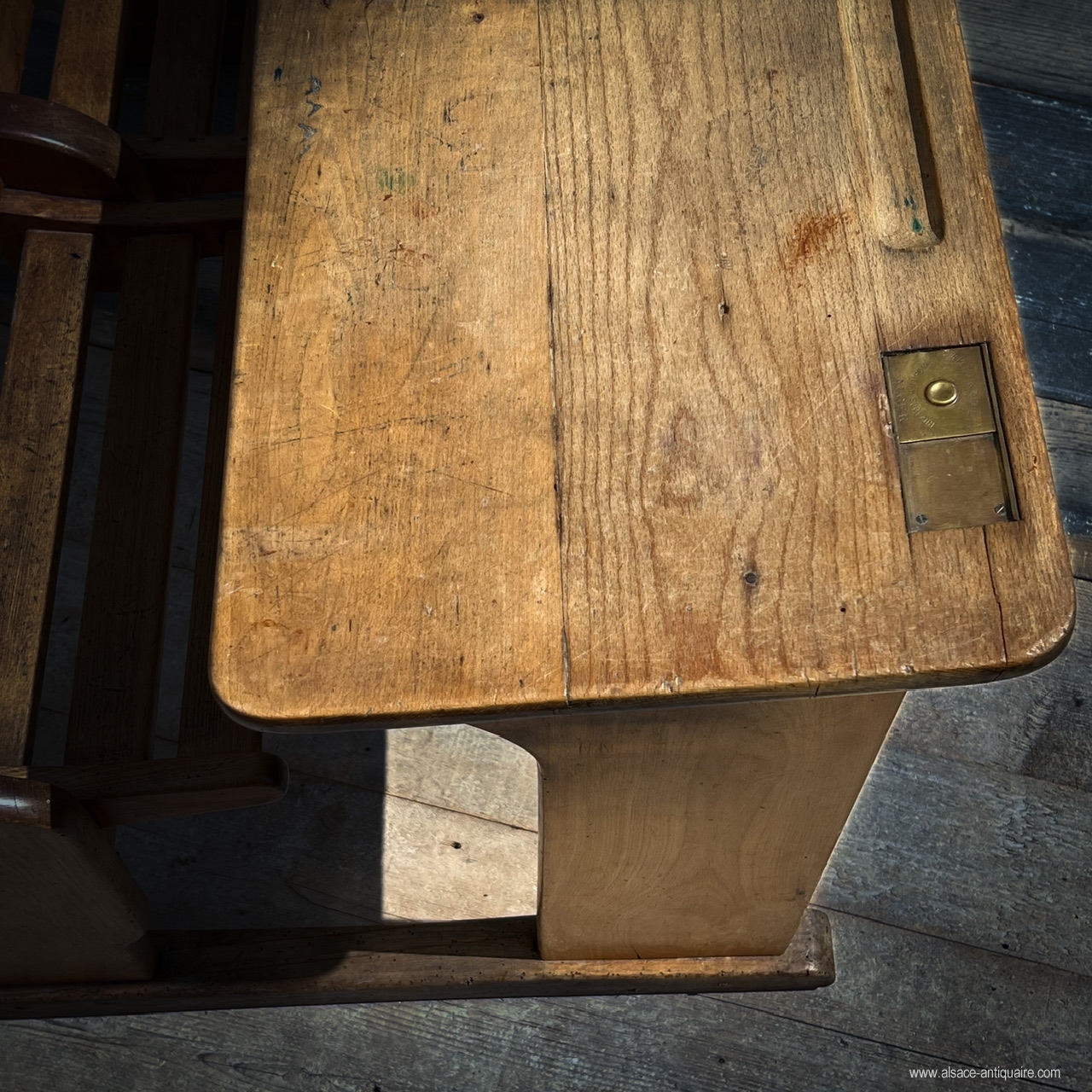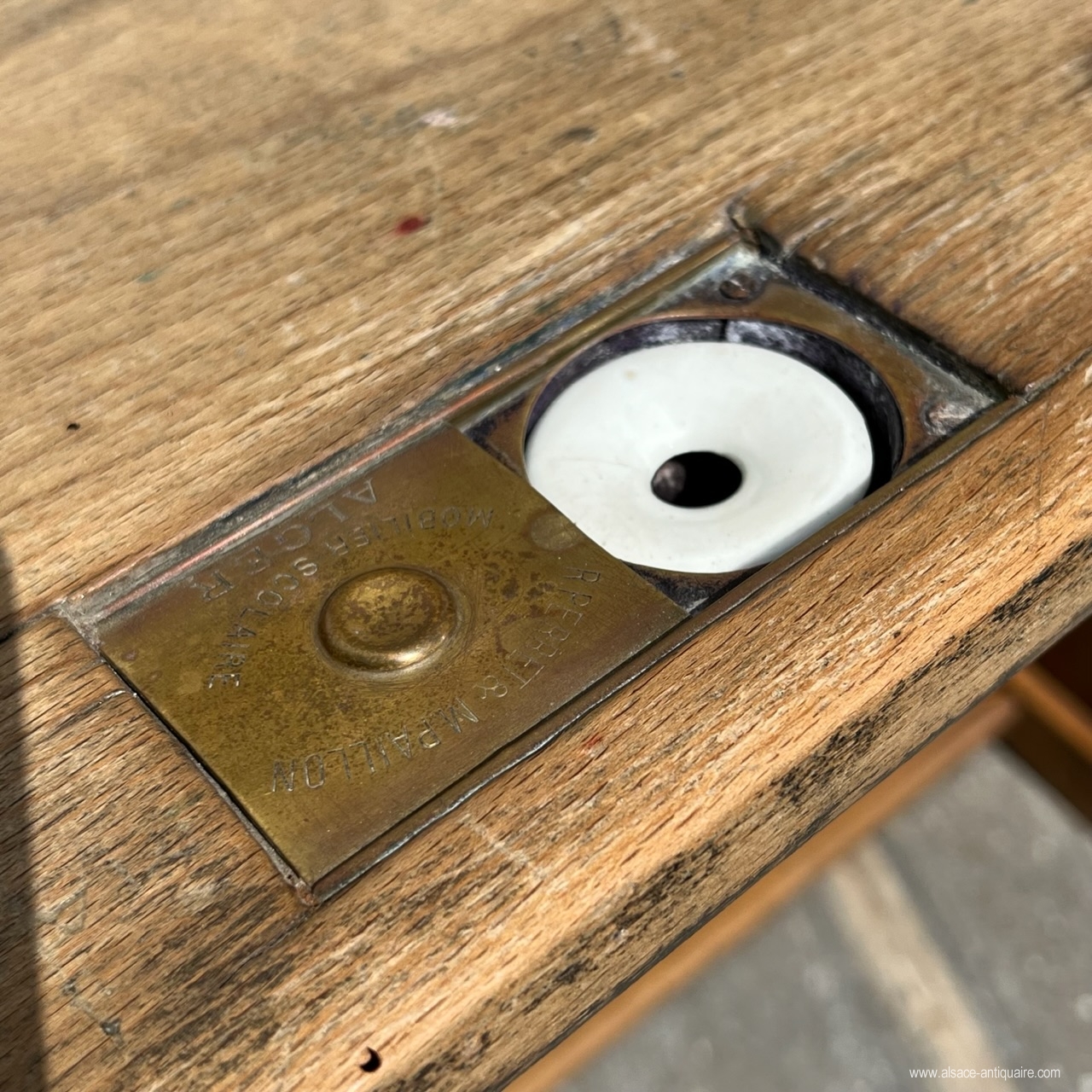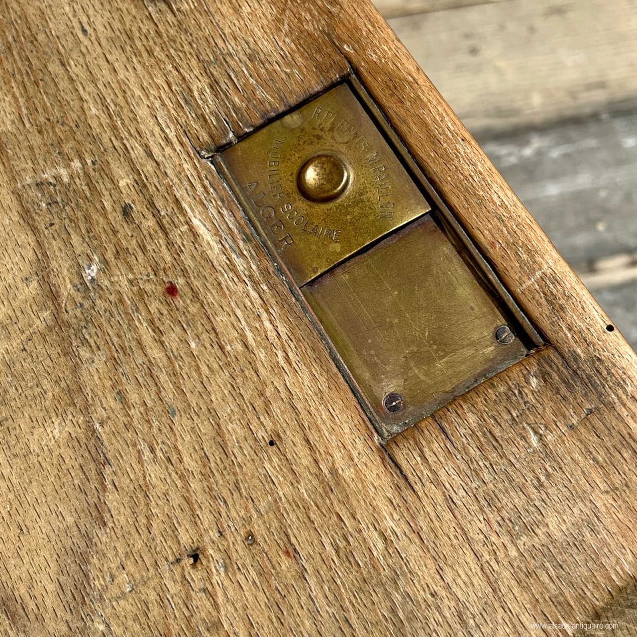 Ce bureau d’écolier double, bénéficie d’une très belle patine, les traverses sont bien usées attestant un usage important. Ensemble en bois massif de conception très robuste, les sièges sont avec des assises à claires voies redevables et pivotants sur deux axes avec support en bois, deux plumiers sont creusés dans le plateau , l’encrier est protégé par un boîtier en laiton avec couvercle coulissant découvrant un godet en porcelaine blanche, (il manque un des deux godets) sur le couvercle une marque de fabrique : Paillon mobiler pour école à Alger . Sous le plan de travail une étagère de rangement . Époque fin XIX ème