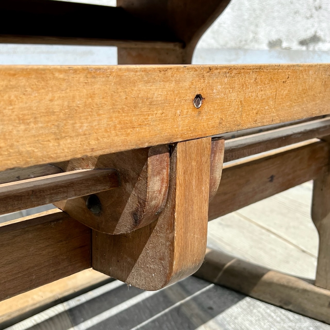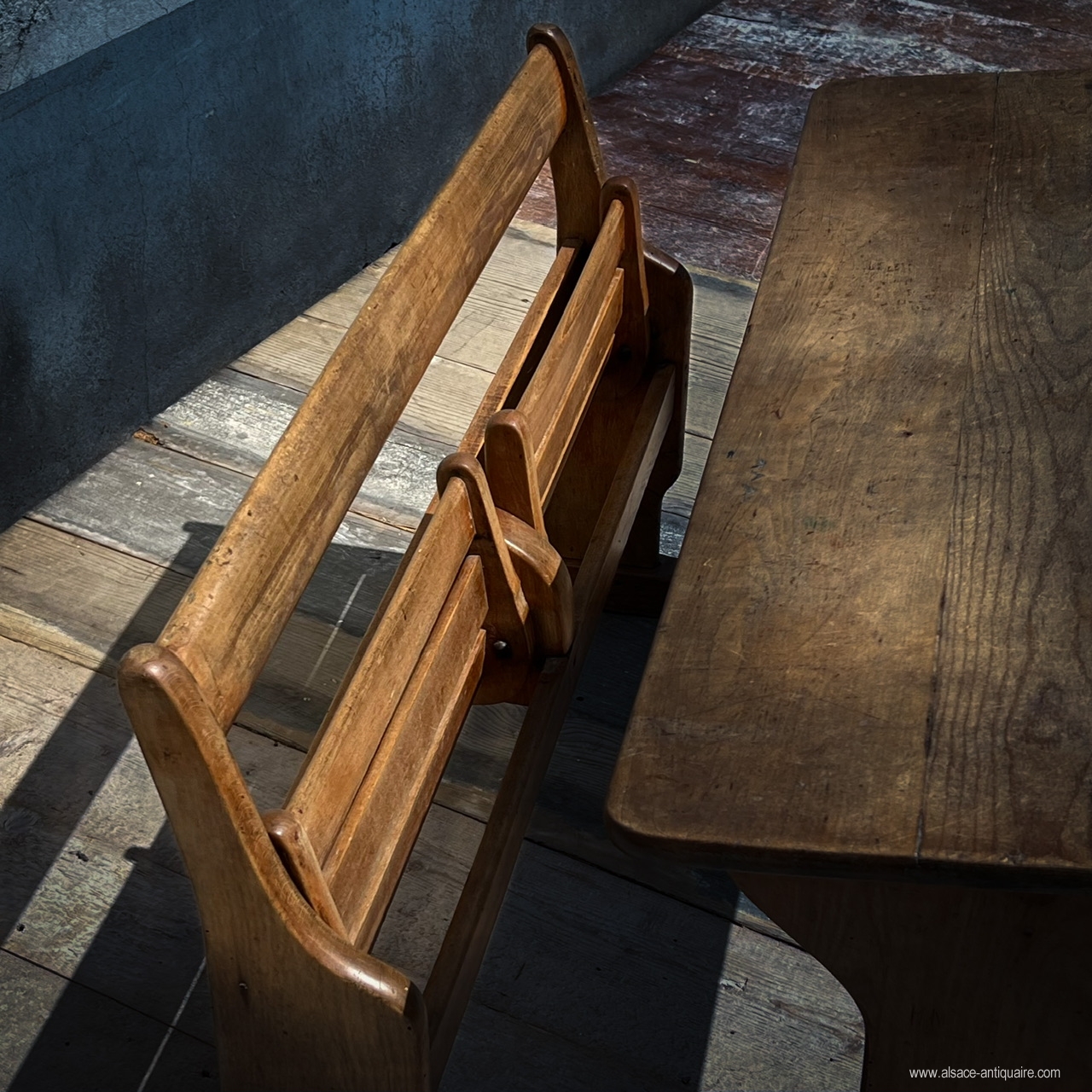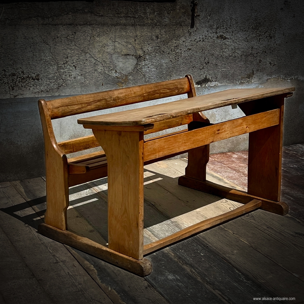 Ce bureau d’écolier double, bénéficie d’une très belle patine, les traverses sont bien usées attestant un usage important. Ensemble en bois massif de conception très robuste, les sièges sont avec des assises à claires voies redevables et pivotants sur deux axes avec support en bois, deux plumiers sont creusés dans le plateau , l’encrier est protégé par un boîtier en laiton avec couvercle coulissant découvrant un godet en porcelaine blanche, (il manque un des deux godets) sur le couvercle une marque de fabrique : Paillon mobiler pour école à Alger . Sous le plan de travail une étagère de rangement . Époque fin XIX ème