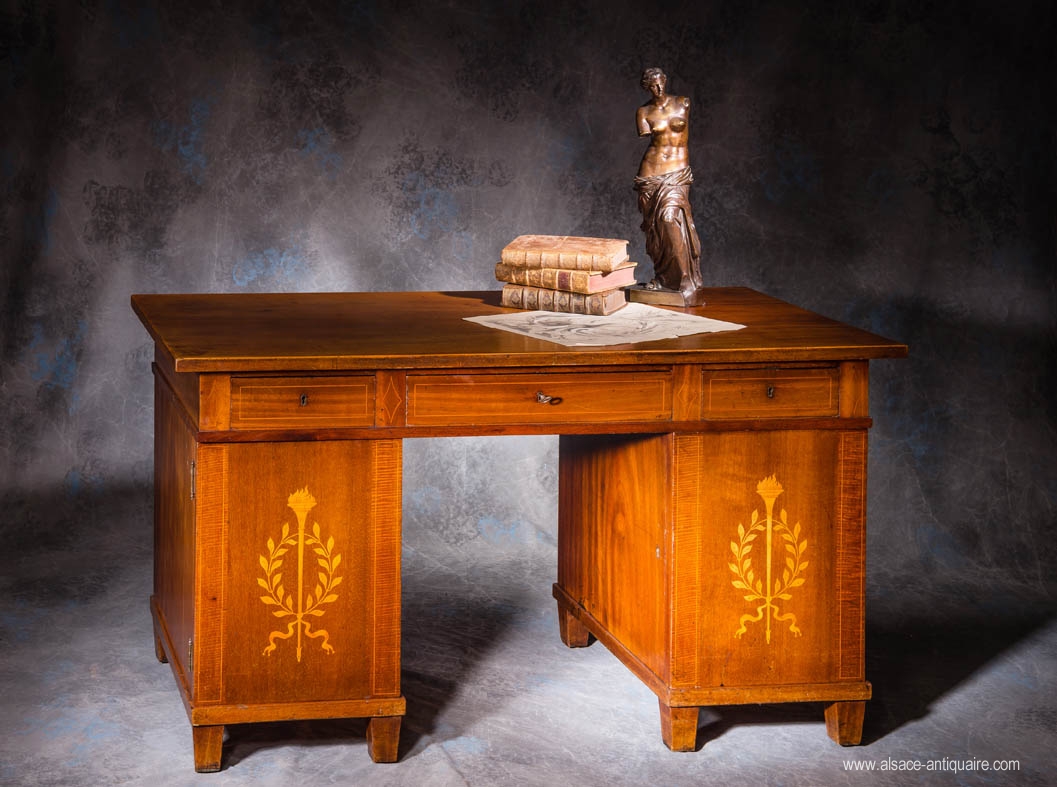This desk in mahogany is composed of three drawers and two doors which hide three other internal drawers and a shelf. Light wood inlay composed of laurel wreath and flare. This furniture is a double face whom one side is only covered of mahogany without any decoration. Nordic work, probably from Danemark or Sweden, which well matches with Directory, Consulate, Empire, Charles X or Louis Philippe styles.