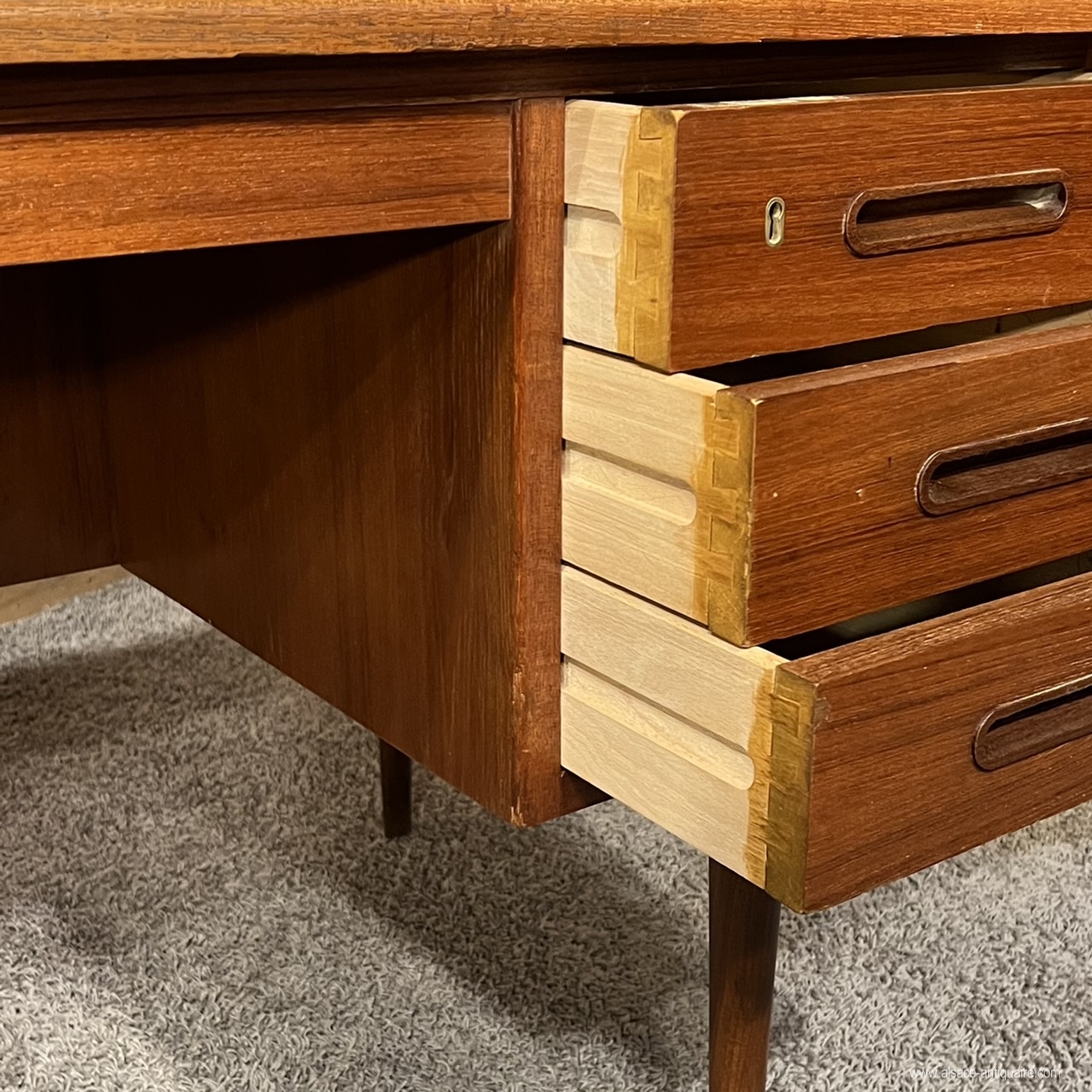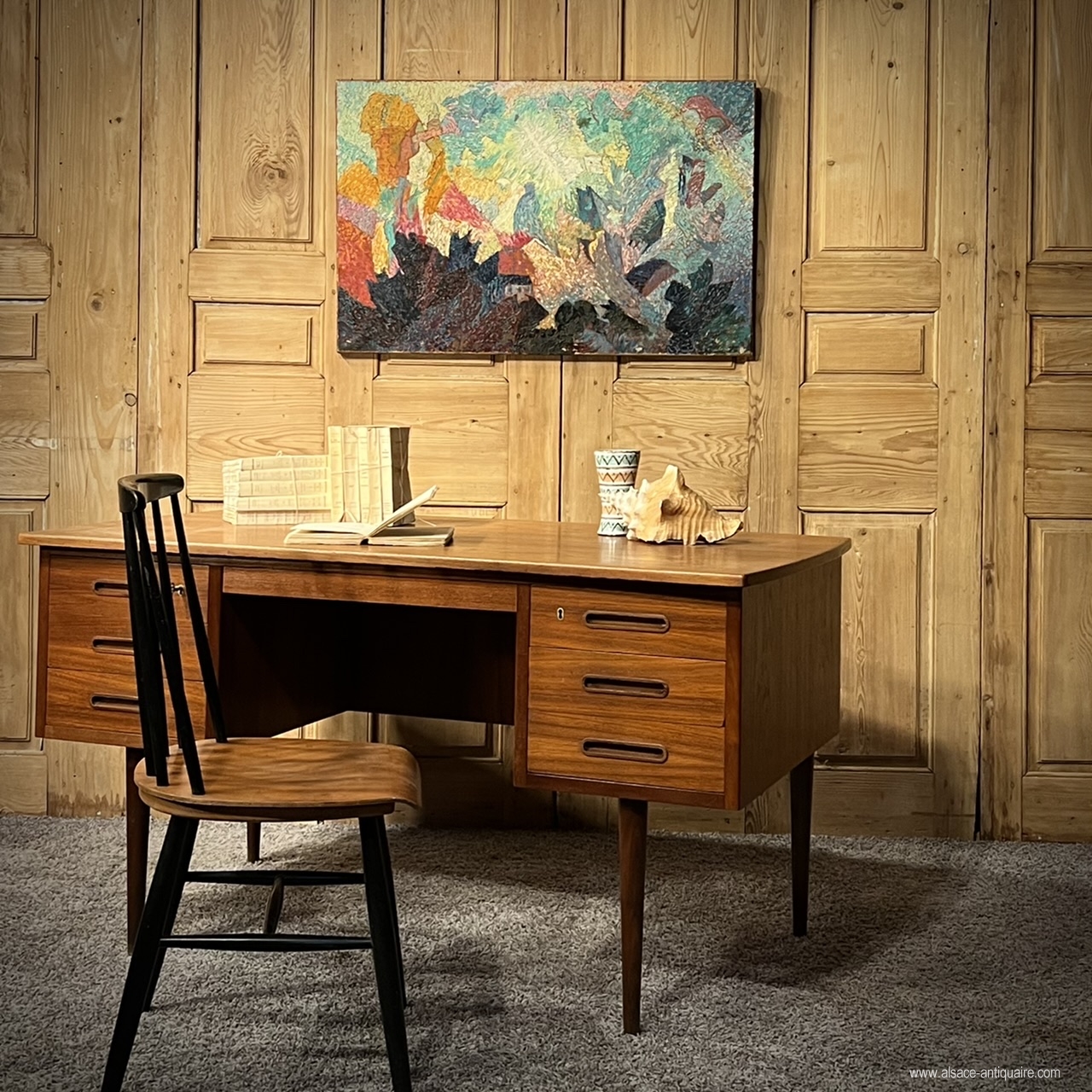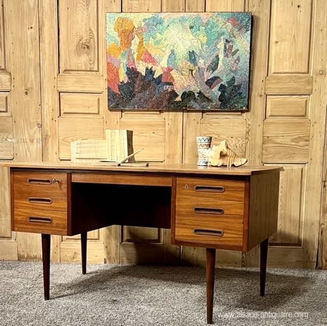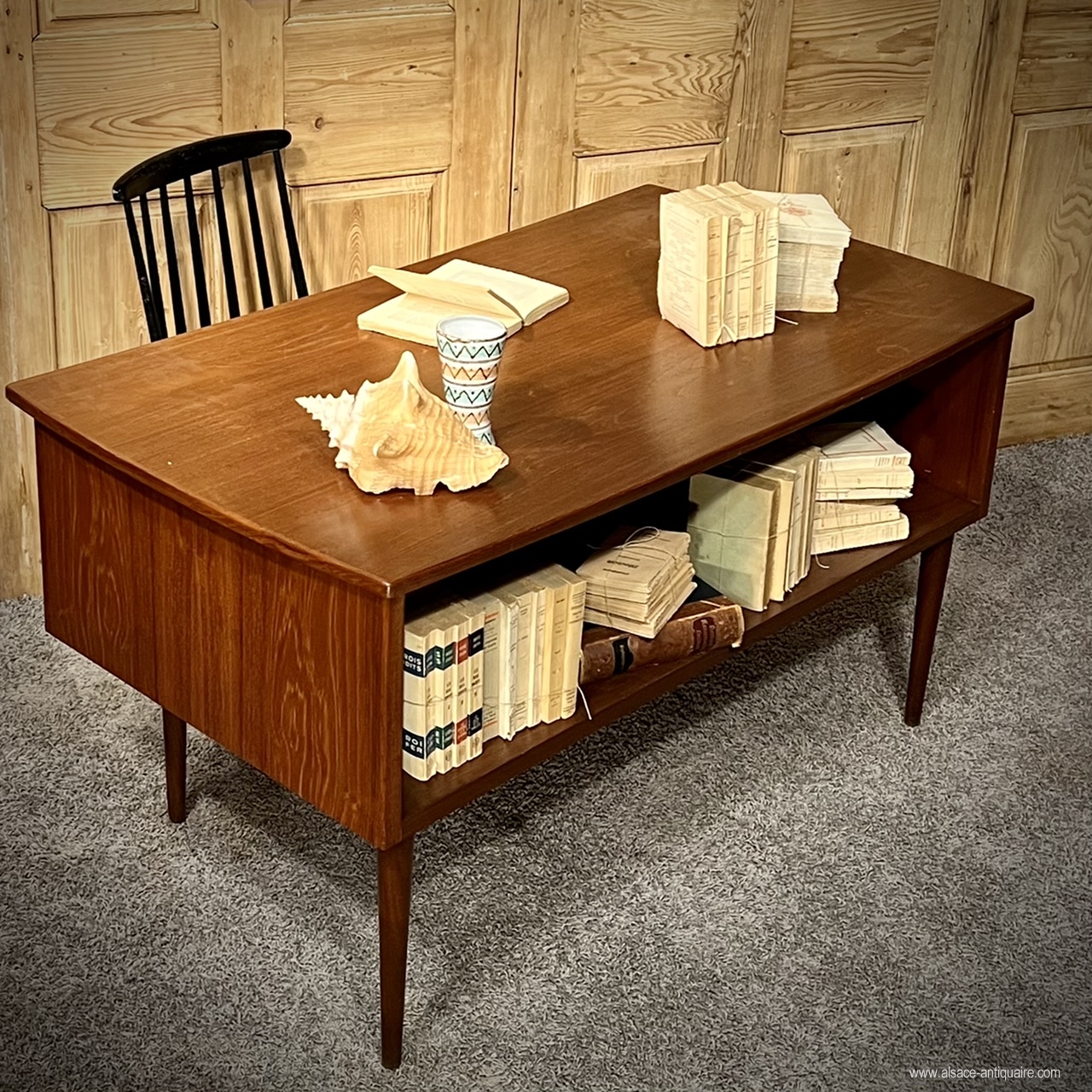 Original with its top with slightly curved sides, this desk from the 1960s/70s is also very functional: it opens with five drawers and has, on the visitor side, a housing over its entire width serving as a library or allowing to present Objects.