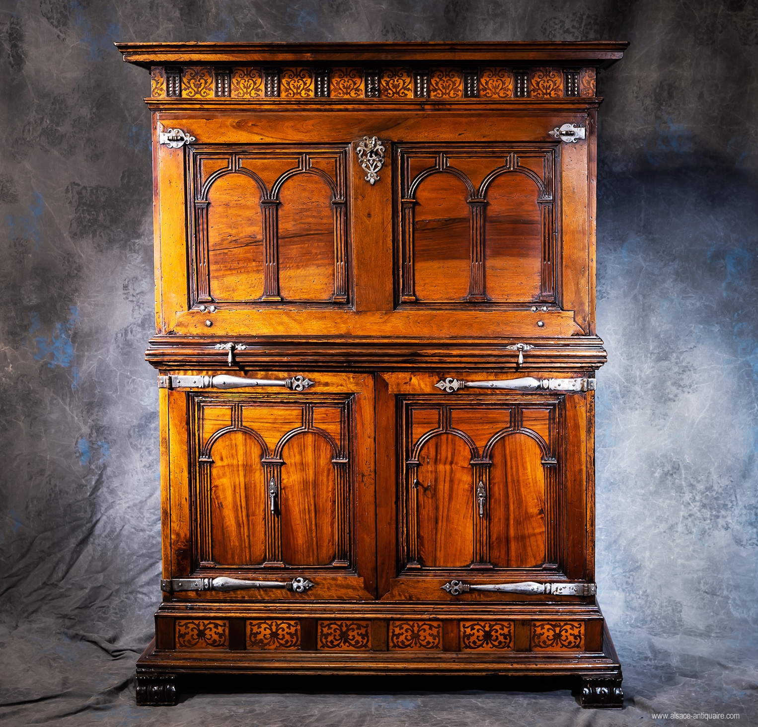Open, it lets us discover an arrangement with many drawers and gates covered with the same pattern of simulated ironwork as that present on the cornice and the plinth. This type of decor has also been used in Alsace and Switzerland and we will know where our cabinetmakers found their inspiration, we can cite as such the remarkable Renaissance dresser, with inlaid decor of Italian-inspired architectures, which can be found at the Mulhouse Historical Museum.