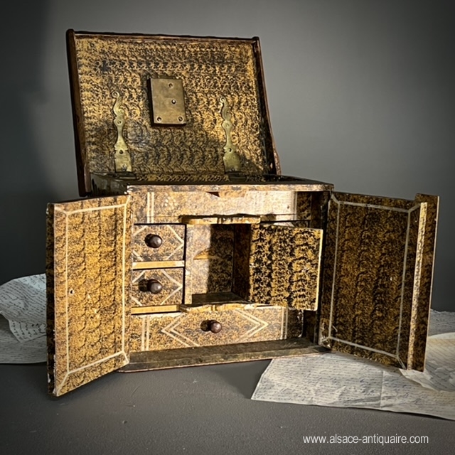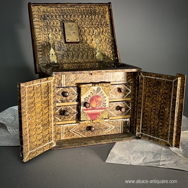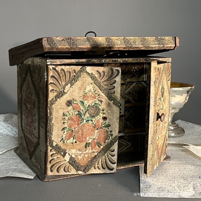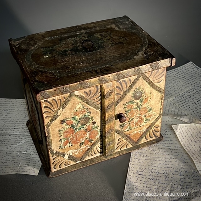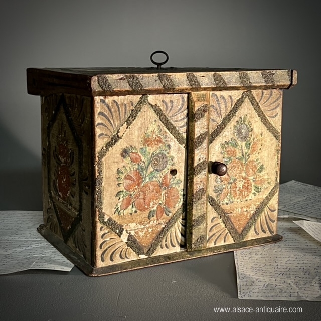 Courtesy box on the model of a small cabinet, rare example of popular art, southern Alsace or Switzerland, remember that our city of Mulhouse was an independent republic under Swiss protectorate until the end of the 18th century and that the style of furniture produced in our region is close to the Swiss decorative arts. This charming piece of furniture has adopted the principles of the cabinets diffused in the Rhine regions since the 16th century: a lifting top which blocks the opening of the two doors, these reveal a layout of small drawers, a small theater whose bottom is retractable and reveals two other small drawers. Polychrome floral decoration, on which it is necessary to note some wear.