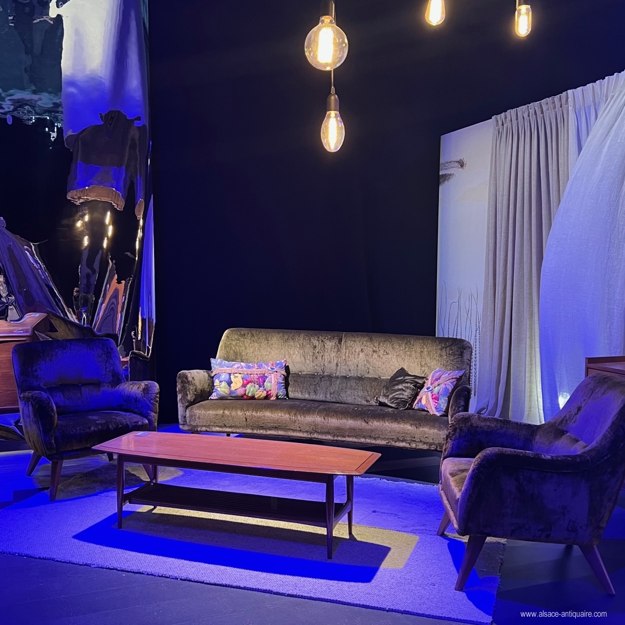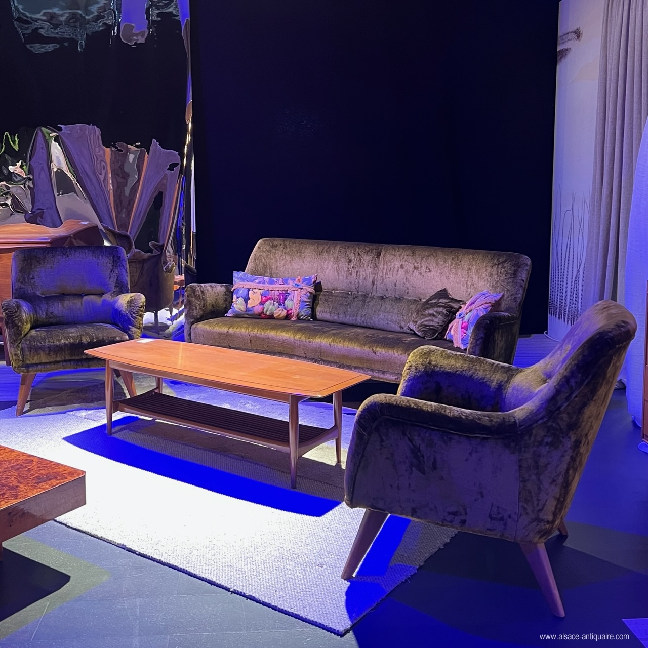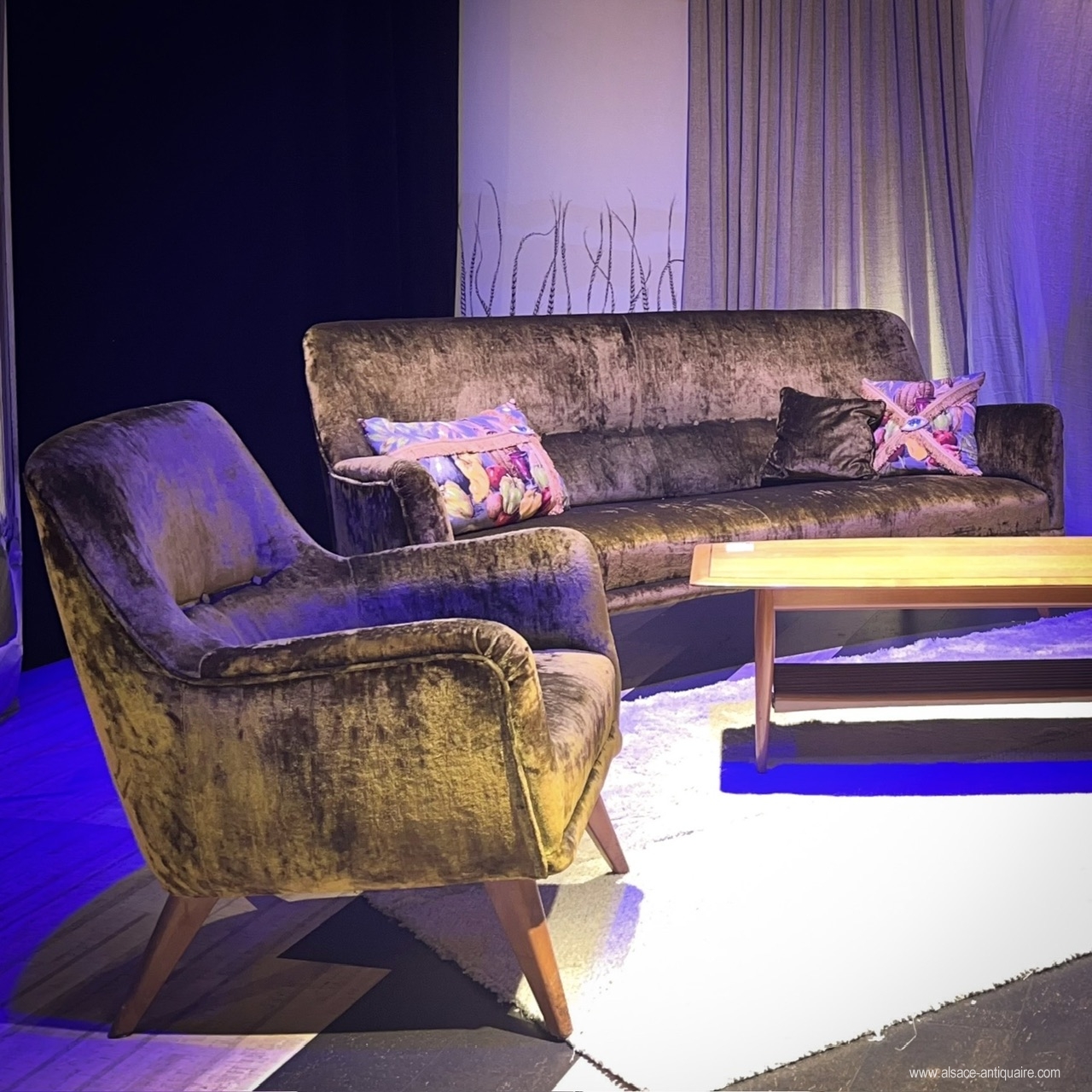 Beautiful design for this vintage living room set. The 3-seater sofa is slightly curved, the sofa and the two armchairs rest on small natural wooden legs, the set is padded with seat and back in bronze green velvet, vintage and in very good condition. Around the mid 1960s.