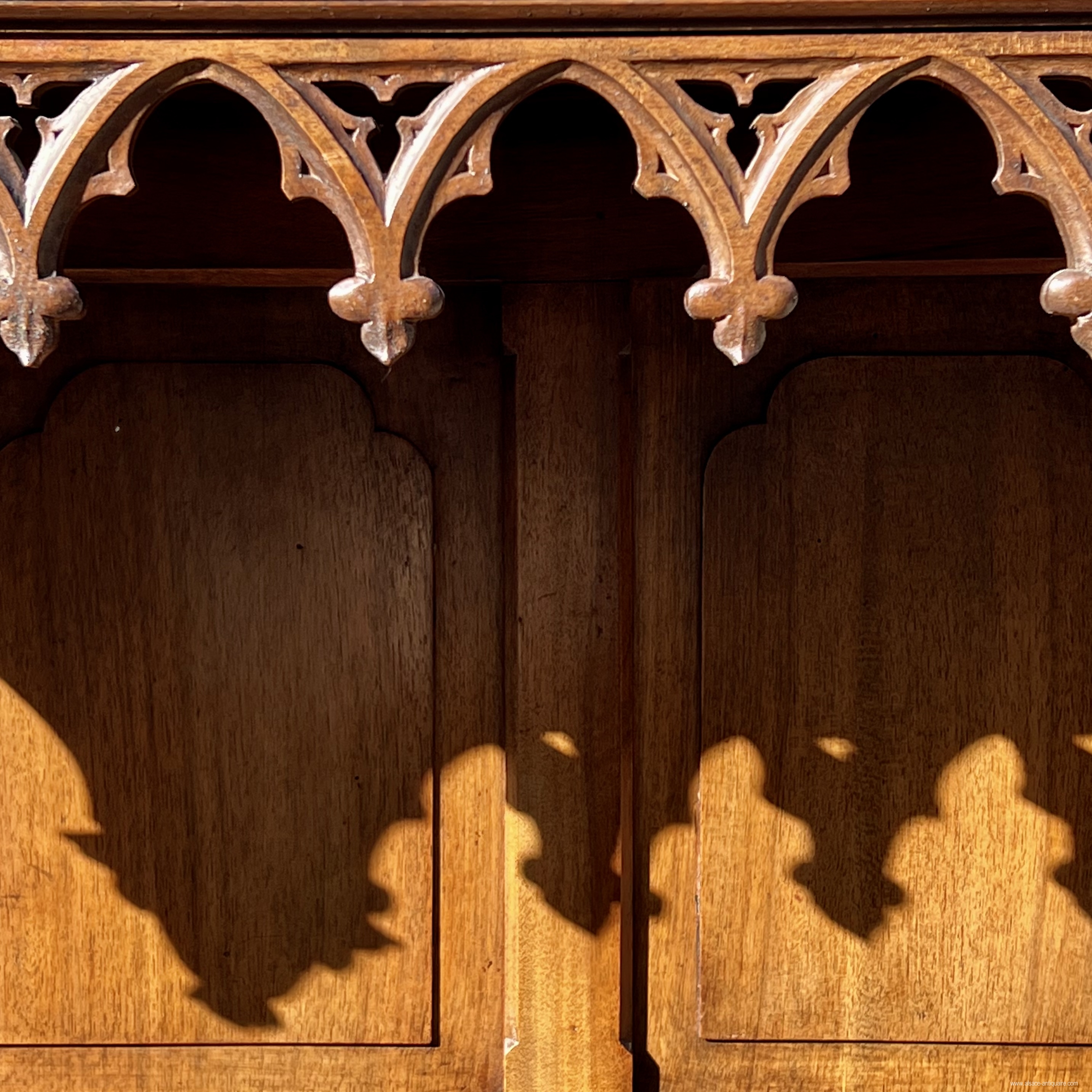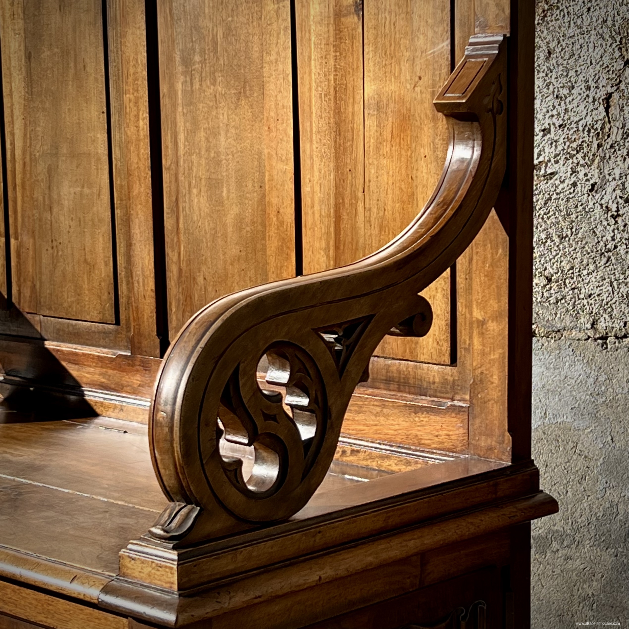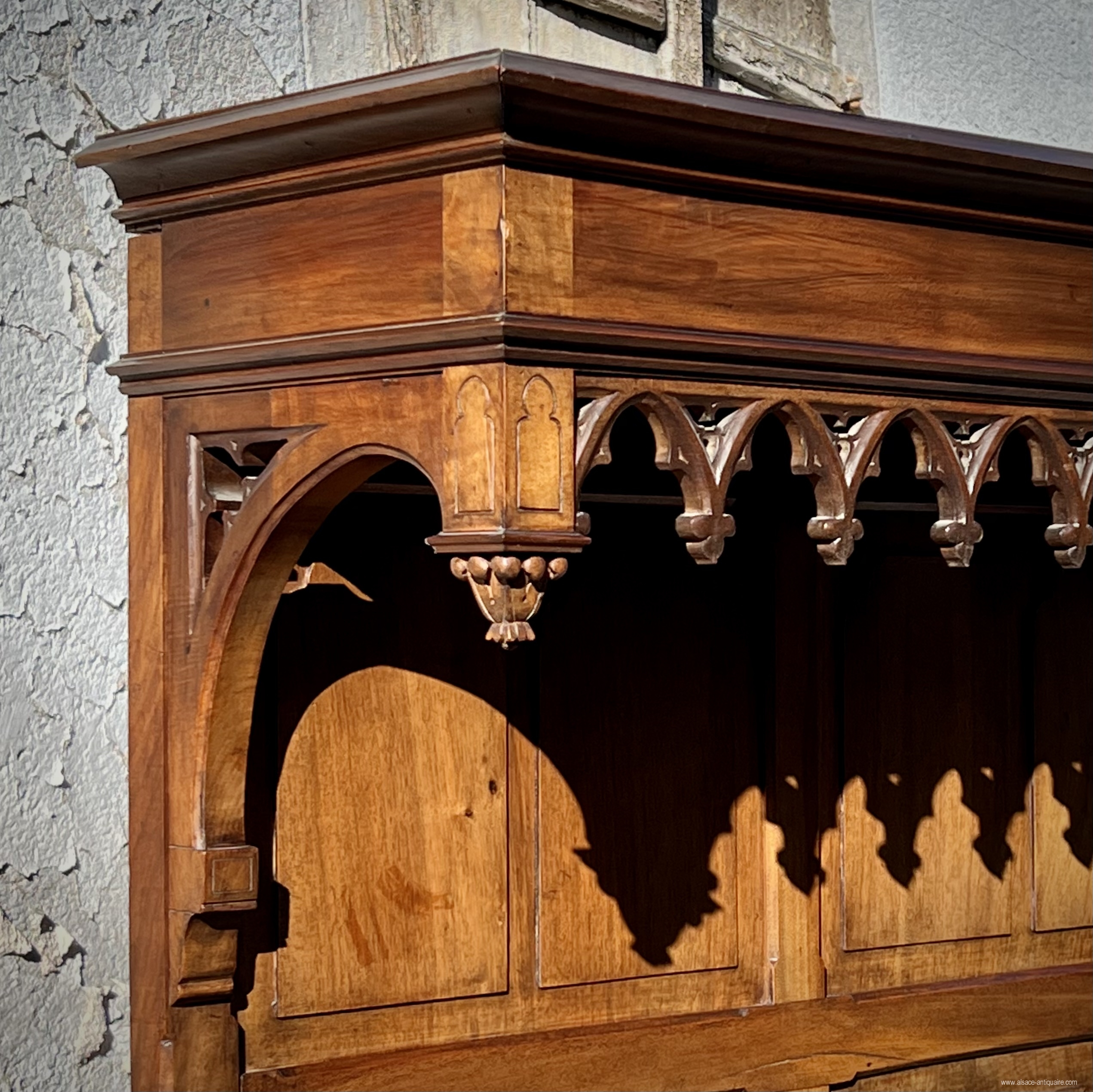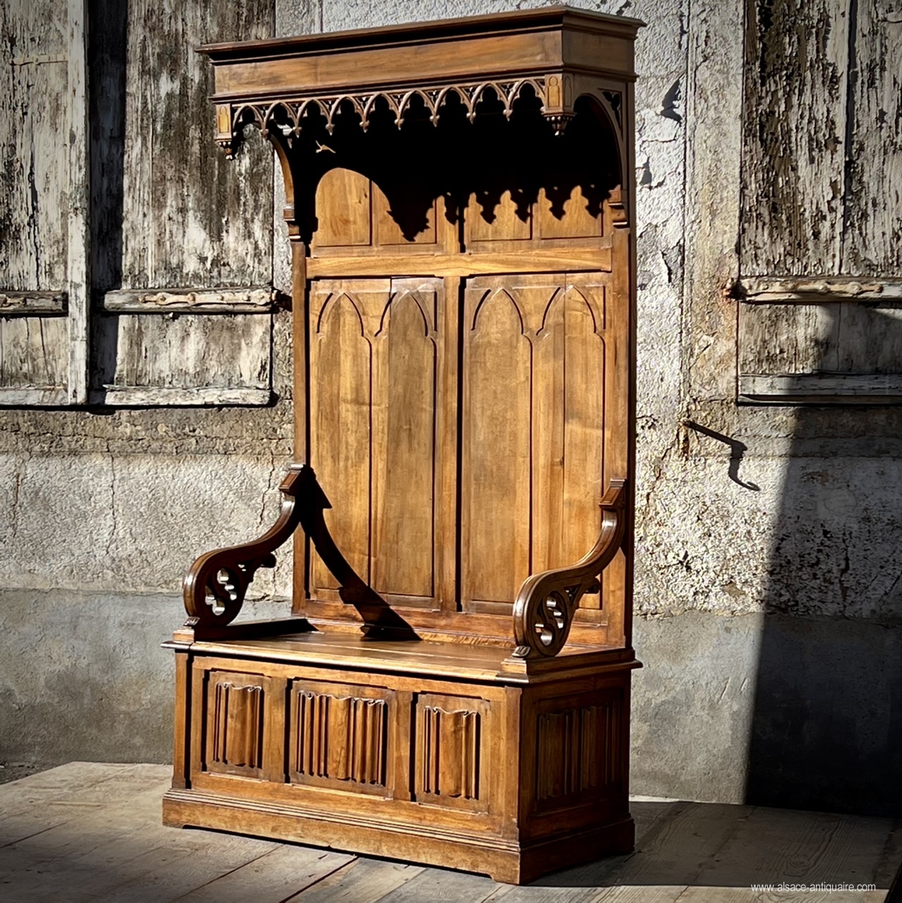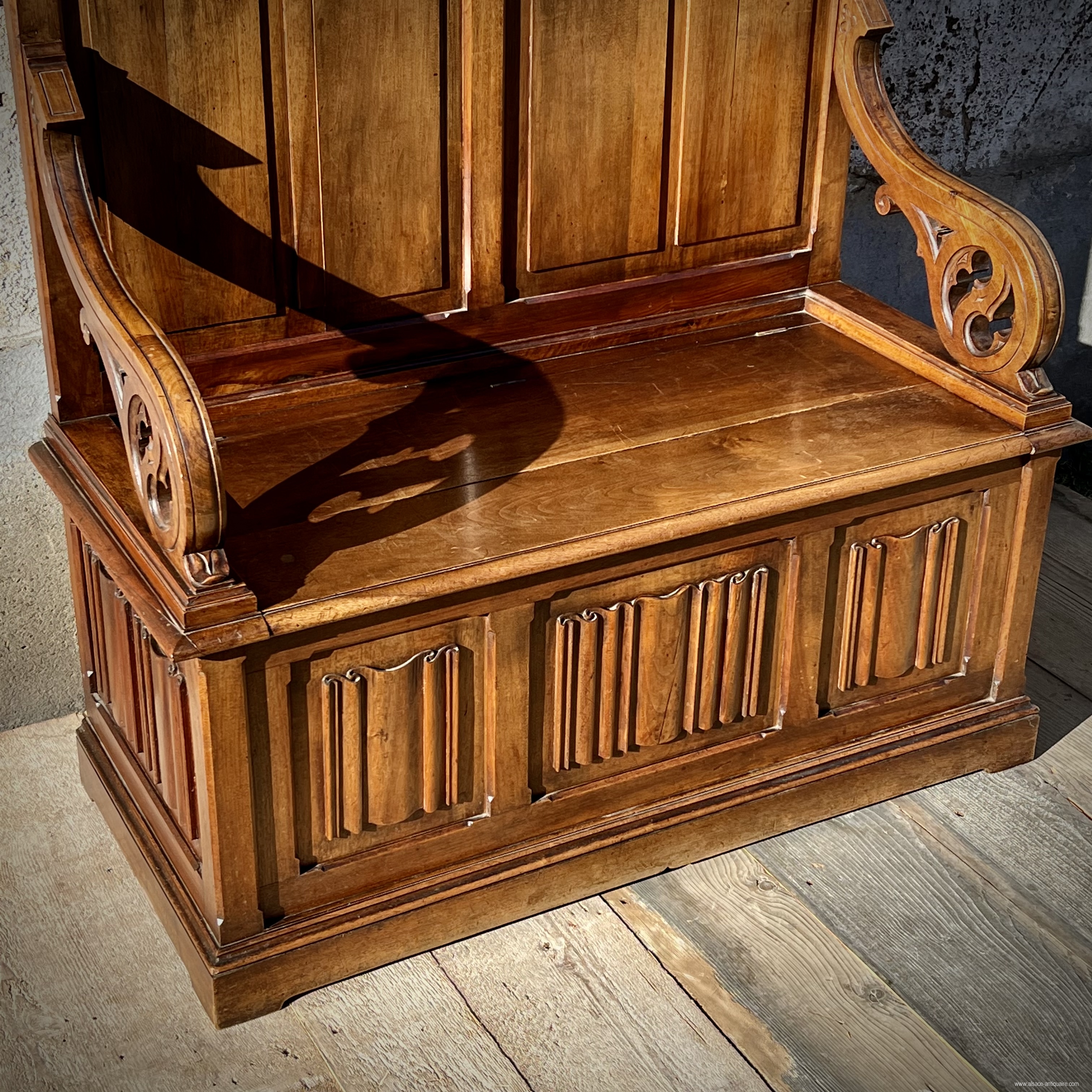 Original and beautiful decorative piece of furniture, this chest bench inspired by the châyeres or cathedre of the 15th century, is typical of fashionable manufactures under the Napoleon III period with this strong comeback of the Gothic and troubadour style that this period experienced. This piece of furniture takes up the napkin fold patterns for the panels on the front of the chest, under the cornice a lambrequin with its pointed arches and the small pinnacles which finalize the corner pillars. the armrests are with butts. 19th century period - Walnut - Good condition and beautiful patina - trunk floor replaced in the 20th century