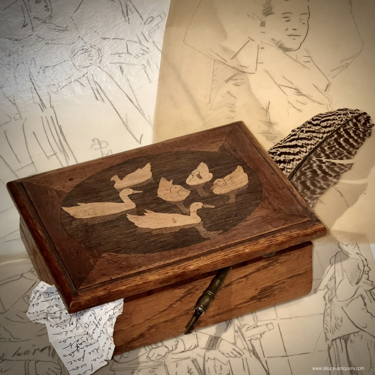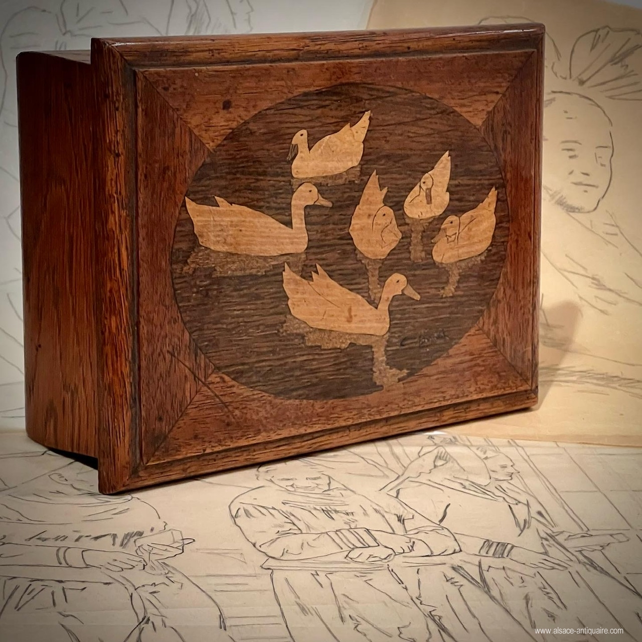 Rectangular box, lid assembled with miter cuts with central oval-shaped medallion and charming family decoration of ducks evolving on the water. Signed Charles Spindler: C.Spindler in the medallion. The drawings are by Many Benner, studies made as part of the Geispolsheim processions.