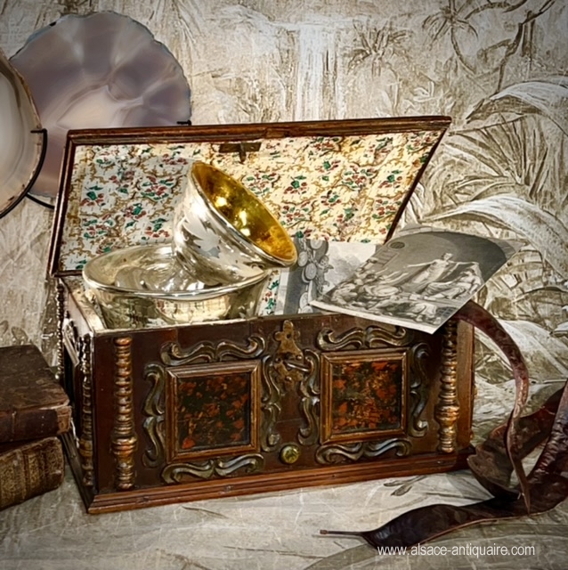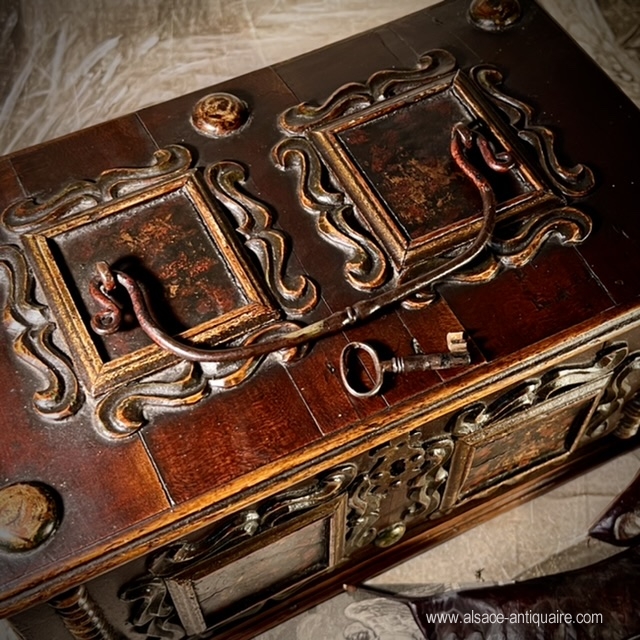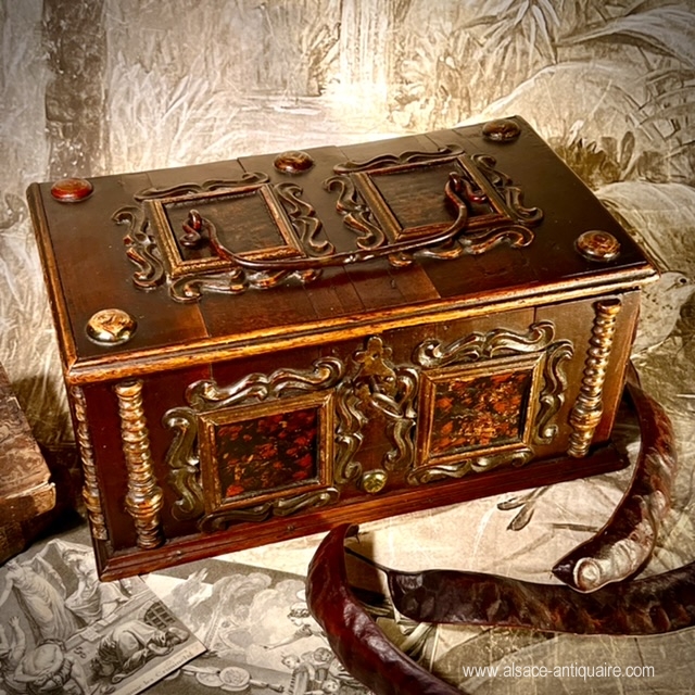 This rare box is the resumption in reduced model of the model of large chest forming part of the furniture present in the castles and beautiful residences in Alsace and along the Rhine in the XVII th century. The facade is punctuated by ringed columns separating bastioned panels, these are lined with sculptures of scrolls, the design of which still seems inspired by the "cartilage" style very fashionable during these periods. Another characteristic, rare in our regions, is the polychrome decor, tortoiseshell style, which adorns the panels and which seems inspired by the fashions developed in the royal cities, in particular by André Charles Boule. These boxes were often carried by their owner during their travels, because of the handle present on the top. Walnut marquetry on resinous frame. Period XVII th century.
