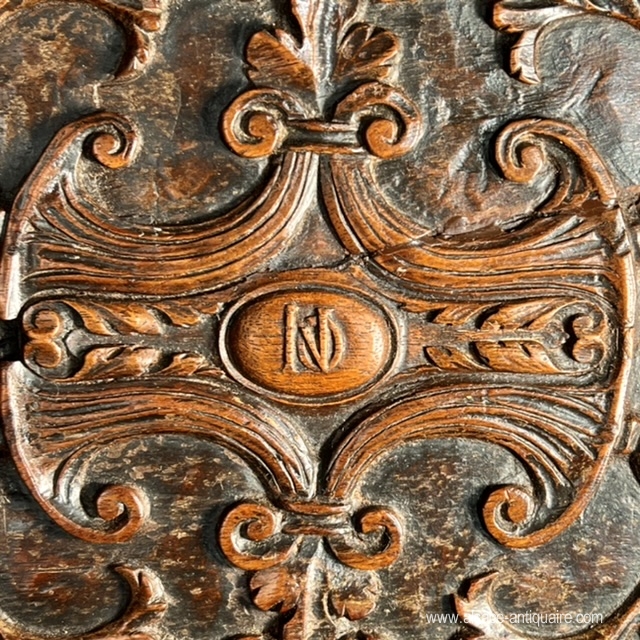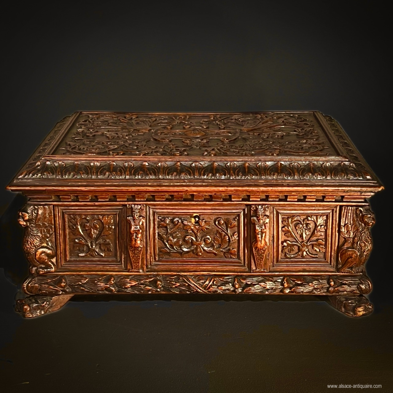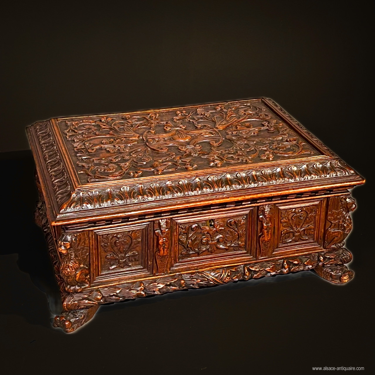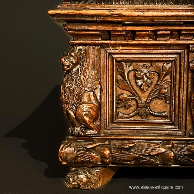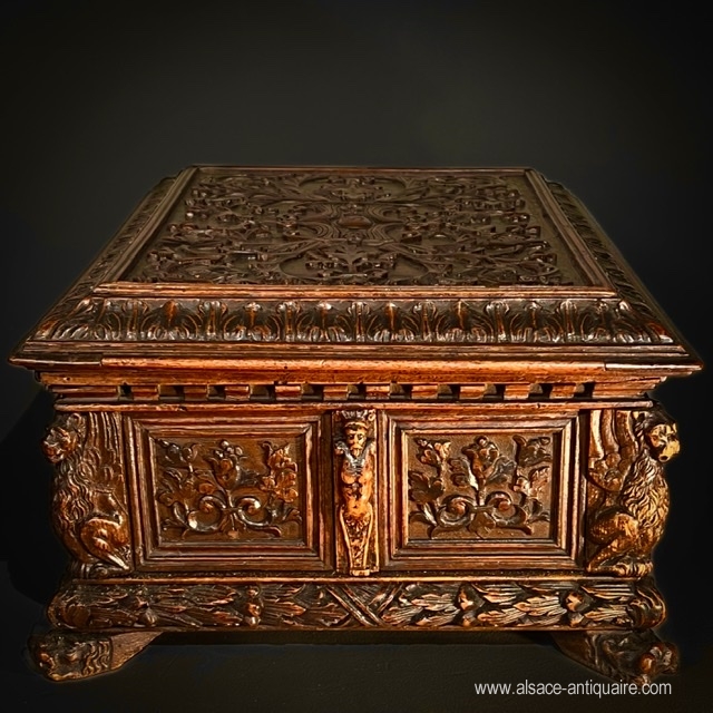 Rare courtesy or wedding box in walnut, Italy, 17th century, which uses the typical elements of Renaissance decorations. The side faces are divided into reserves, with molded contours, and carved with foliage scrolls, three in number for the long side and two for the short side. These panels are separated vertically by terms with men's heads, the sheathed part of which is decorated with foliage, at each angle a winged lion stands guard. The base is covered with a protruding molding sculpted with a braid of leaves and supported by feet in the shape of a lion's muzzle. The top is carved in its center with a cartouche formed by four cornucopias in the middle of which intertwined initials: NO. The entire top is carved with arabesques and foliage scrolls and bordered by a molding, also carved with leaves, underlined with a crenellation. The interior of the box was later equipped with a removable tray, probably to store jewelry, and dressed in a red velvet sheath, the hinges and the lock are later. Beautiful patina, some abrasions and wear on the feet.
