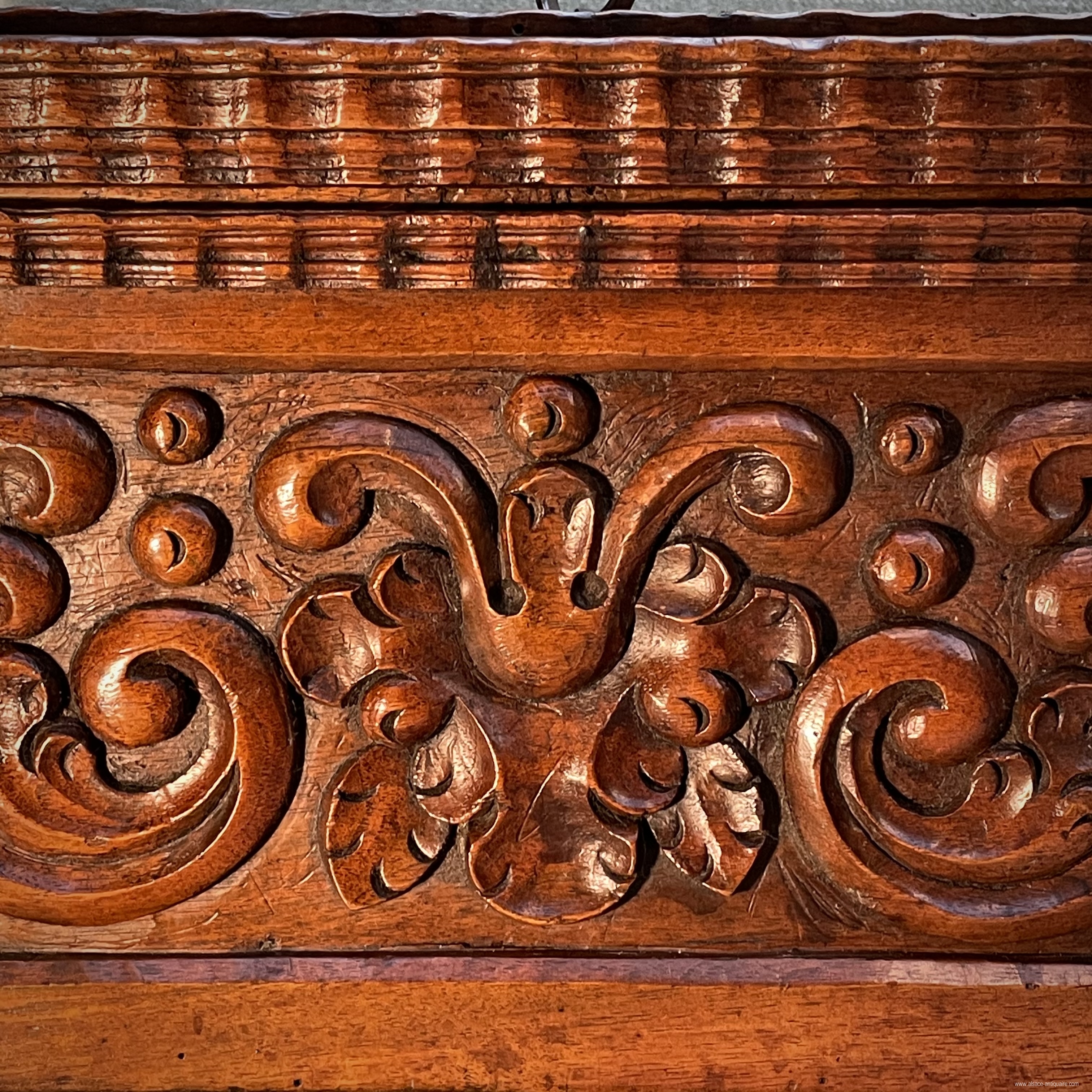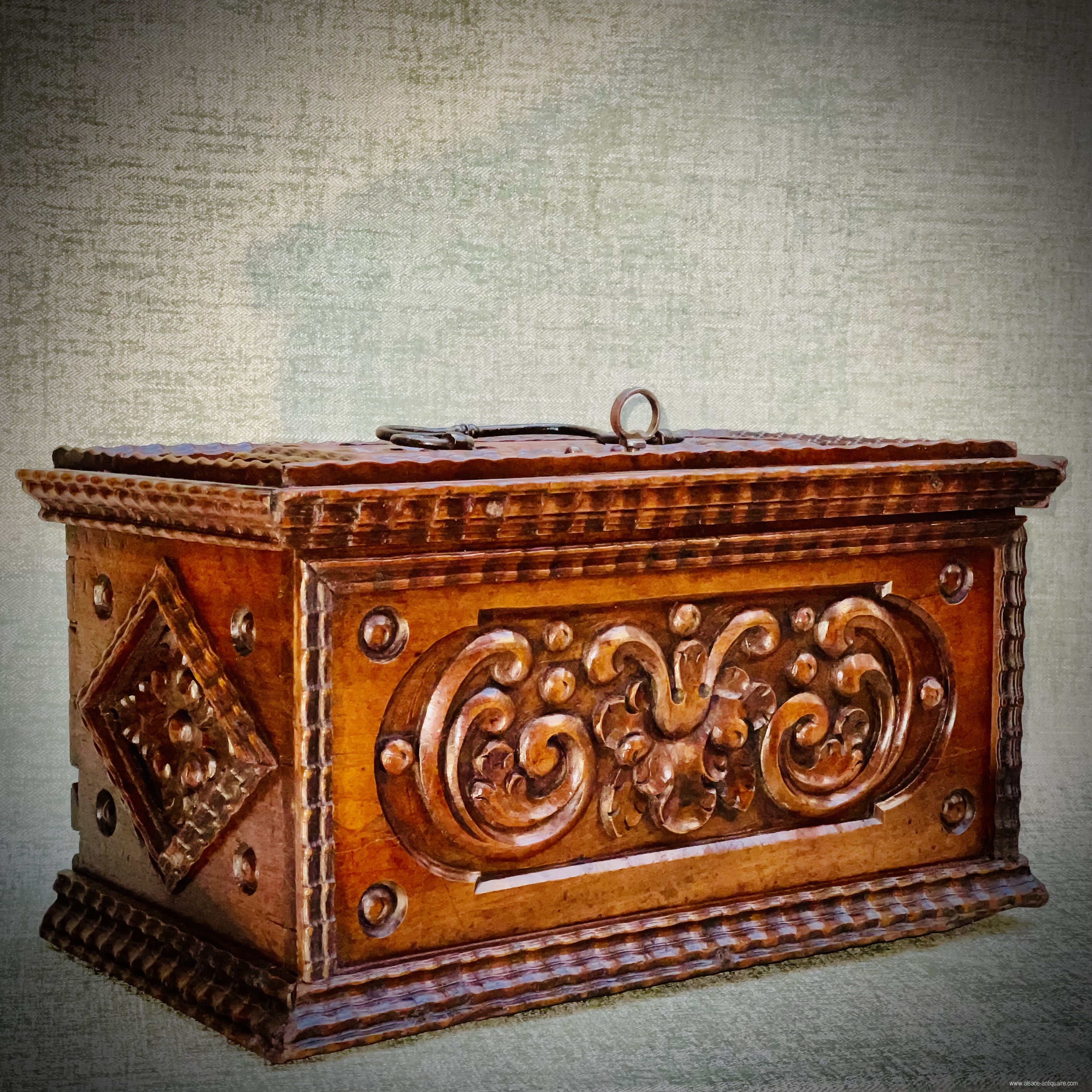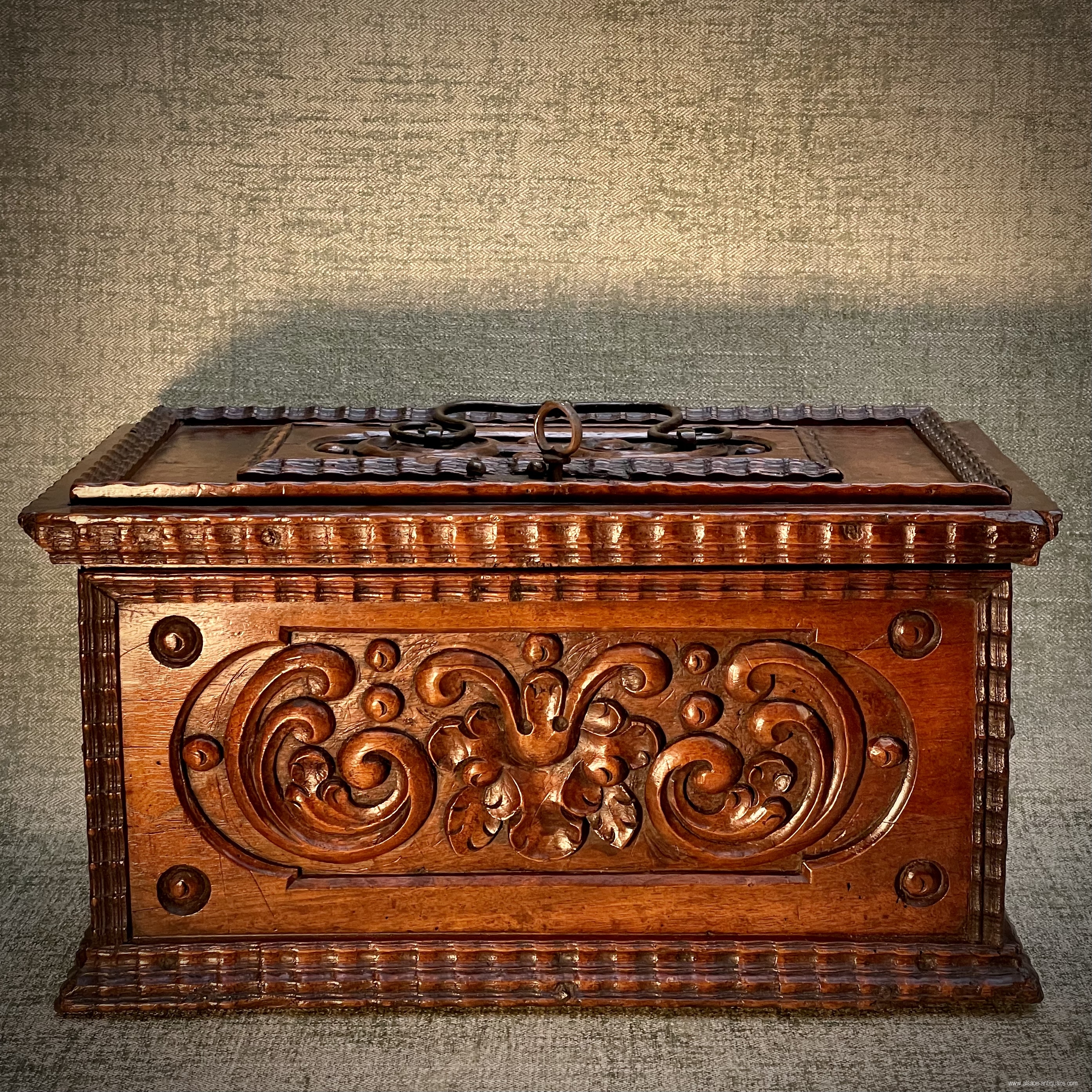 Rare walnut box, often offered for engagement, these boxes commonly called courtesy box, were intended to store the letters and personal letters of the bride. Beautiful specimen in walnut, panels carved with scrolls and scrolls, surrounded and bordered by wavy moldings, beautiful hinges in engraved and tinned iron, central handle with scrolls. South of Alsace or Switzerland. Period 17th century.