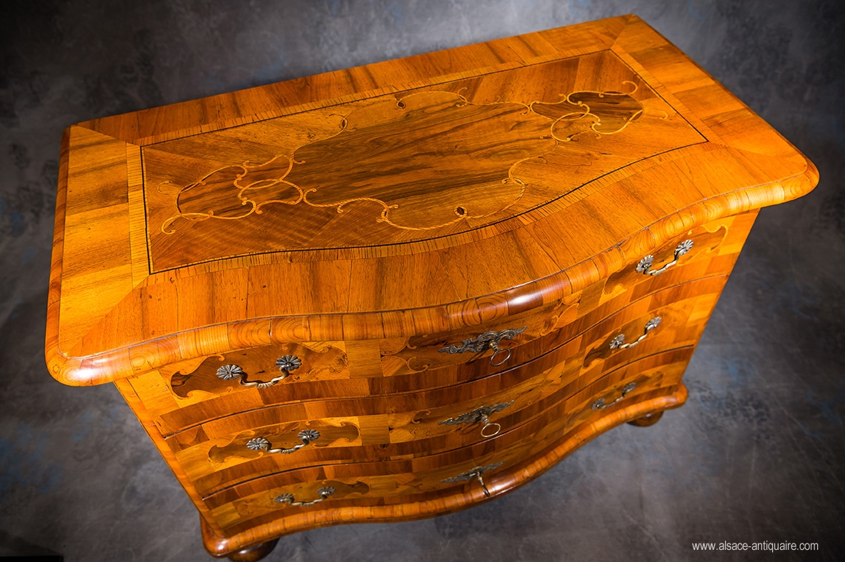 Alsatian chest with drawers with three rows of drawers. Curved front side with milling edges, top side with inlaid walnut traceries, pedestal in crosscut wood on rounded feet. Made of walnut, maple fir in Alsace during the XVIIth century.