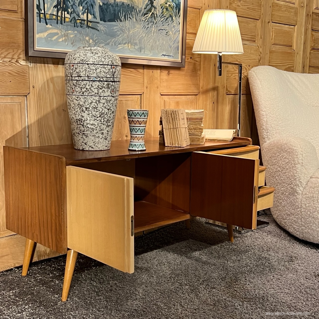 Ideal for a living room, you can put a TV on it, this pretty piece of furniture is well proportioned, 3 drawers on the right, small inclined feet, curved wooden handles. Around 1960.