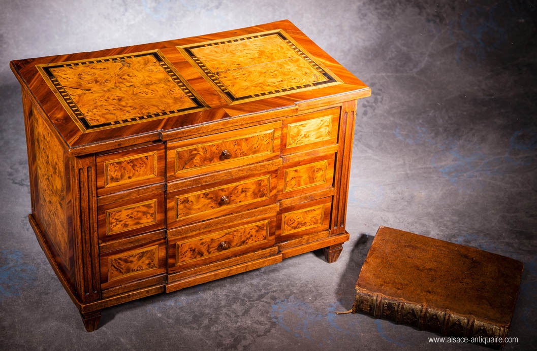Beautiful courtesy desk from the end of XVIIIth to the XIXth in Alsace, which represents all the Louis XVI style characteristics. Walnut, maple and ash inlay on fir foundation.