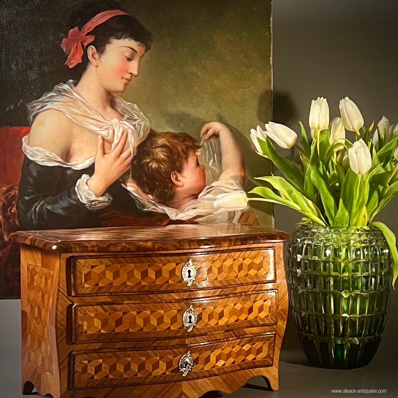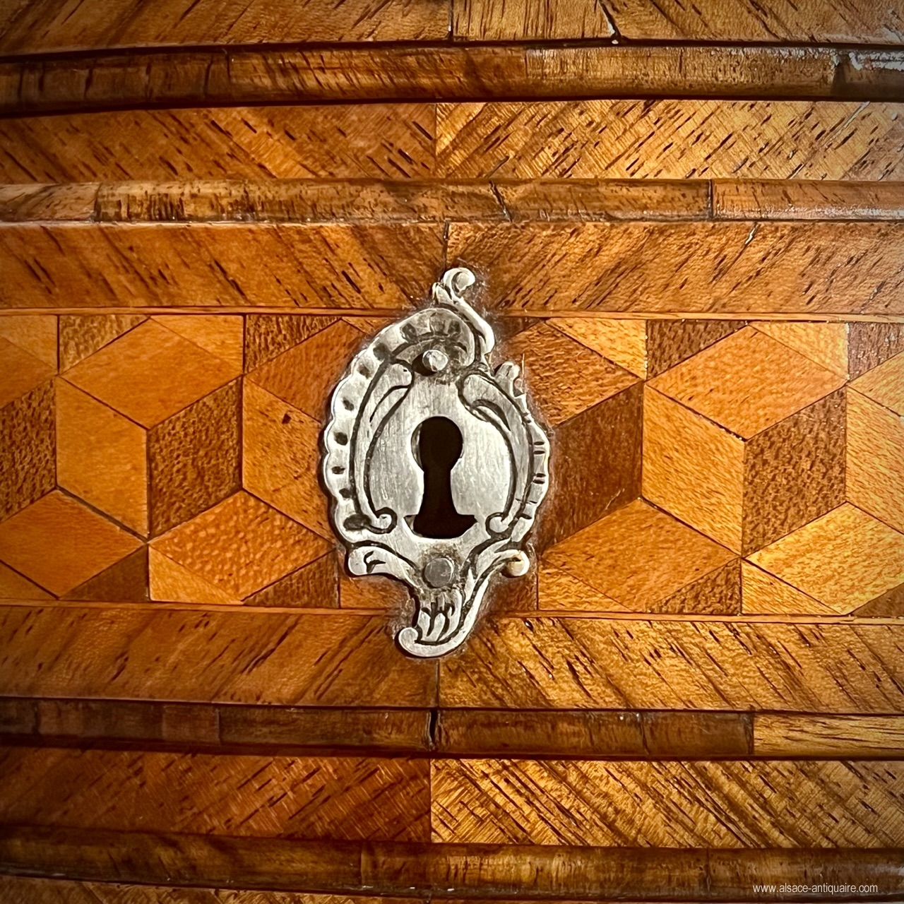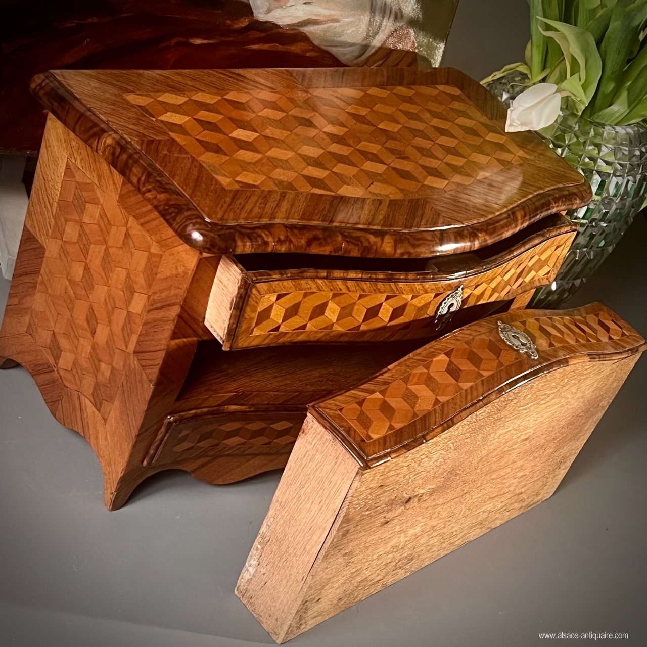 Rare master piece, preliminary reduced model for the realization of a beautiful ceremonial piece of furniture, this small chest of drawers curved on three sides, inlaid with walnut and maple, mosaic pattern, is from the 18th century, Alsatian workshop, probably Strasbourg.
