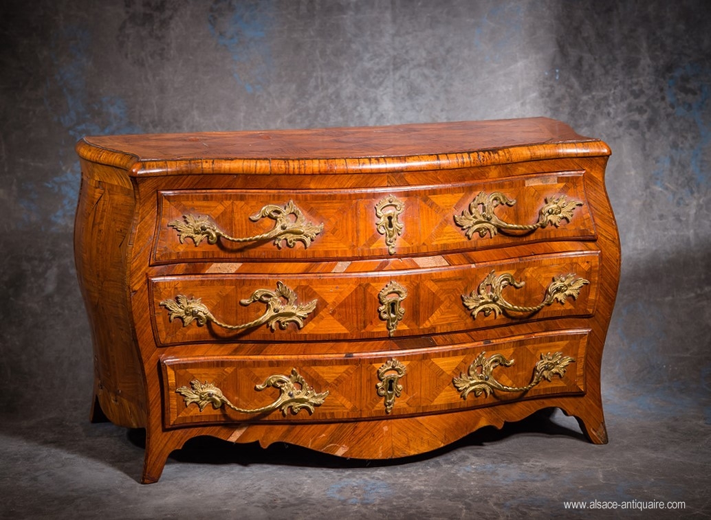 This inlaid chest of drawers has three curved sides, composed of bronze, rockeries, curved feet and walnut-inlay with curls and mosaic. It will be restored in our workshop. From the XVIIIth century.