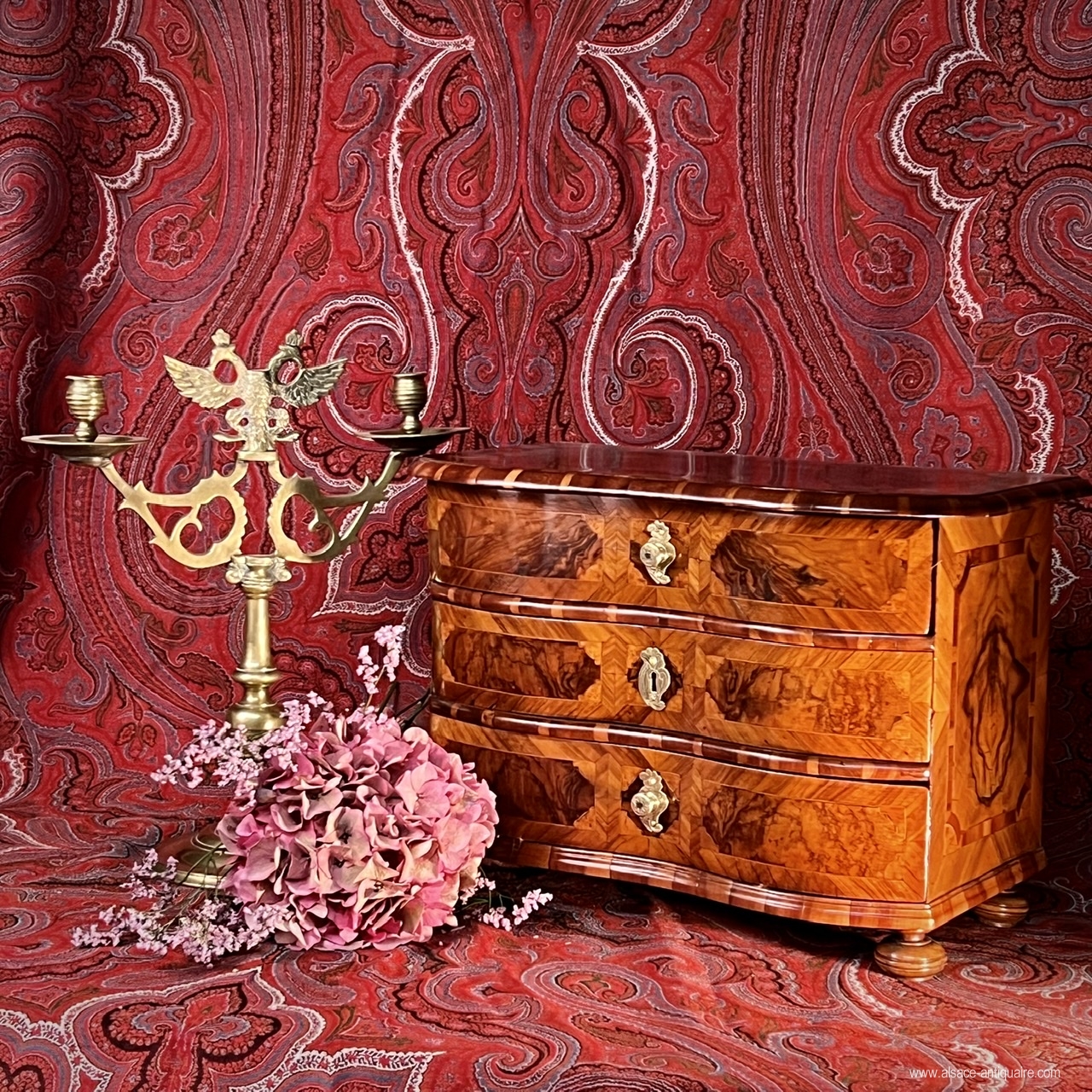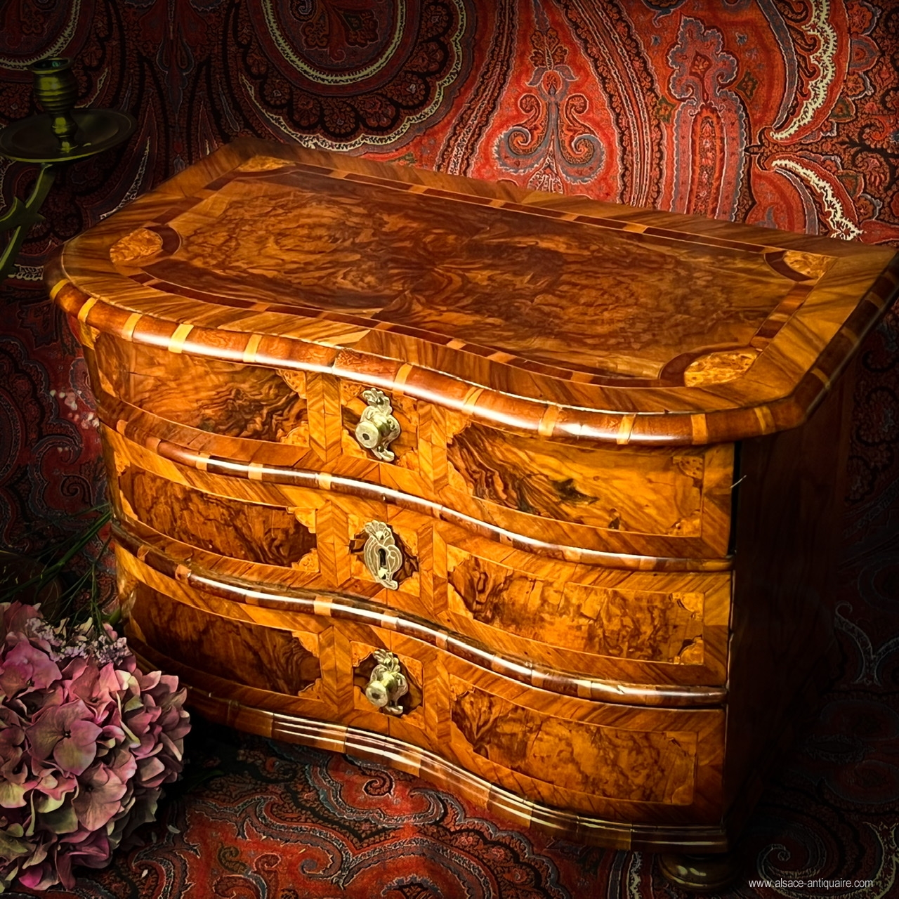 Rare piece of mastery, reduced model called in diminutive, perfectly well proportioned, preliminary to the creation of a beautiful ceremonial piece of furniture, this small chest of drawers whose facade is curved like a crossbow is inlaid with walnut alternating burly wood and wire wood, reserves are surrounded by maple and plum fillets, it is from the 18th century and of very good quality of execution. Everything is in diminutive, the lock entrances and button plate, finely engraved, are in brass as well as the buttons, beautiful original iron lock positioned on the middle drawer with a particularity: it has a double inverted pin and allows to also block the other two drawers. The edges of the top and crosspieces are molded in end grain wood. The top and sides are inlaid with a peripheral frieze and a central panel in 4 leaves surrounded by a large plum fillet surrounded by maple fillets. Beautiful selection of well-grained wood. An old, partially preserved paper must have covered the inside of the drawers. This beautiful collector's item probably comes from an Alsatian workshop or from the Rhine valley. These pieces, commonly called master furniture, could be made, in addition to a larger piece of furniture, as a masterpiece to be presented to gain access to the Master Cabinetmaker diploma, often according to specifications well established by the corporation, they could also serve as a model prior to an order, or be the subject of a sampling showing the know-how and the differences in models that the cabinetmaker was capable of producing to order in his workshop. size 44 x33 x27 cm