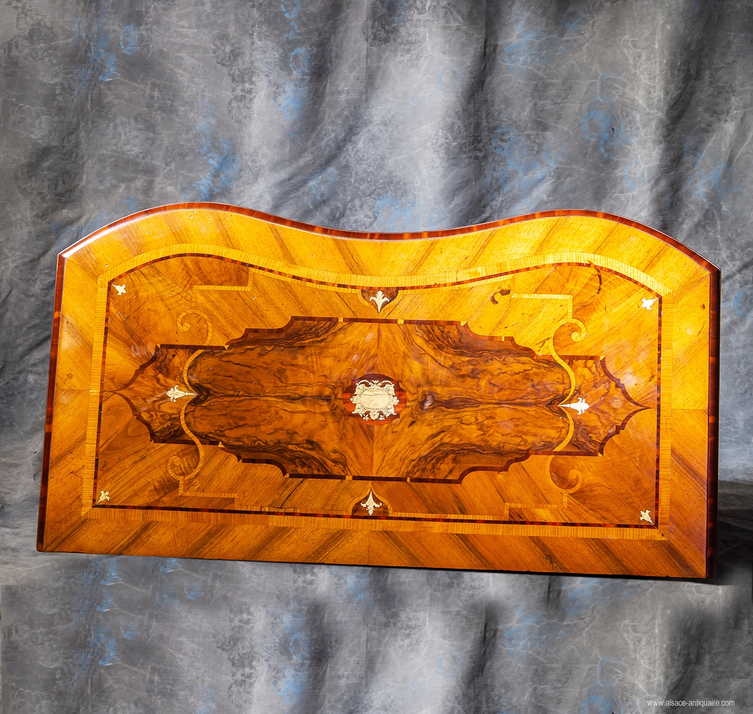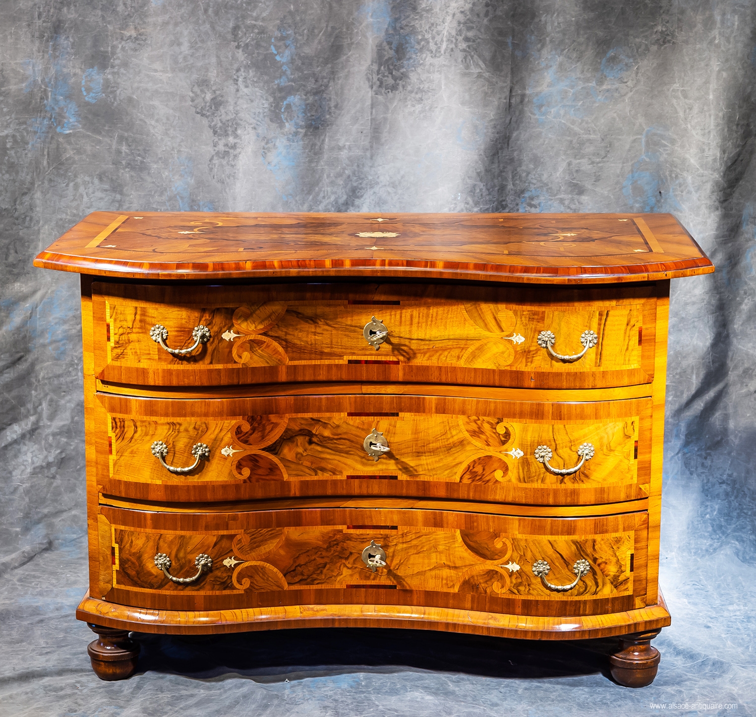 Small chest of drawers with three drawers, curved front, interlacing decoration with small ivory inlays. Walnut and maple marquetry - Period 18th century Alsace - Rhine valley
