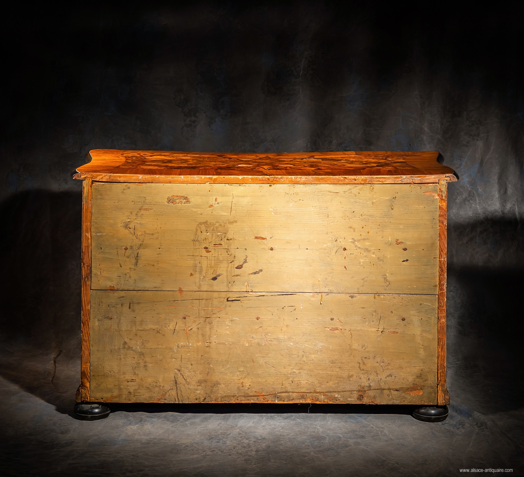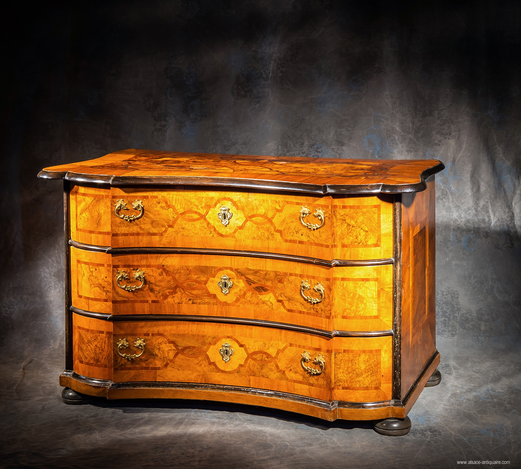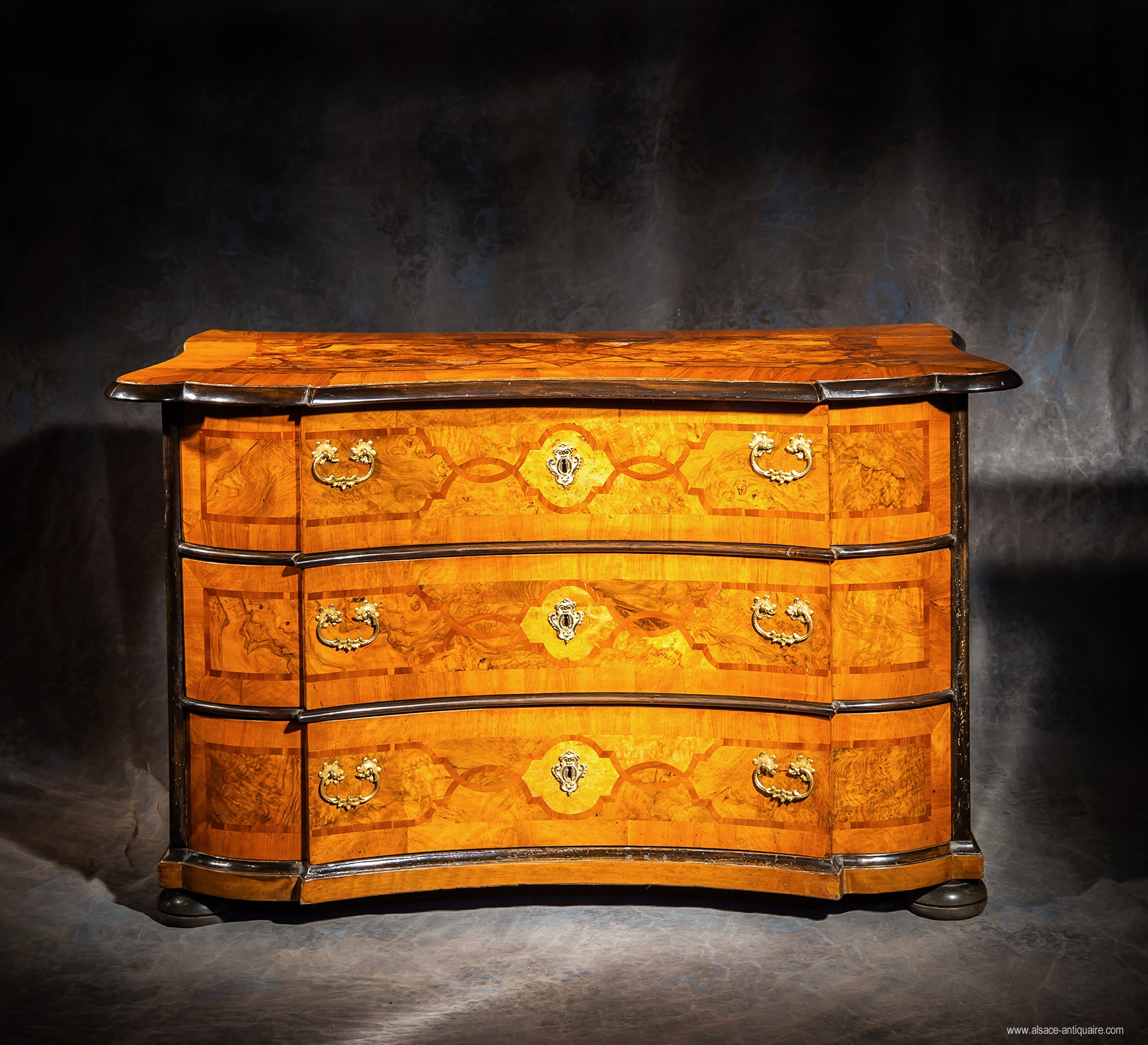 Decorated with interlacing inlaid country wood in contrasting tones, alternating walnut with grain and bramble, the projecting moldings and edge of the top tinted in black give this beautiful piece of furniture from the 18th century an incredible modernity. Beautiful bronze handles. Rhine Valley Workshop. Eighteenth century period.