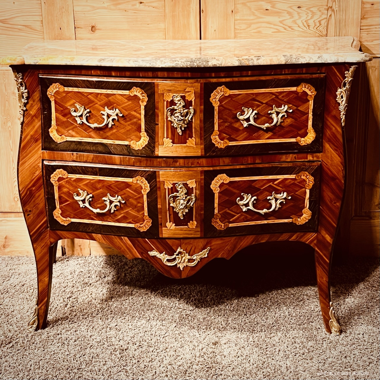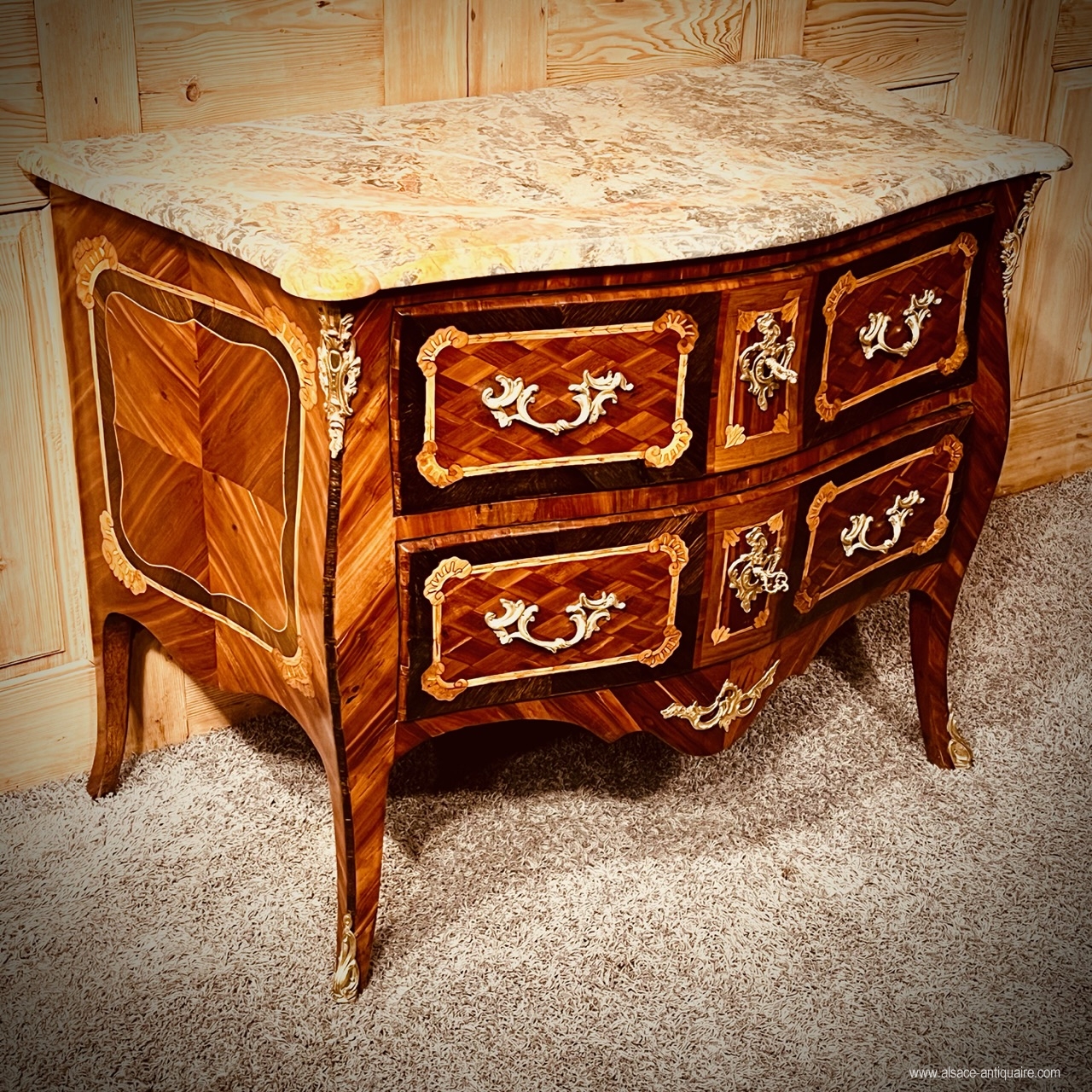 Curved on the sides and the front, this dresser opens with two drawers. Decor inlaid and engraved with simulated shells and herringbone nets enclosing reserves on the drawers with a geometric background of diamond patterns, and on the sides of curling in four leaves. Period bronzes and locks. The top is in Sarrancolin marble, and has a beautiful Corbin beak molding on three sides, it has undergone a skilful restoration, very little visible. The back is with a molded panel. The frame is in oak and resinous and the marquetry in maple, oak, orchard. Beautiful regional work from the 18th century in very good condition.