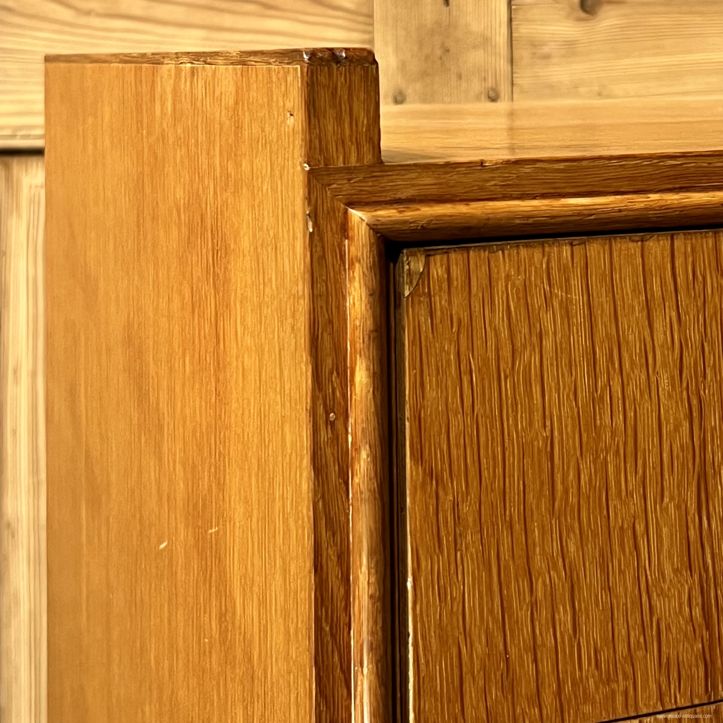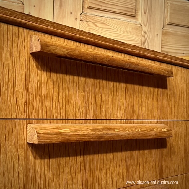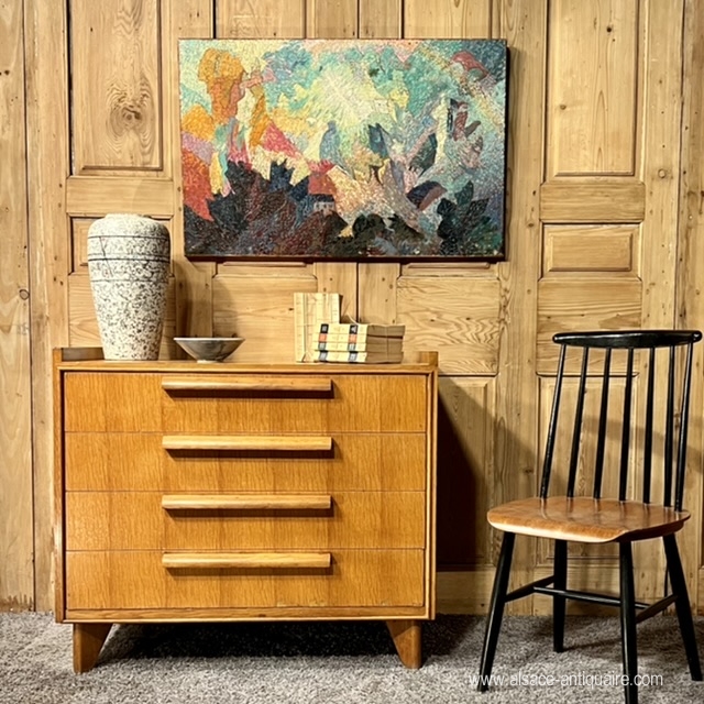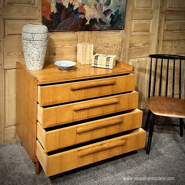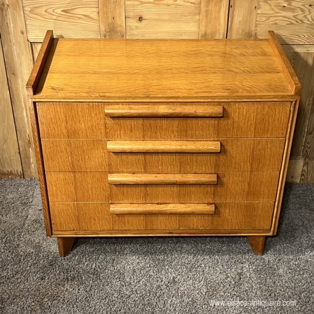 Functional, this chest of drawers with 4 drawers can be integrated into the brutalist style with its large cylindrical handles. The design remains sober, neat and sought after: note the fine peripheral molding on the front, the sides that protrude from the top, and the position of the handles, off-center on the height of the drawer, the feet are also to be noticed, bevelled, in a Jean Prouvé spirit. Lodging furniture and in good condition.