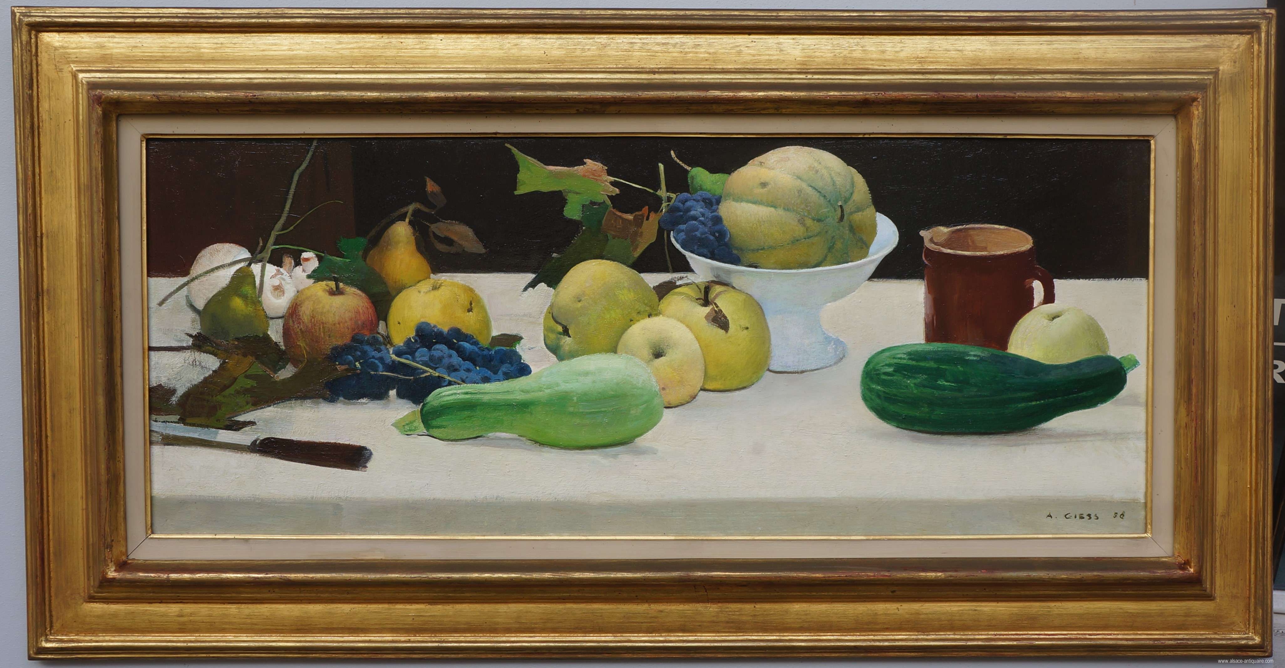 A fresh fruits and squashes composition on a white tablecloth. Oil on panel by A. Giess from 1956. A beautiful a golden-mat wood frame surrounds it.
