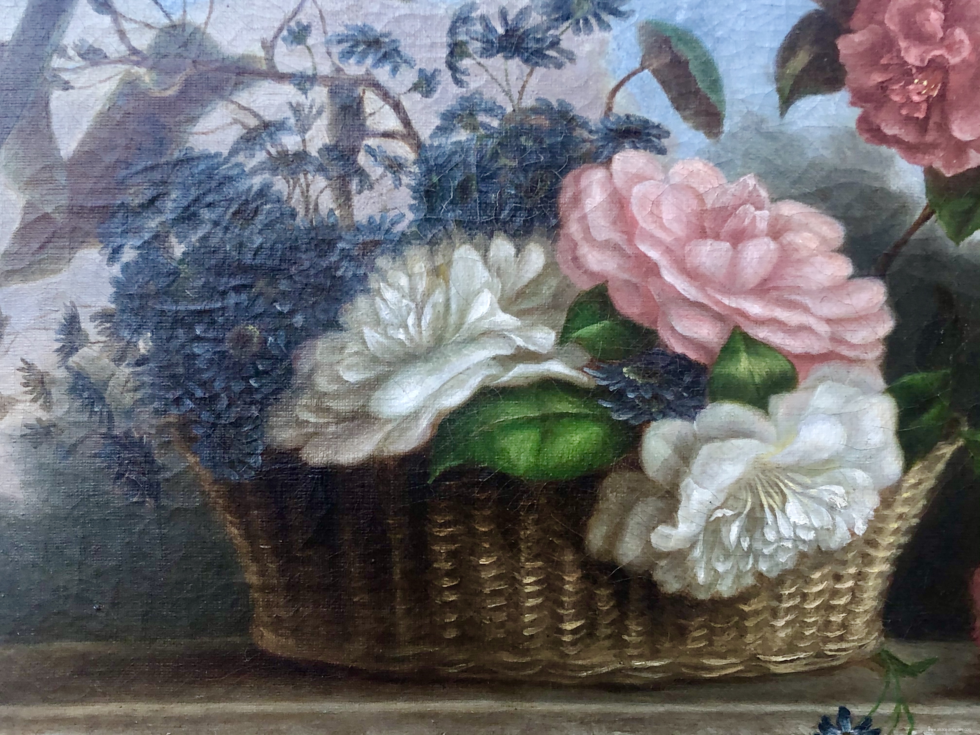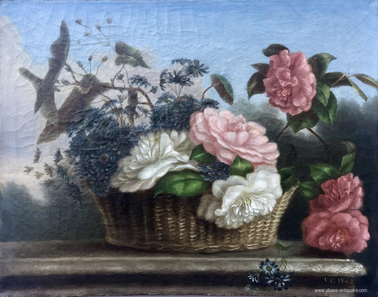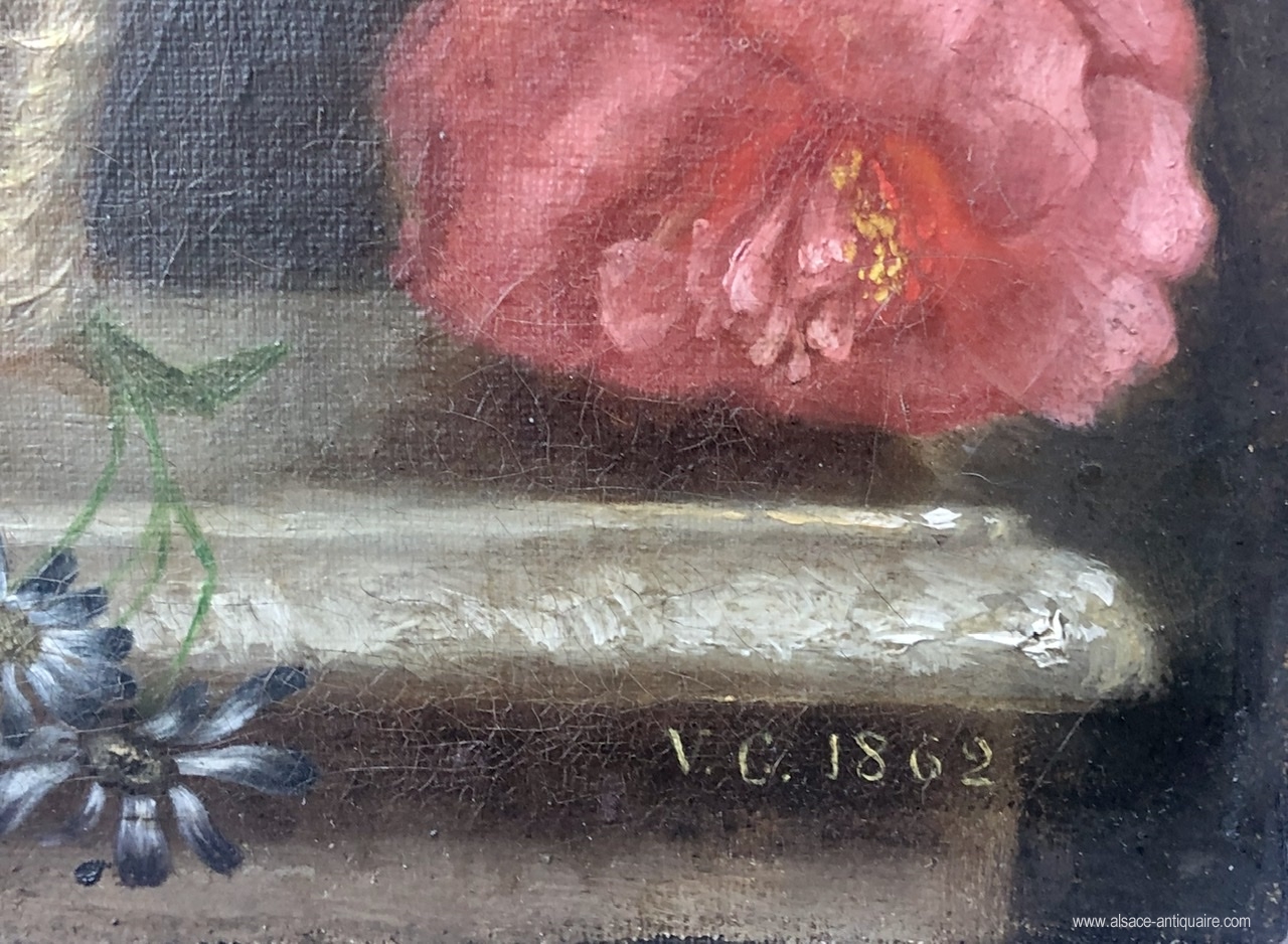 A charming work, this oil on canvas features a set of flowers composed in a wicker basket on a stone entablature. The work is monogrammed V.C. and dated 1862. It recalls certain treatments of flower painters who evolved in Mulhouse in the 19th century, a city which through its specialty, textiles, initiated through its drawing workshops of many artists.