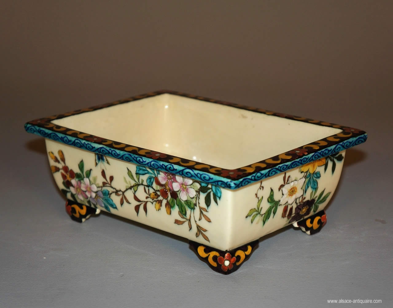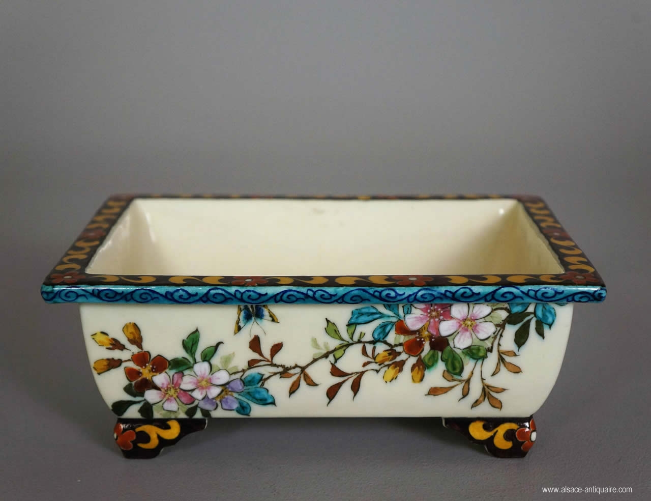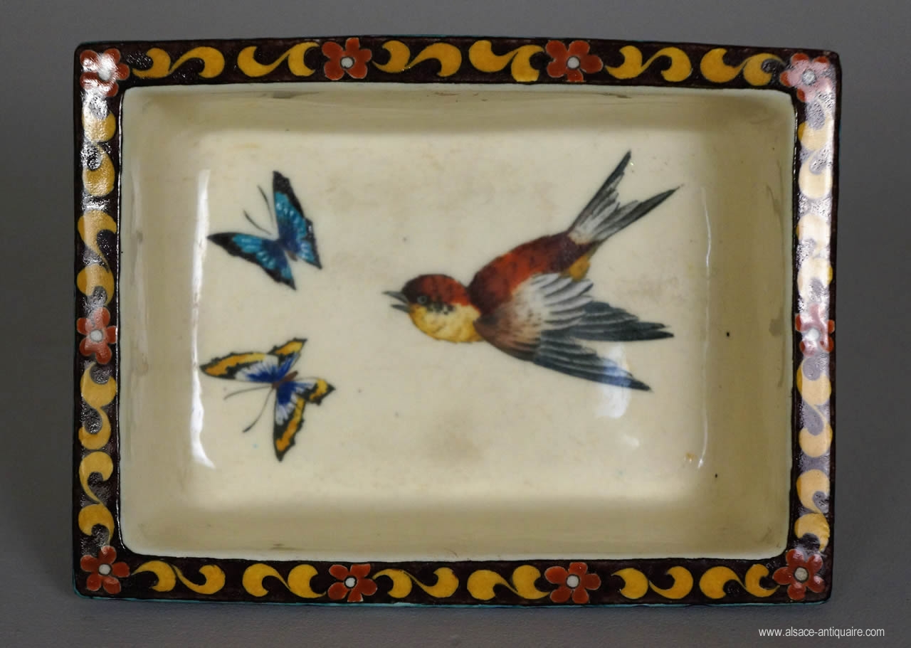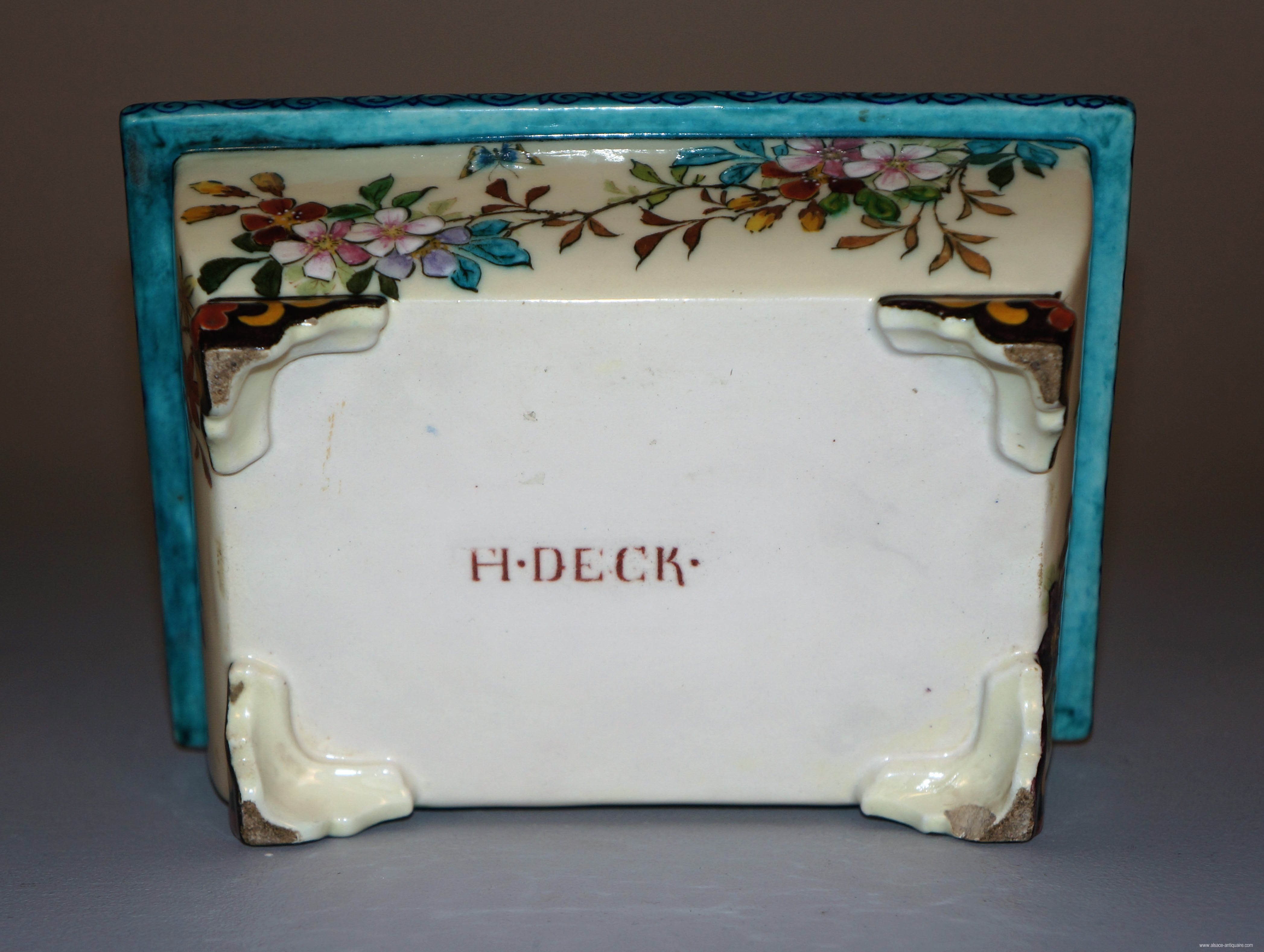 Little rectangular cup, adorned with floral and bird decorations, signed with "TH DECK" under its base.