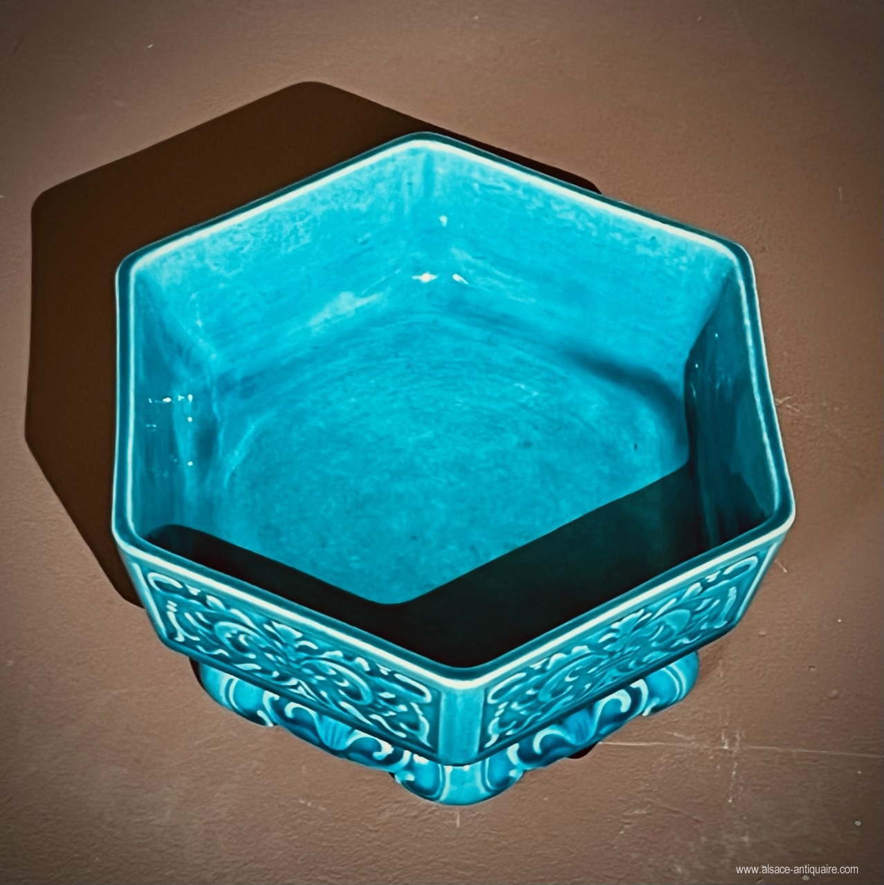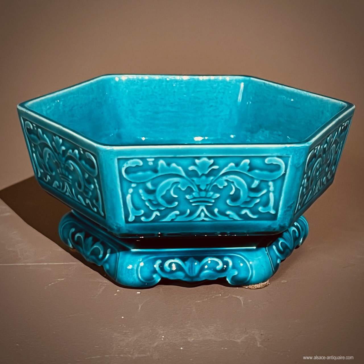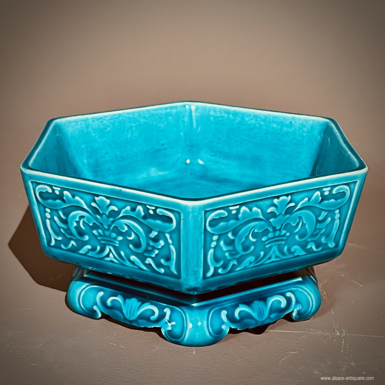 Decorated with leafy scrolls for this small hexagonal bowl which will serve as an empty pocket or baguier. Théodore Deck (1823-1891) created a number of small everyday objects, such as small vases, cups, ring sizers and empty pockets, whose decorations are inspired by motifs from Chinese or Japanese art, Japanism being very fashionable in the last third of the 19th century. Our small cup is signed under the Th.Deck base.
