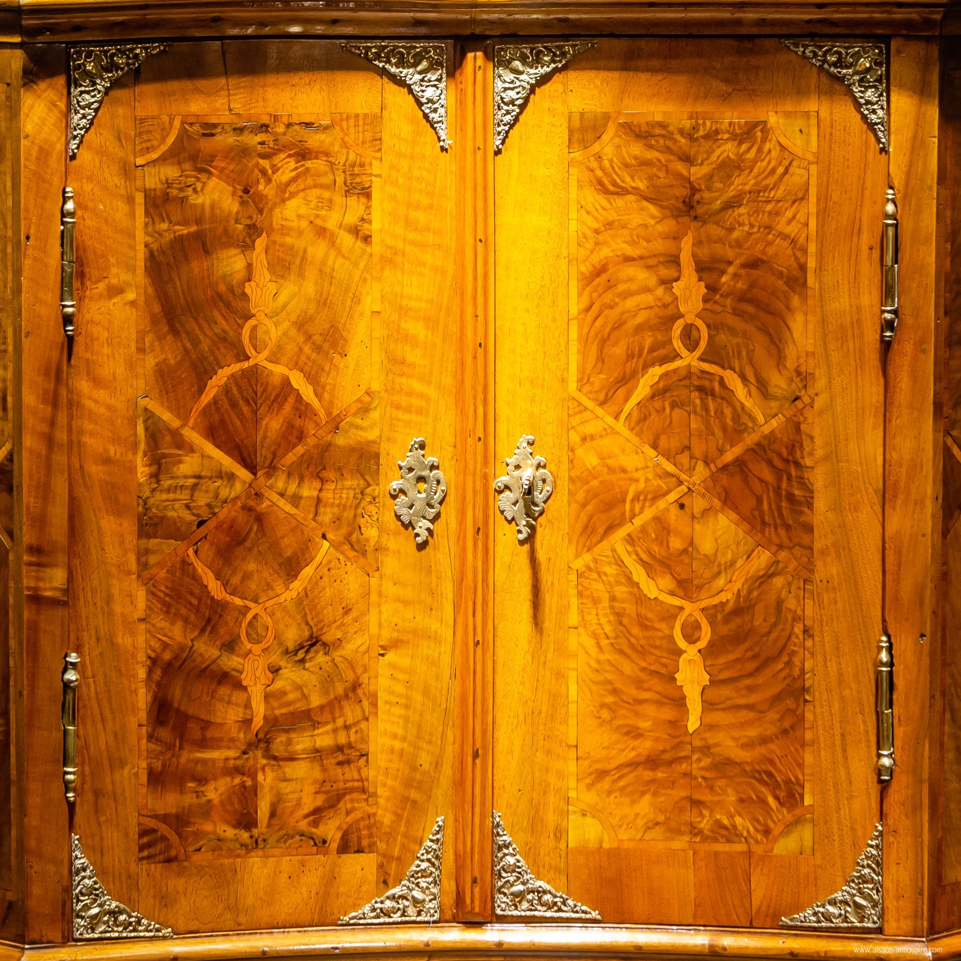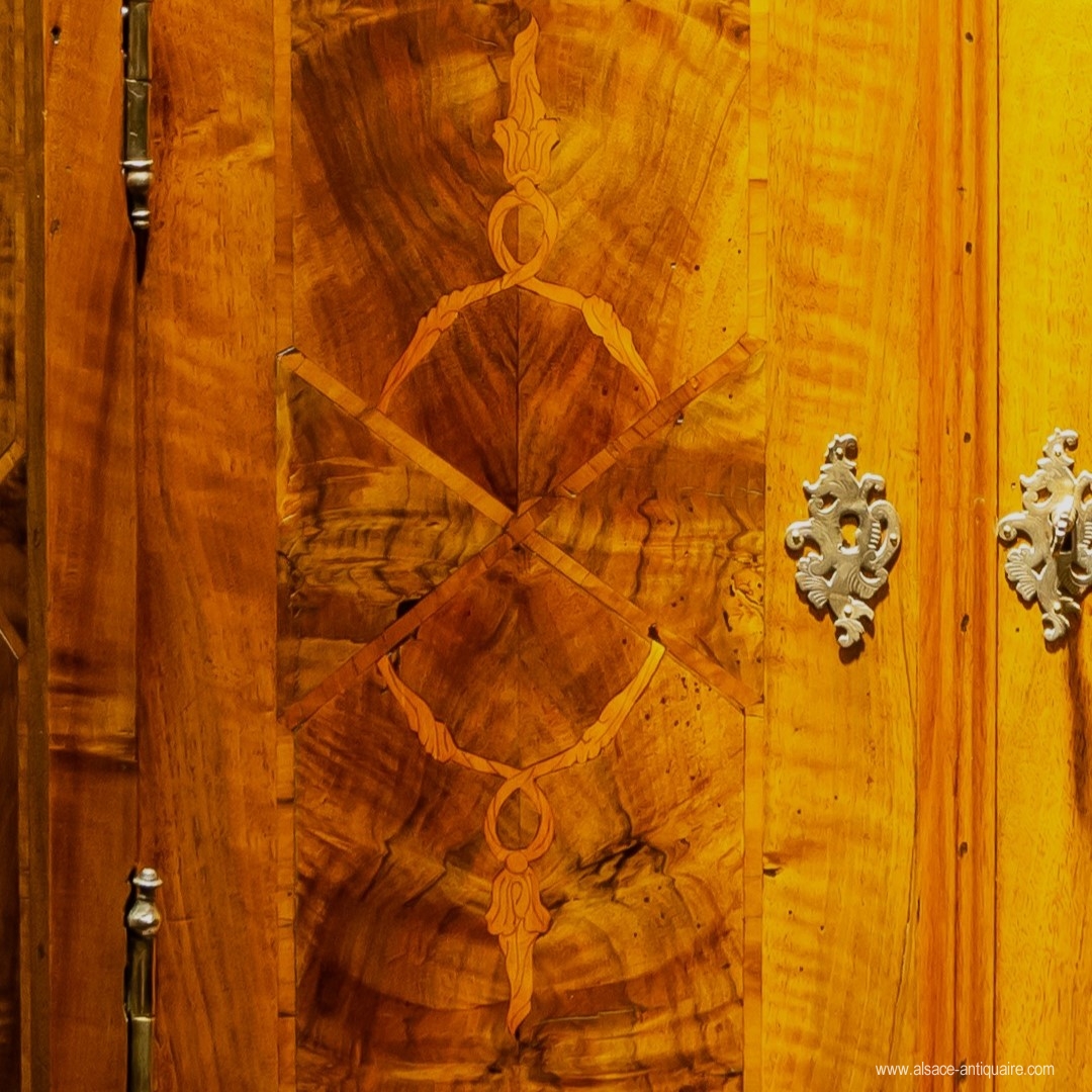 the decoration of the doors presents reserves in 4 sheets, surrounded by nets these are also included in the uprights, with a lambrequin motif whose cords intersect and are finalized with fire pots, maple is the essence used for these reasons.The doors are fitted with brass hinges and adorned in the corners with beautiful foliage motifs in bronze