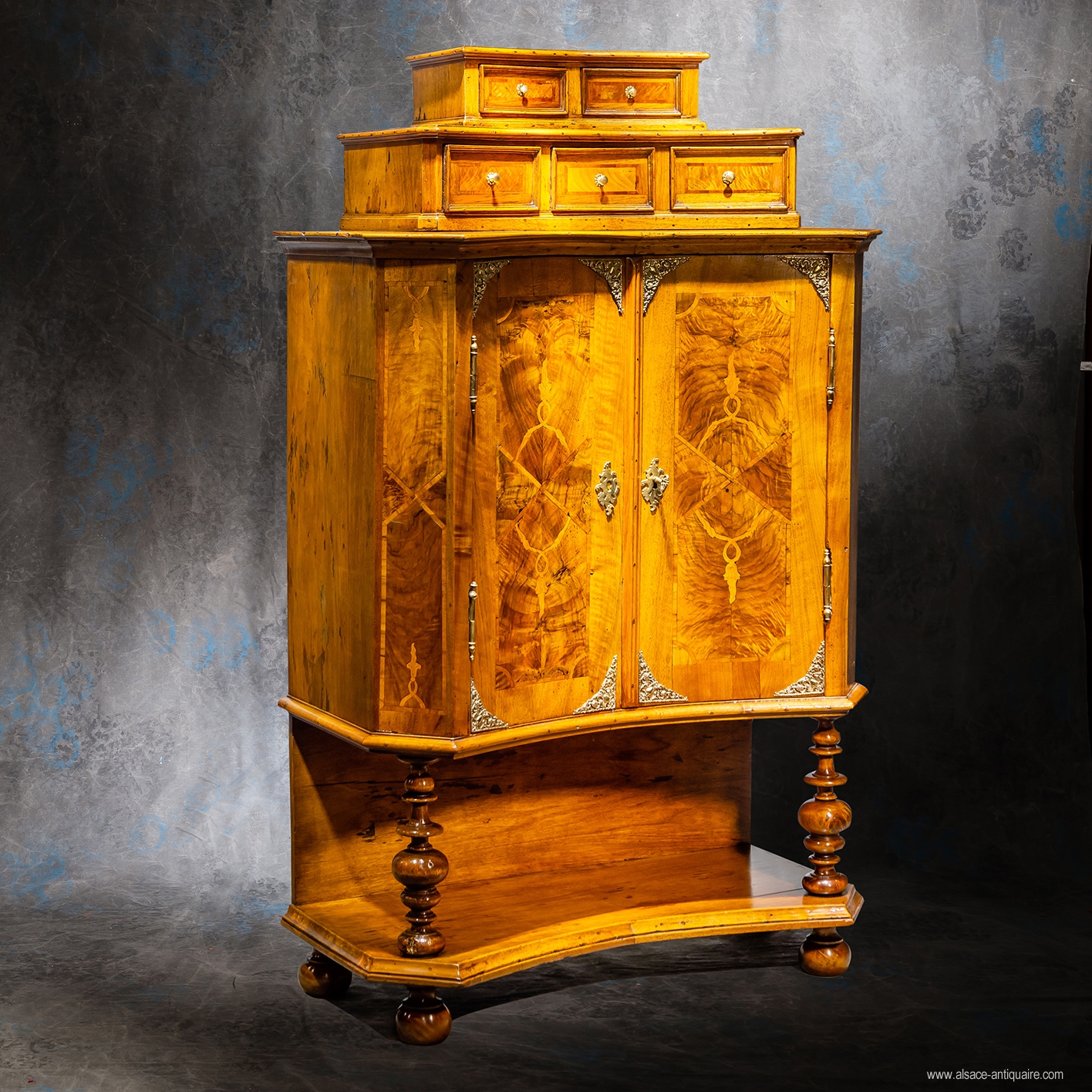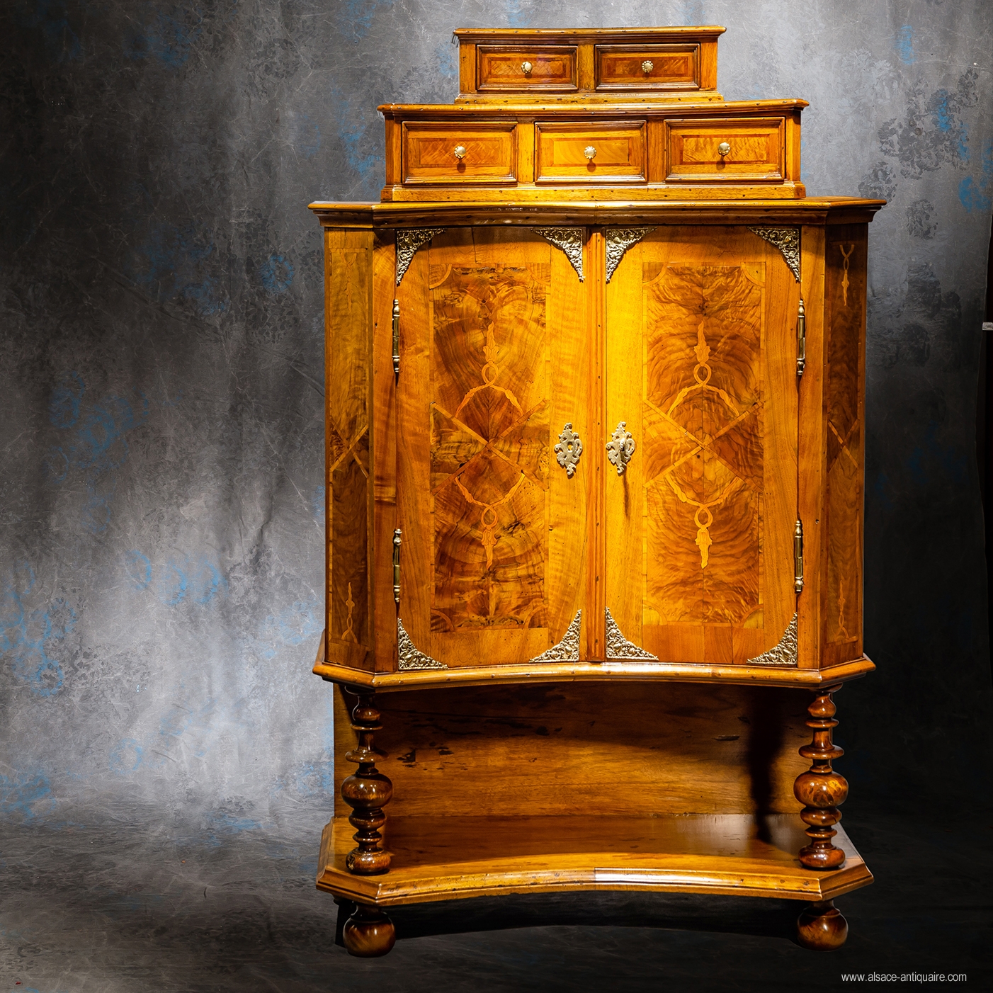 The body of the cabinet is elegant, placed on a turned wooden base, clearing a display space. The upper part is surmounted by a set of 5 drawers arranged in tiers allowing in past centuries to present silver goblets, cups or carafes. The amounts are with cut sides and accentuate the effect of lightness given off by the whole. South of the Rhine Valley Alsace or Switzerland - Period XVIII th century