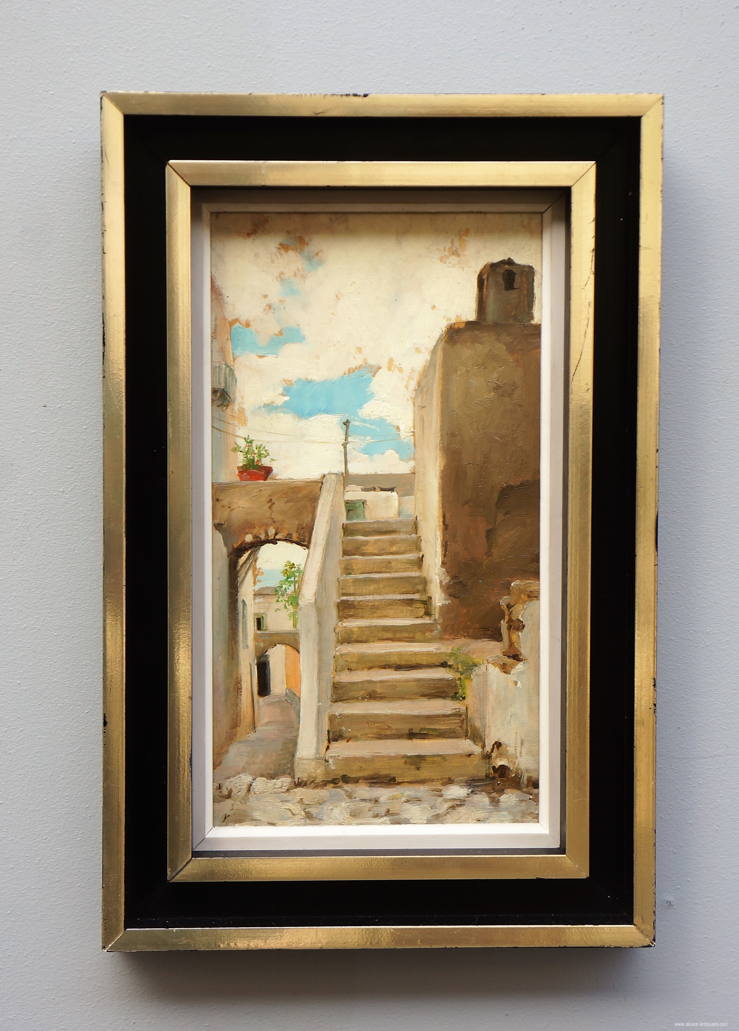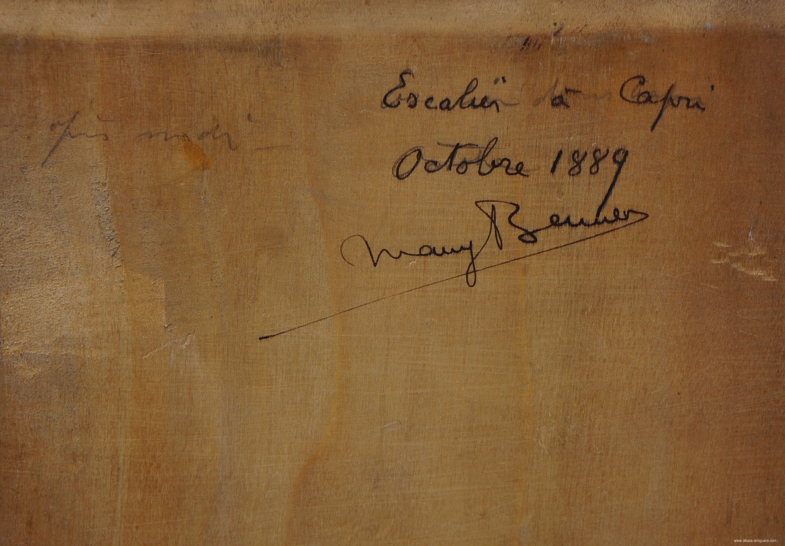 Early work of Many Benner, located Escalier à Capri dated 1889 signed and dated on the back. oil on wood panel. Jean Benner, Many's father went regularly to Capri, he met his future wife there, Many was therefore born on this island. Although living in Paris, the Benner family kept its ties with Capri and returned there regularly. Quite naturally, the Capri atmosphere provided the setting for numerous works by Emmanuel, Jean and Many Benner.