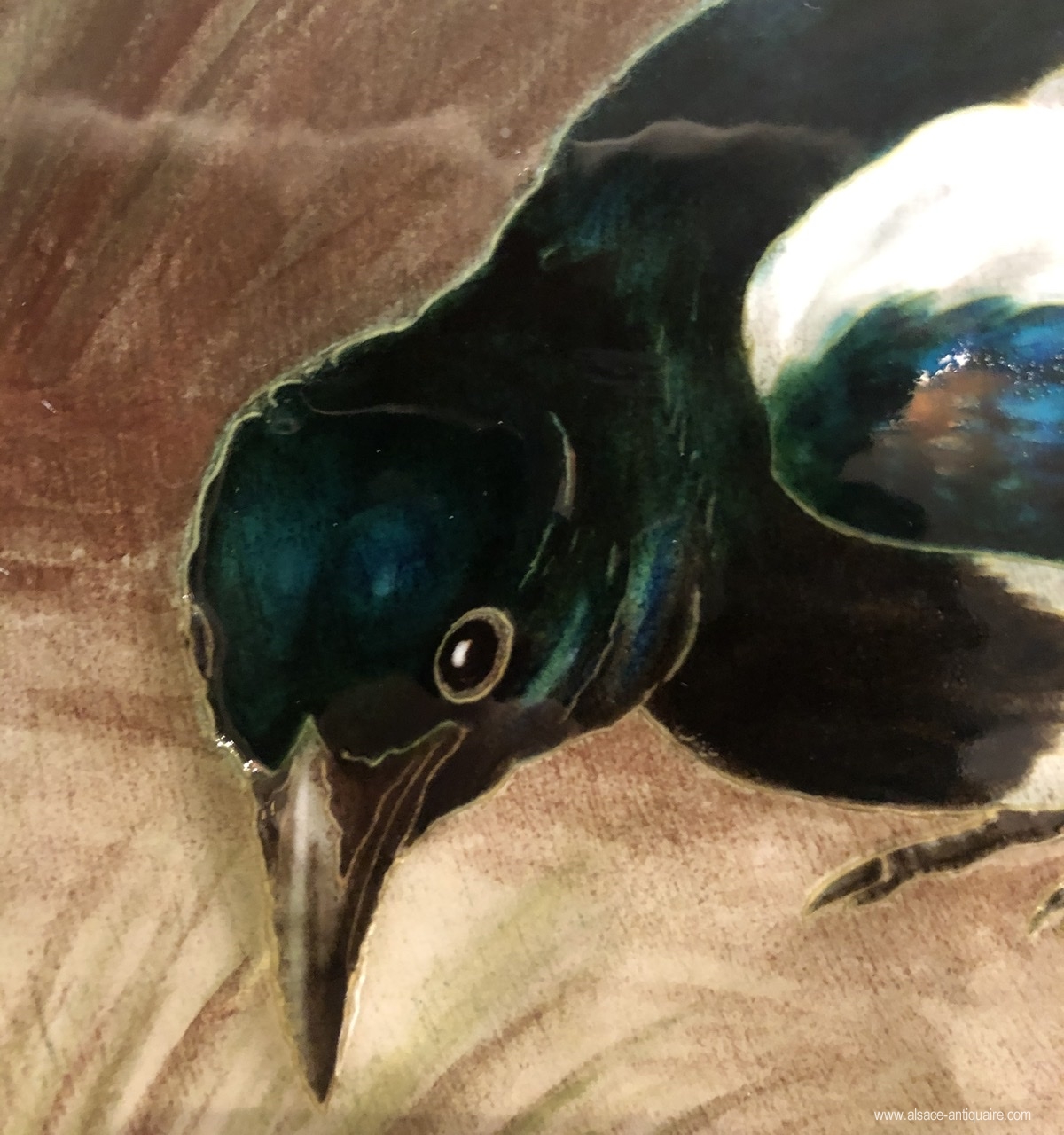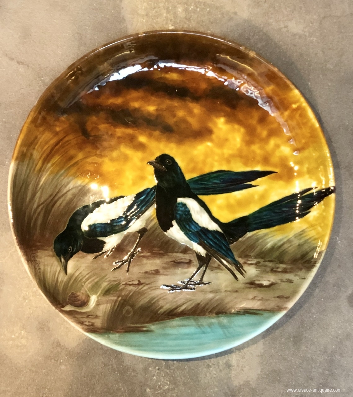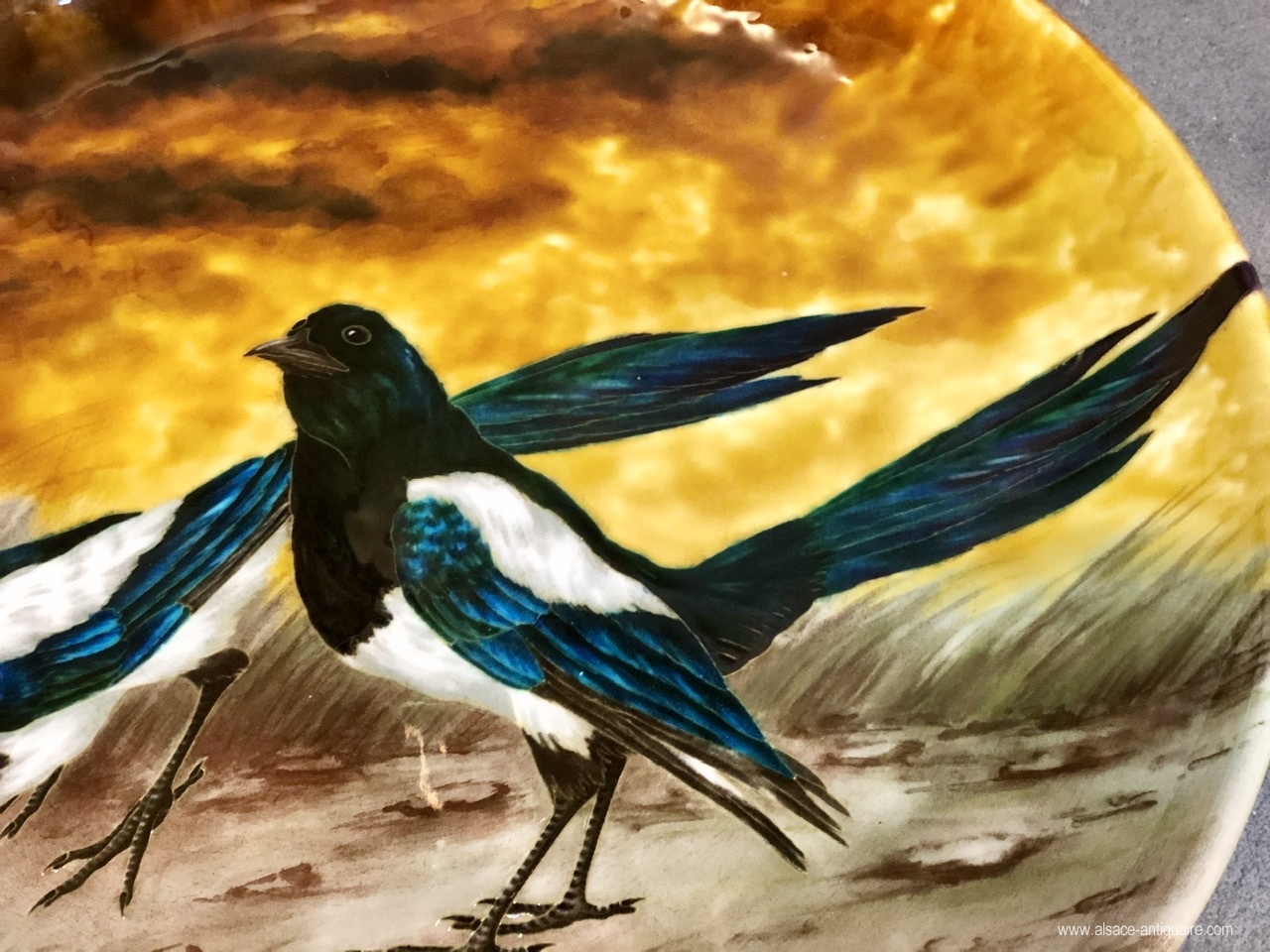 Original ceramic dish featuring two magpies whose plumage in contrasting colors allows Théodore Deck to highlight his technique on metallic reflections. The decor is signed by Eugène Carrière ( 1846-1906). Deck will owe a large part of its fame to its research on colors, it obtained its first distinctions at the heart of its participations in international exhibitions in particular for the famous "Blue Deck". Théodore Deck (1821-1893). Dish signed under the base Th DECK in red and the stamp of the effigy of Deck in hollow.