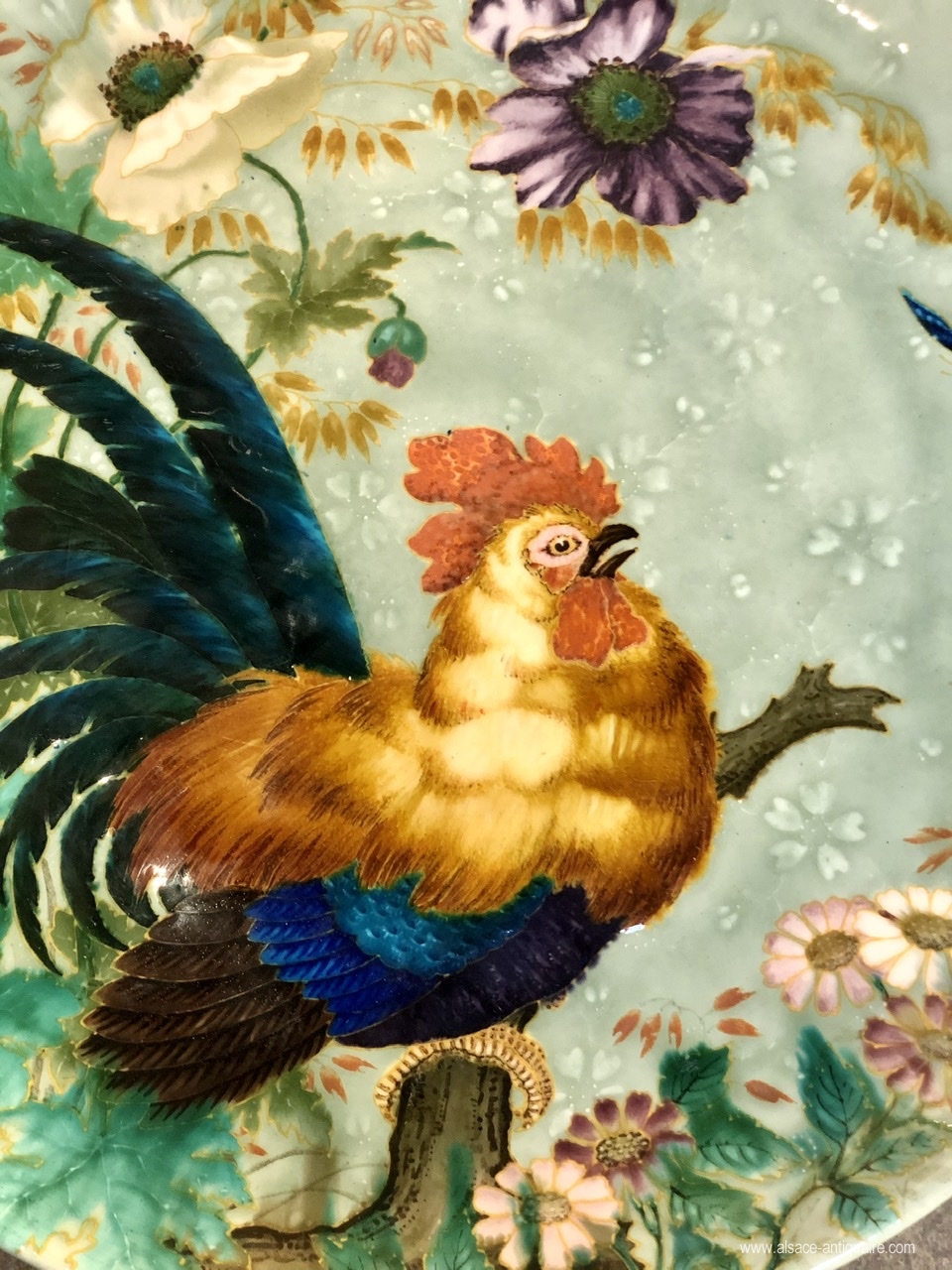 Colors with exceptional metallic reflections for this large rooster dish with light celadon background. Signed on the back TH. DECK and stamp with the image of Théodore Deck (Guebwiller 1823 - Paris 1891)