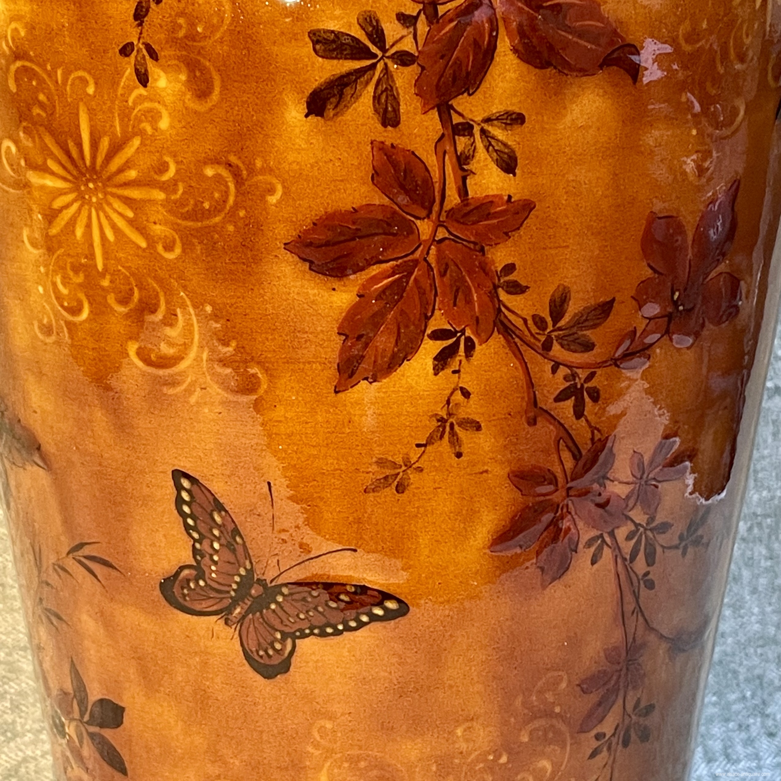 Floral decor and butterflies on a nièlé background for this ceramic vase with flared neck, blue interior by Théodore Deck (1823-1891). Signed under the base TH. DECK . Period late nineteenth century.