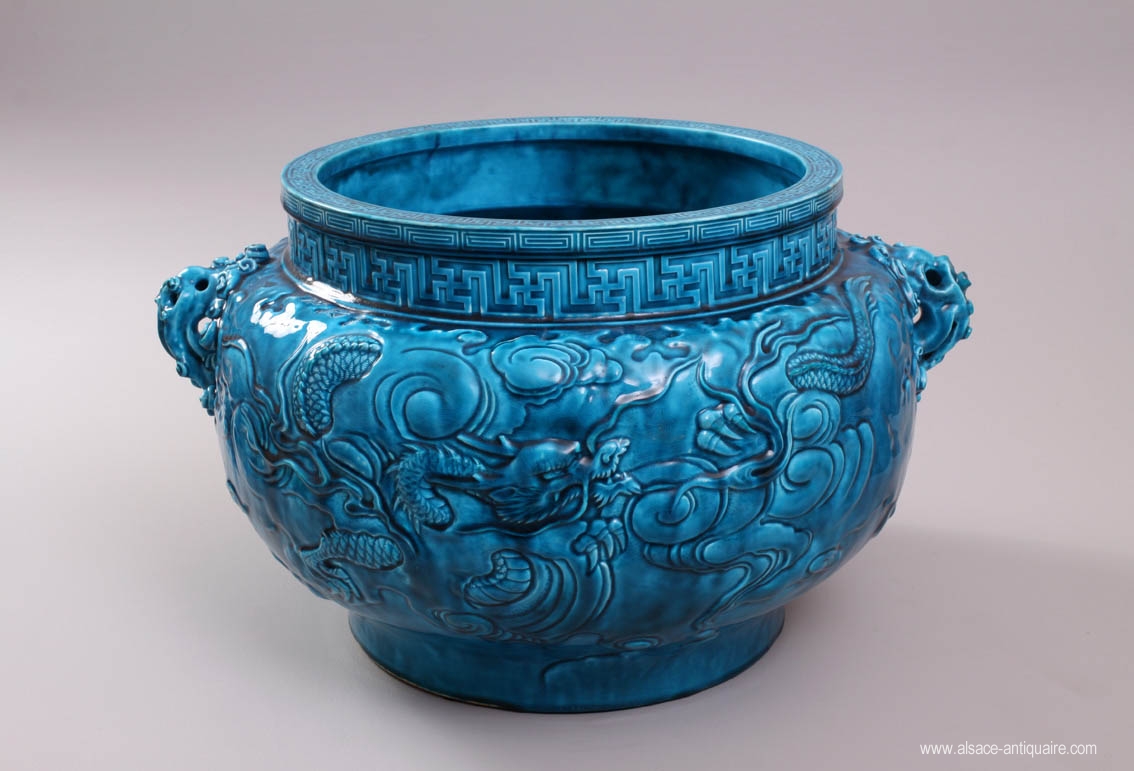 Impressive and exceptional flowerpot in Bleu Deck from the XIXth century, adorned with Chinese dragons and chimera. This kind of decoration was popular during Napoleon III period. The famous color is enhanced by the reliefs.
