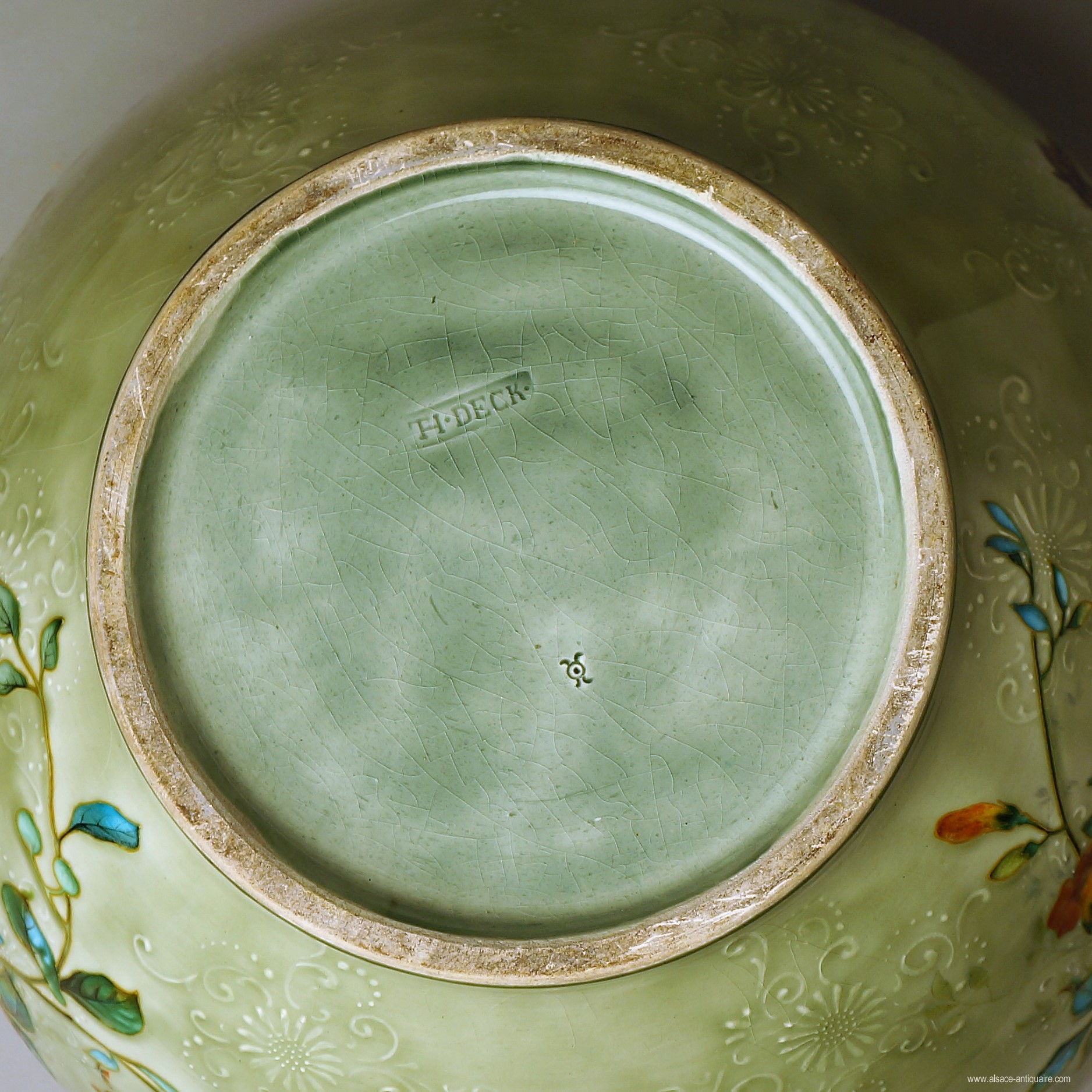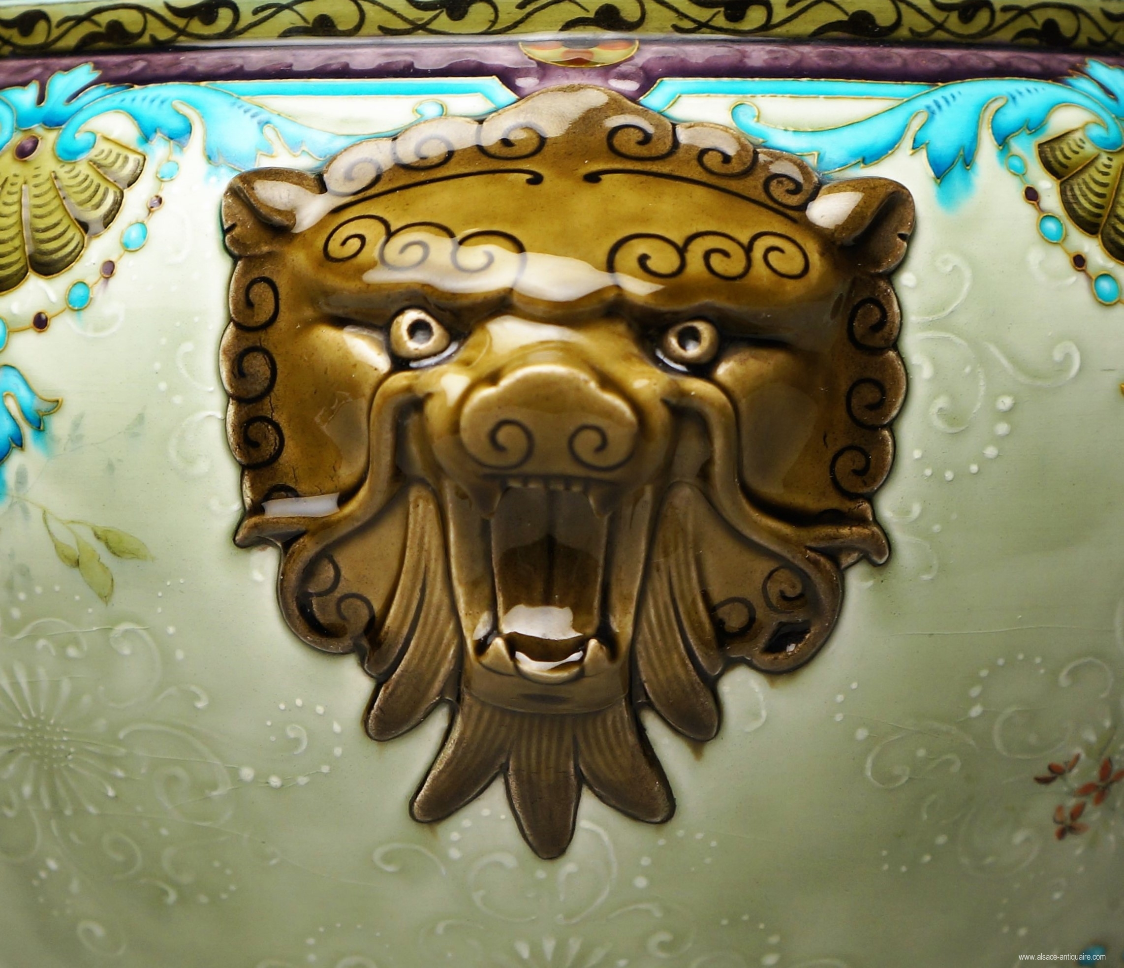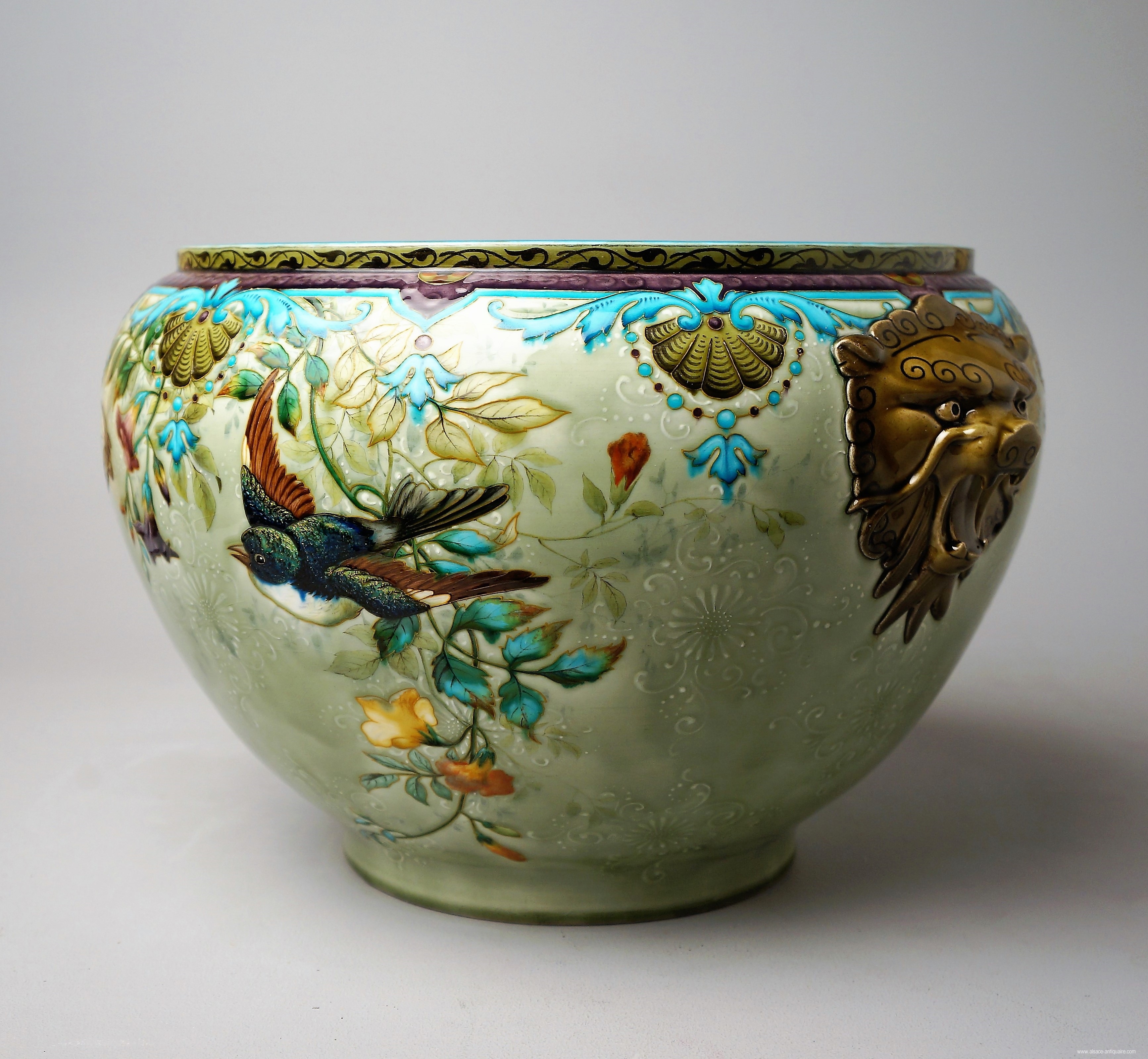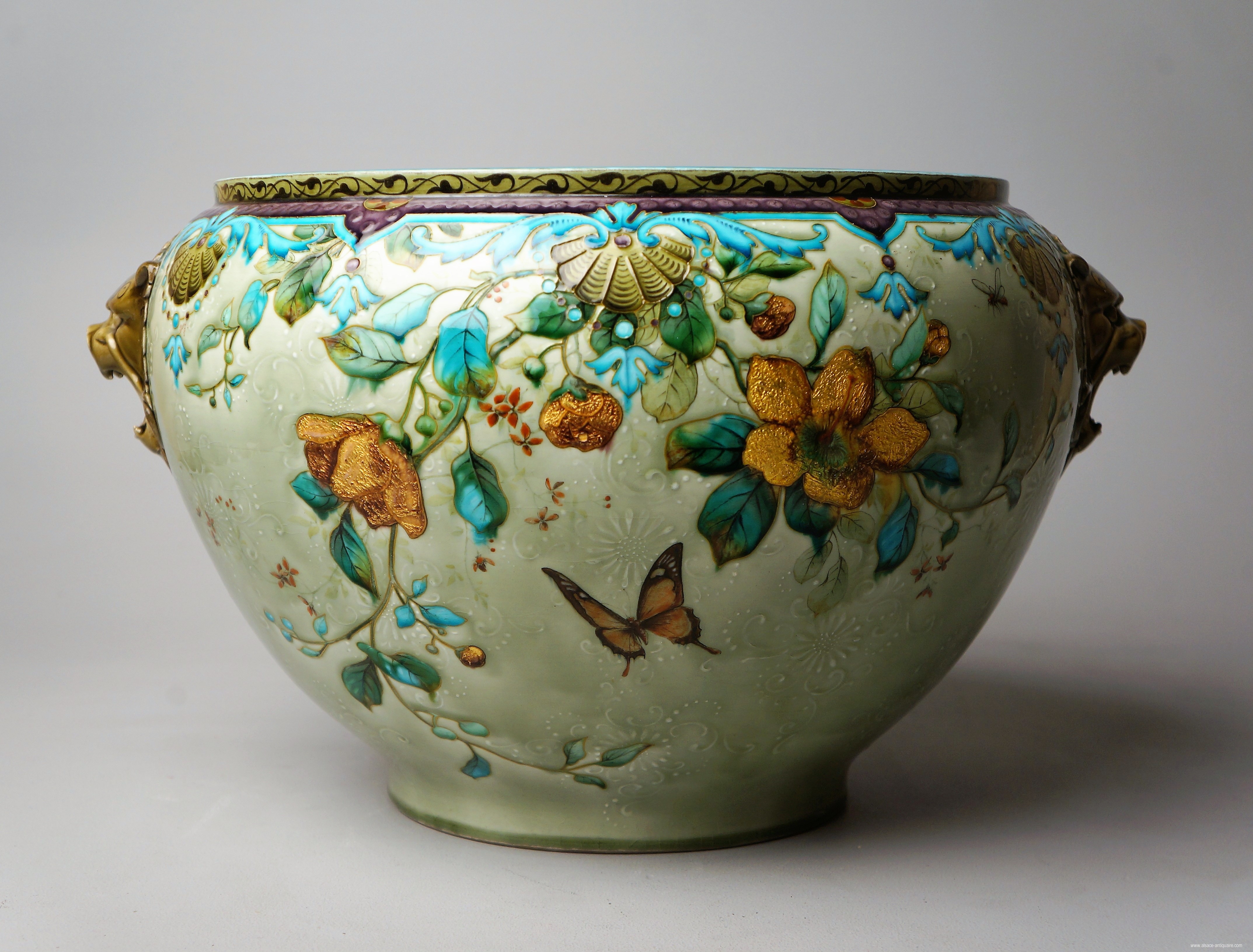 Large round planter, the Japanese decor of polychrome flowering branches with petals with gold inclusions, stands out against the celadon green background, this background presents a frieze, tone on tone, branches in slight reliefs. Lion muzzle handles. Signed TH DECK under the base