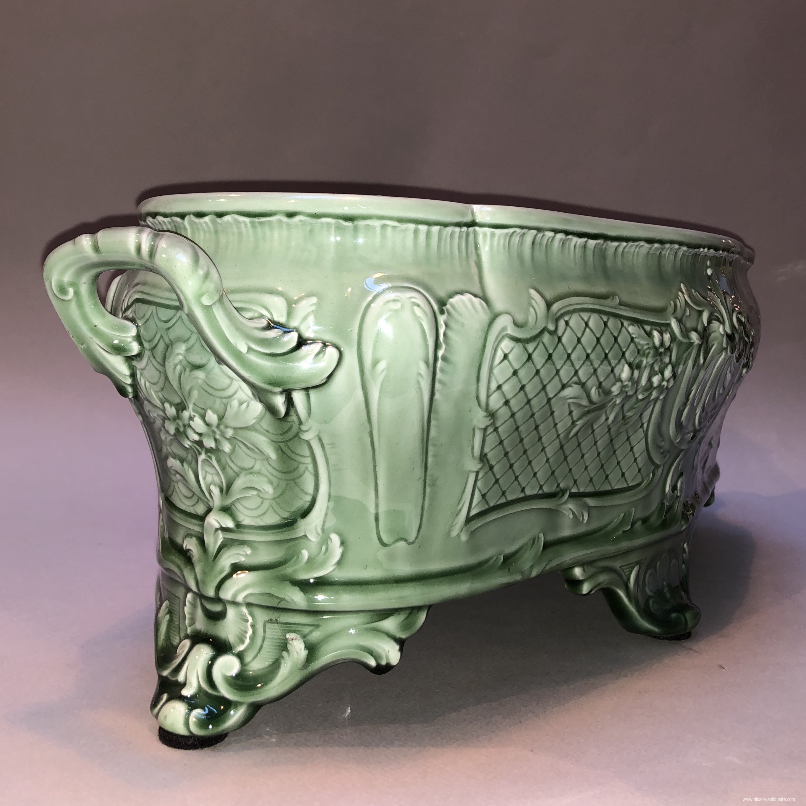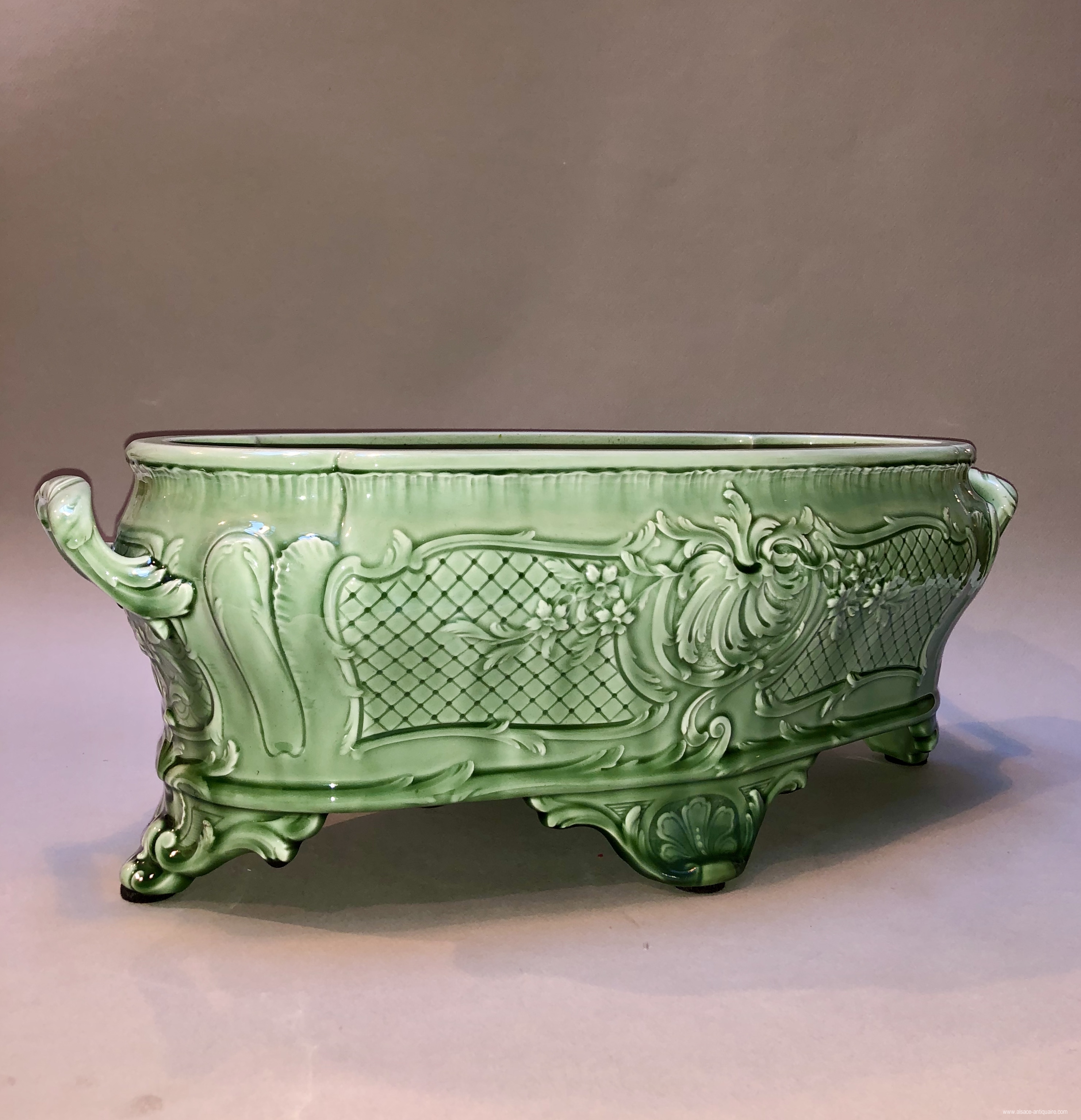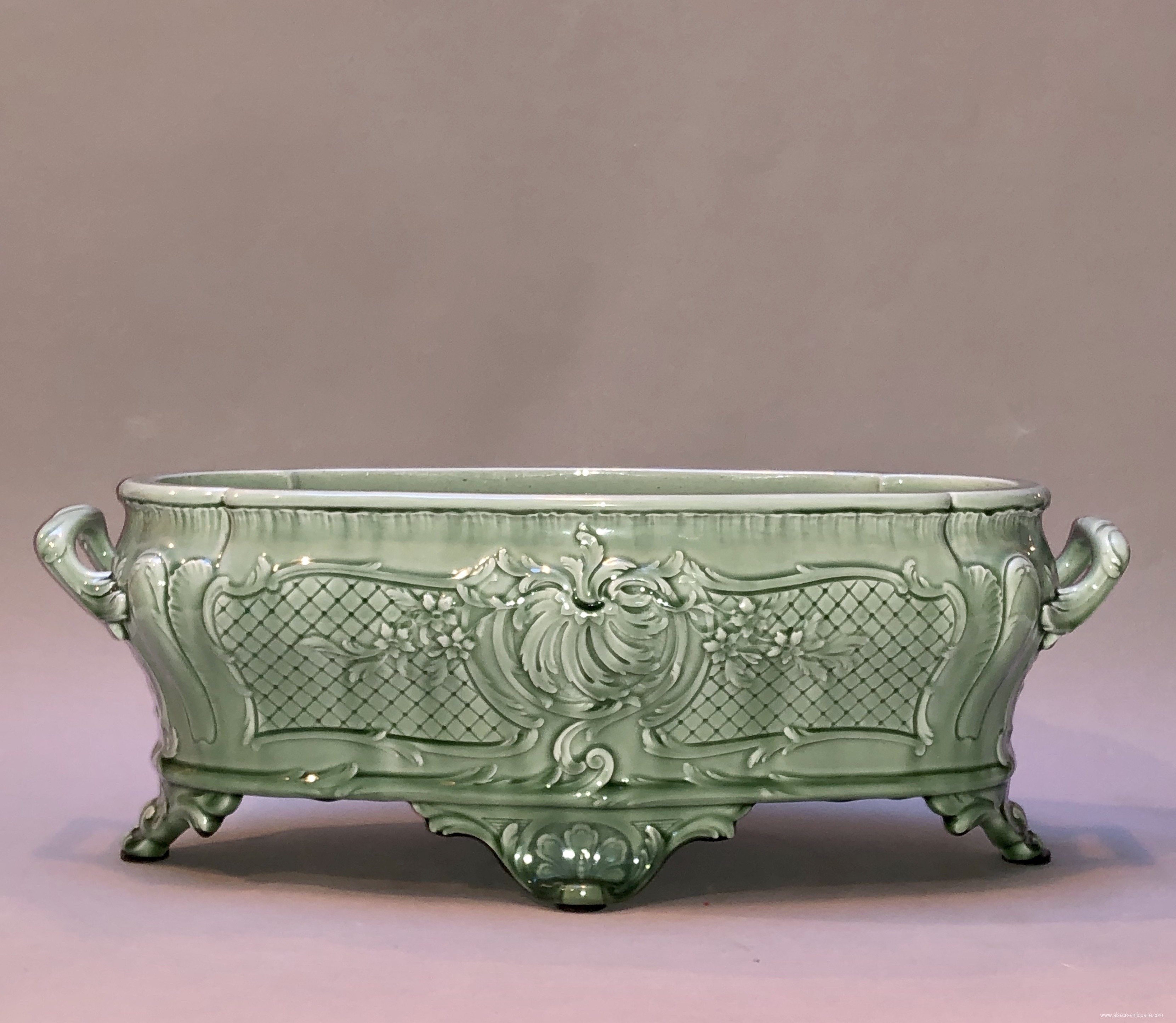 Decoration of rockeries, scrolls, flower scrolls on a honeycomb and shell background for this model of oval planter whose contours are fretted. Small scrolls. Beautiful hues of celadon green. Signed intaglio under the Th. Deck base and the medallion with the image of Theodore Deck