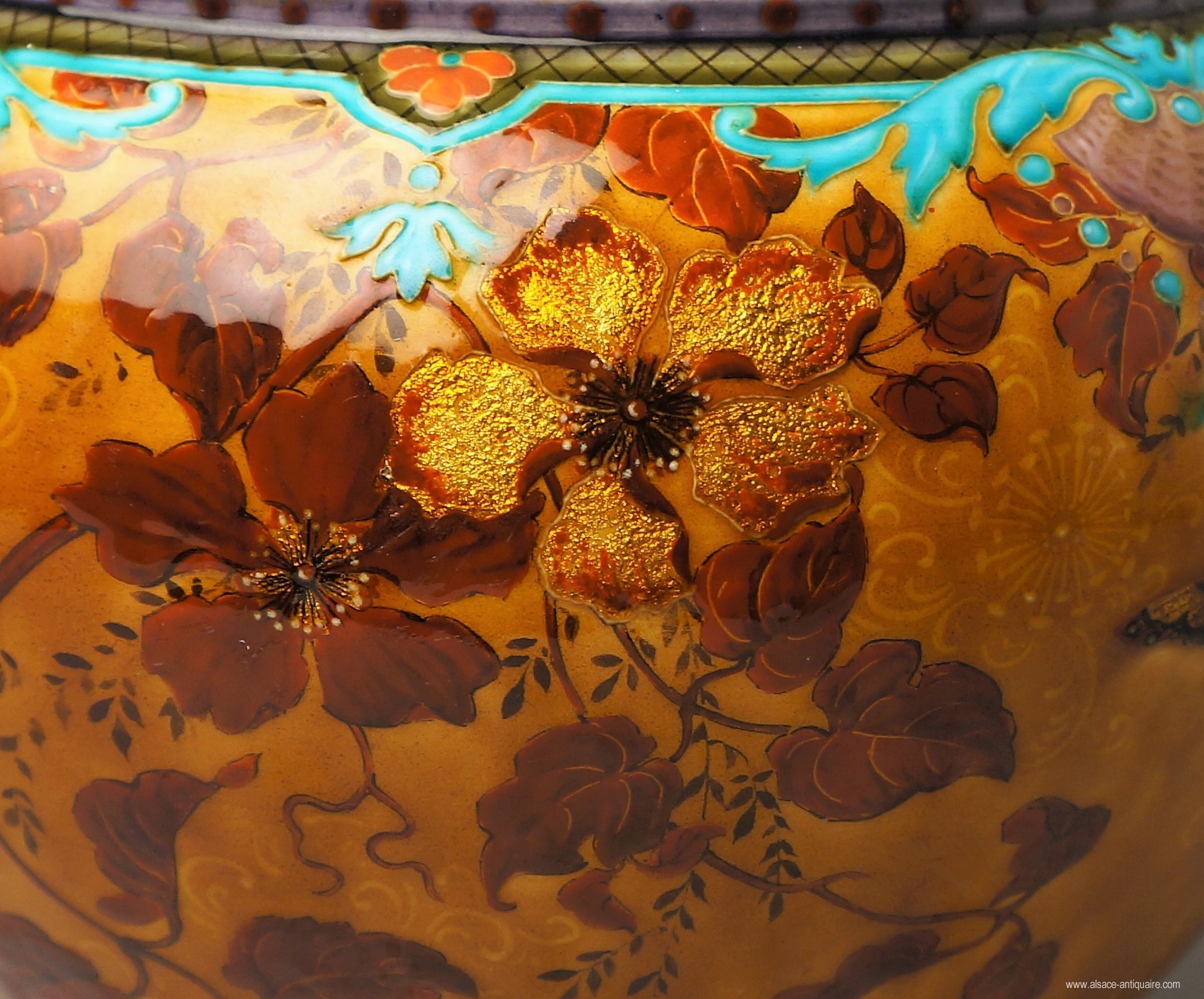 Round yellow flowerpot with lion head handles, adorned with flowering branches and one of Theodore Deck's specialties, gold inclusion. This process gives petals an incomparable brilliance.