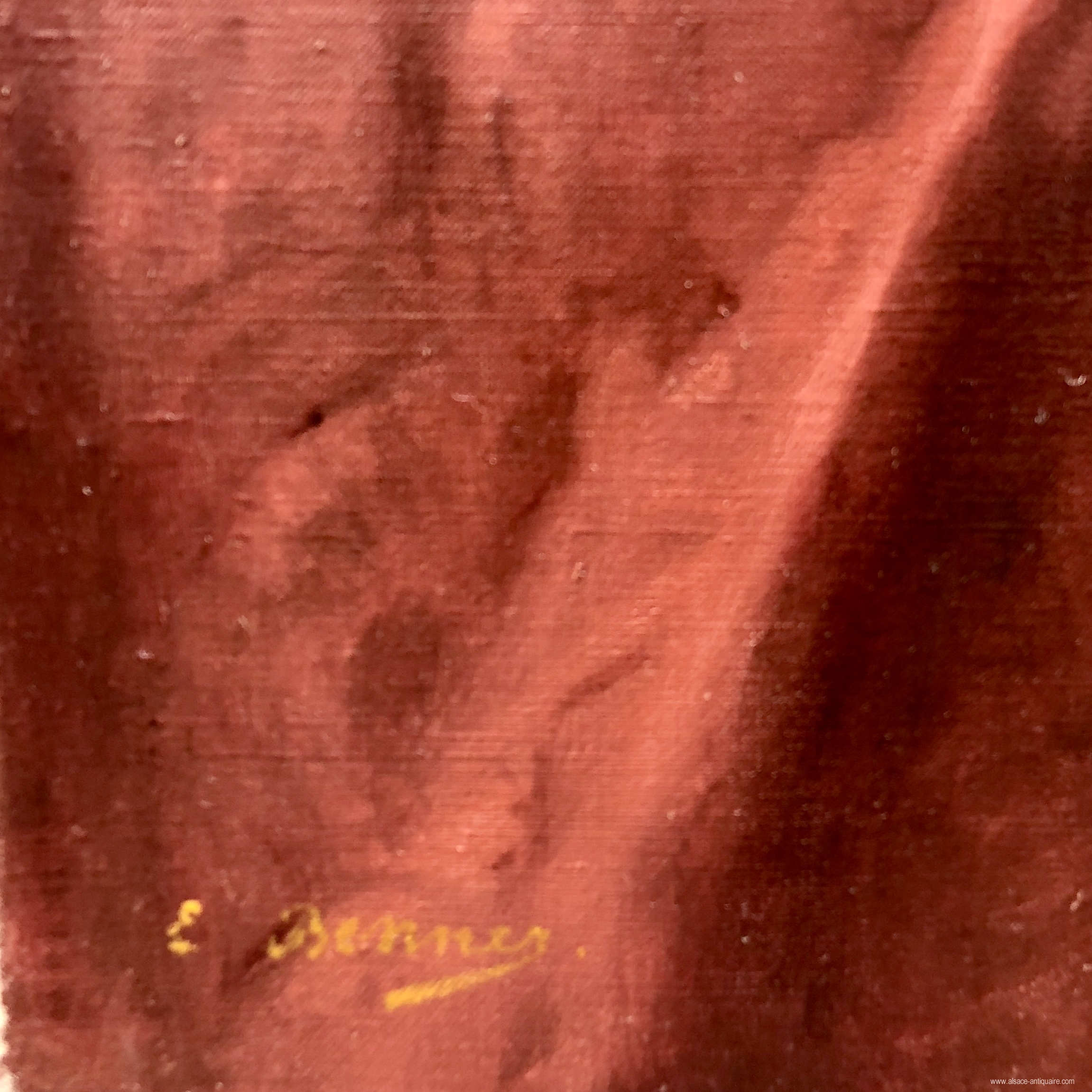 A remarkable sensuality emerges from this work, signed lower left Emmanuel Benner, twin brother of Jean Benner. The purple gradation of the bustier, towards the pink of the skirt to darken with the red of the cloth, the blonde hair and the softness of the skin stand out against the dark background. Oil on canvas .