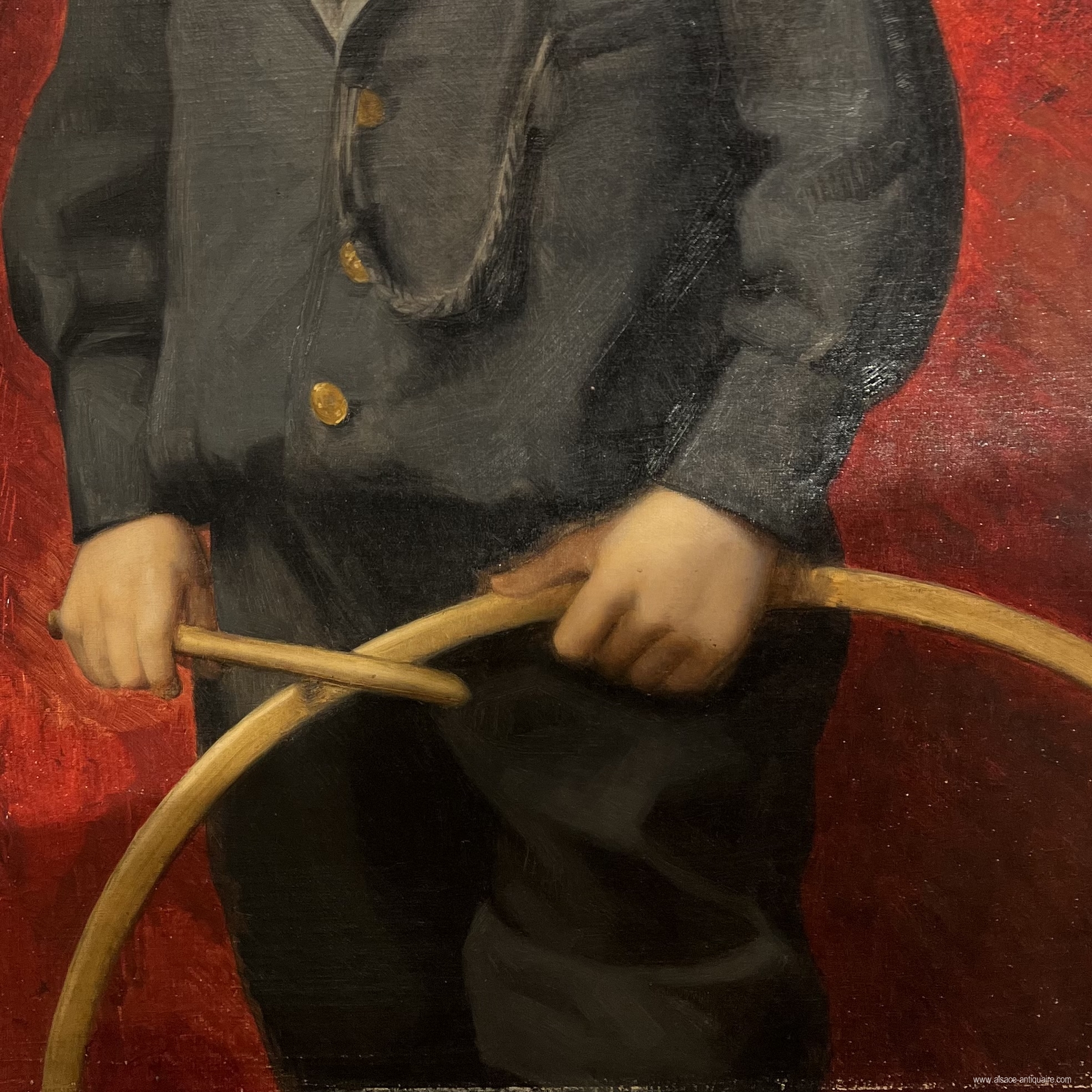 The young boy with the hoop, extraordinary portrait signed Auguste Zwiller (1850-1939), we had already presented the young girl with the hoop, this toy is however intended to be used in the representations of children made by Zwiller, it is an extraordinary and happy chance to find these two works in very different places. Zwiller, Alsatian artist, born in Didenheim near Mulhouse. After working as a draftsman in the pattern-making workshops for the Mulhouse textile factories, he trained at the Cours Julian and embarked on a successful career in Paris, quickly becoming a renowned portrait painter.