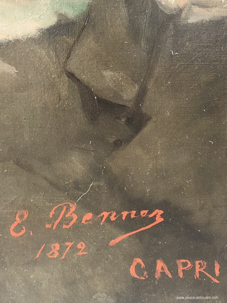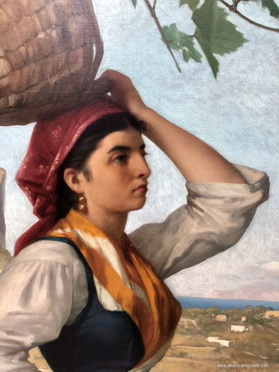 This pretty capriot, in her local-coloured coat, who, given the pannier held on her head and the vine shoots that cover the top of the painting, is probably attached to the work of the harvest. The body of the young woman stands out against the landscaped background, stopped by the blue of the sea and dotted with houses with white walls. The work, an important oil on canvas, is signed Emmanuel Benner at the bottom right, located in Capri and dated 1872.