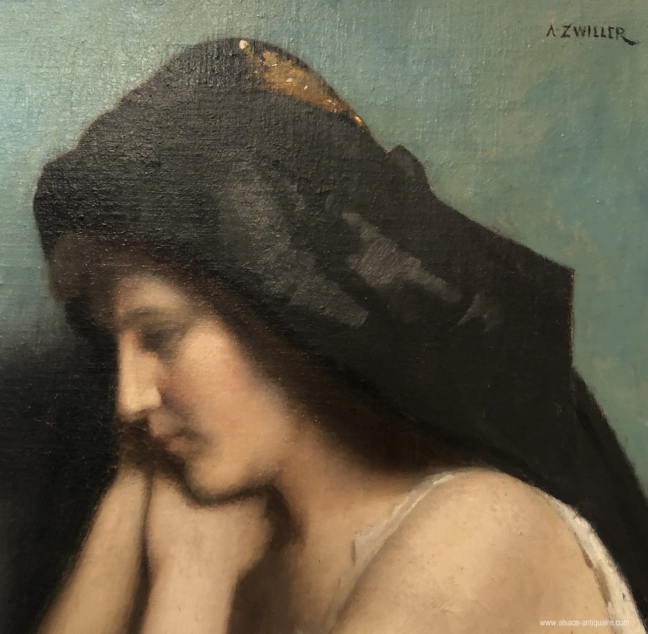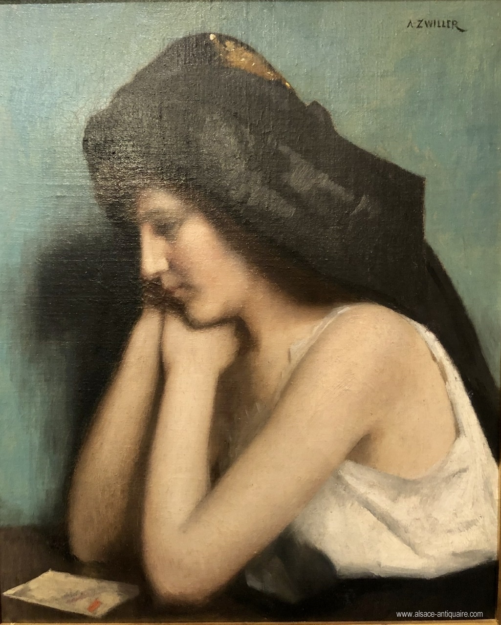 Very beautiful representation of a subject dear to Marie-Augustin Zwiller (1850-1939), the letter symbol of instruction and news, is in this work in the hands of a young Alsatian woman wearing her headdress. Signed A. ZWILLER.
