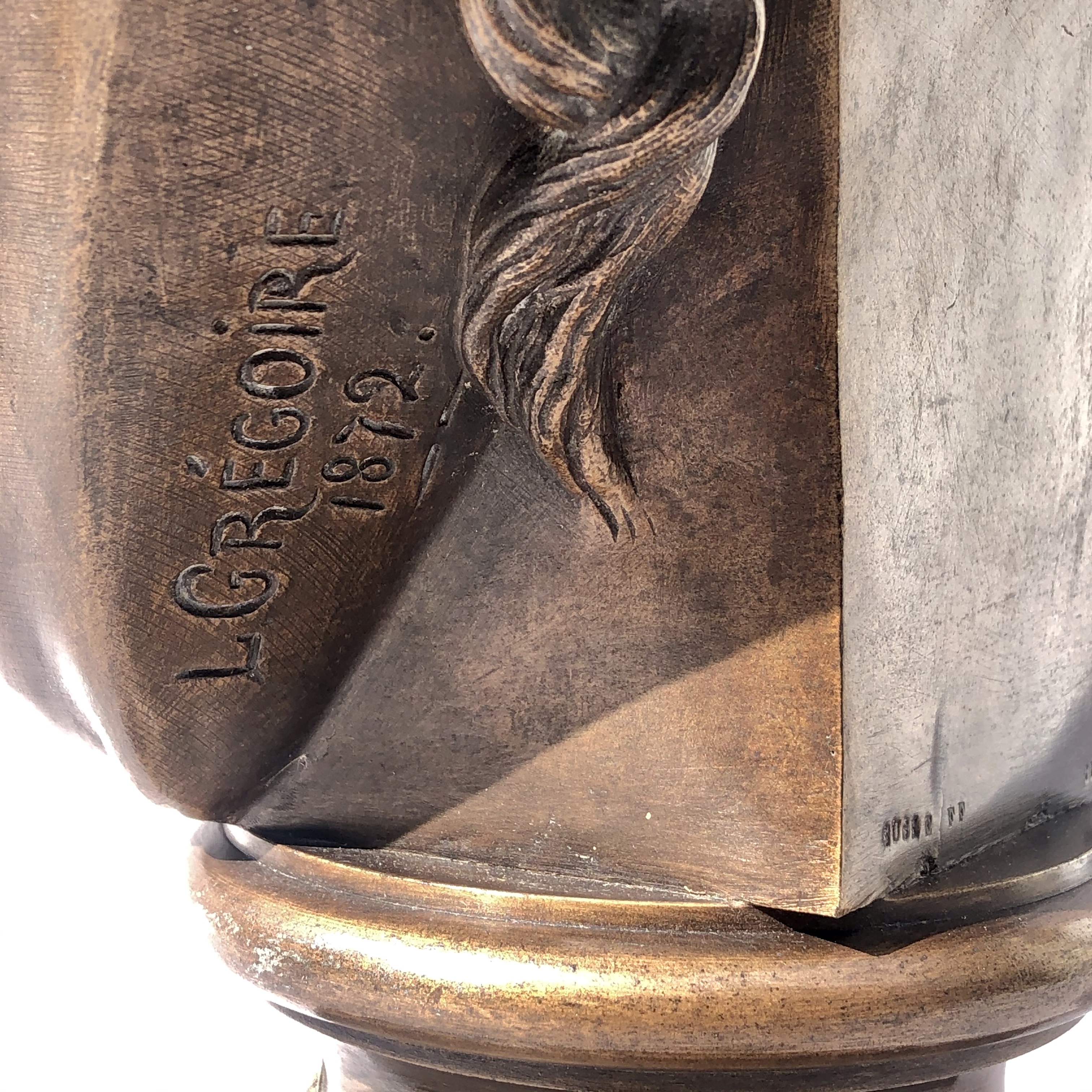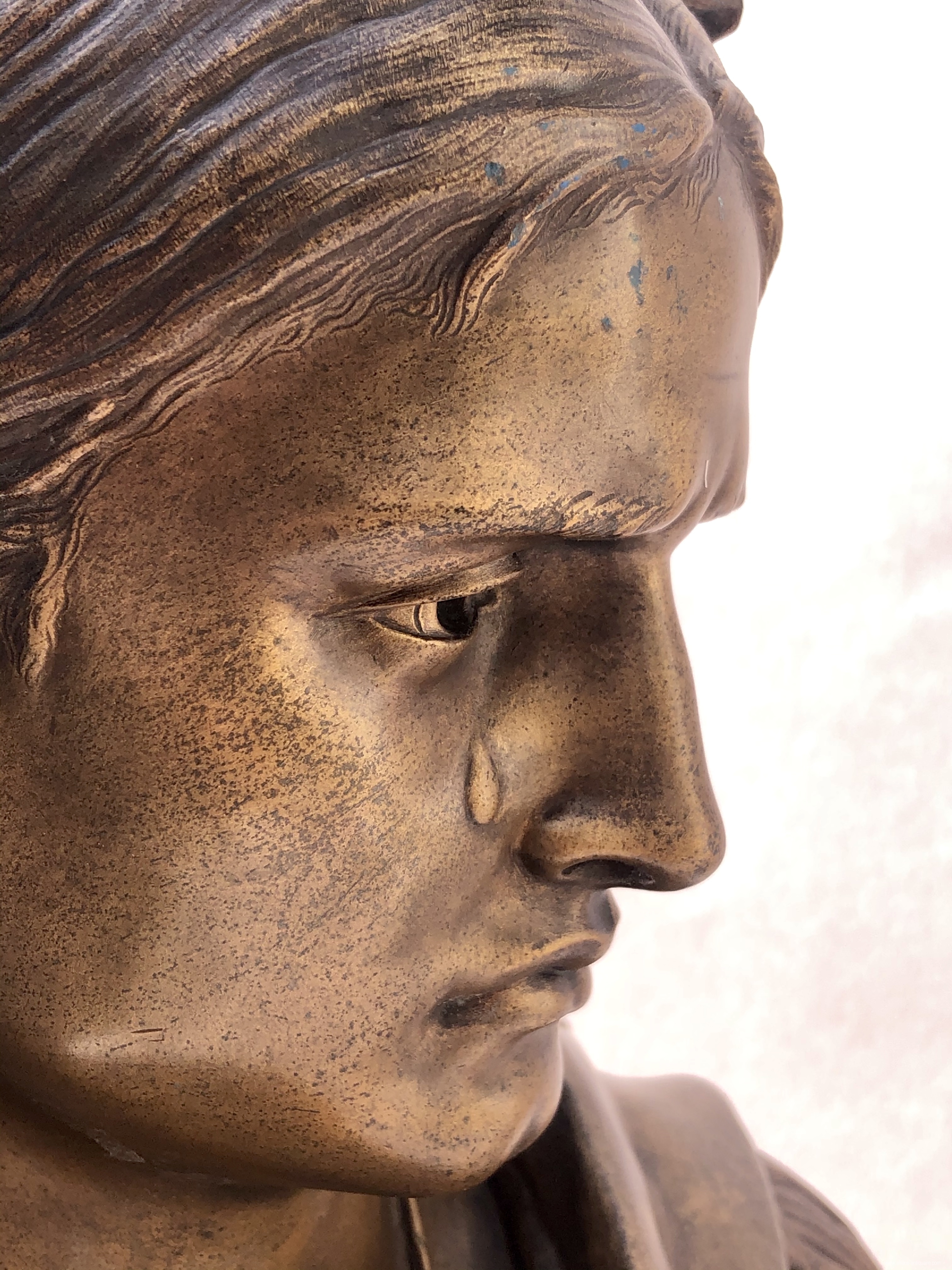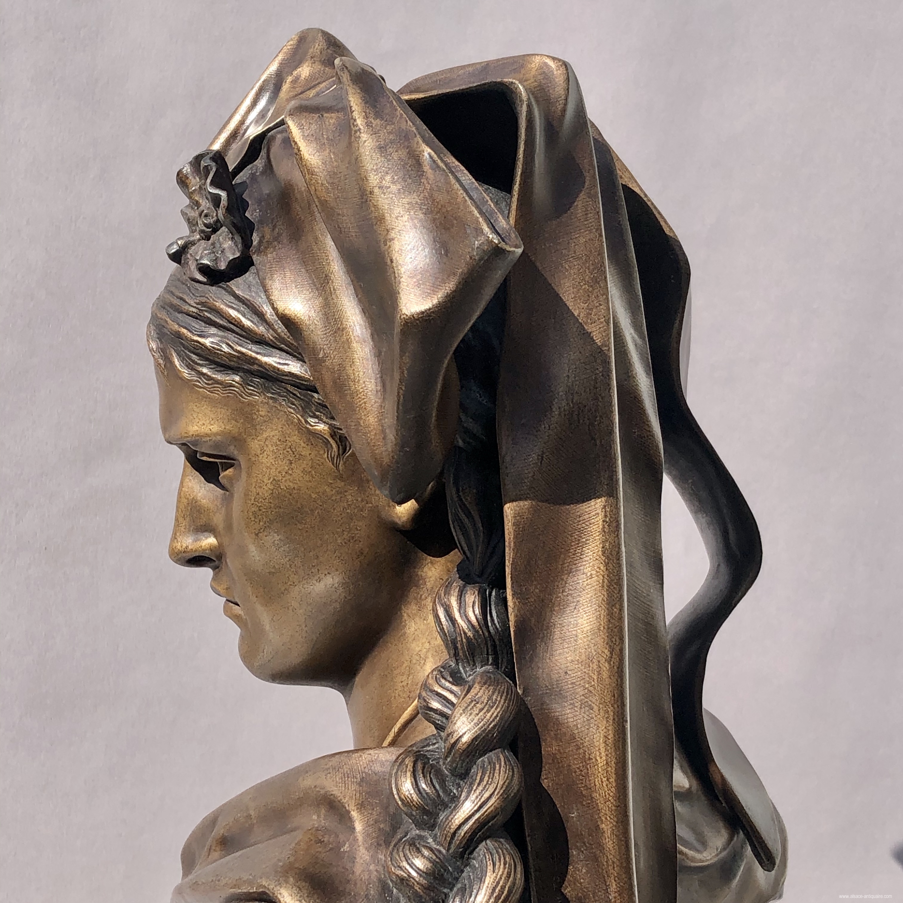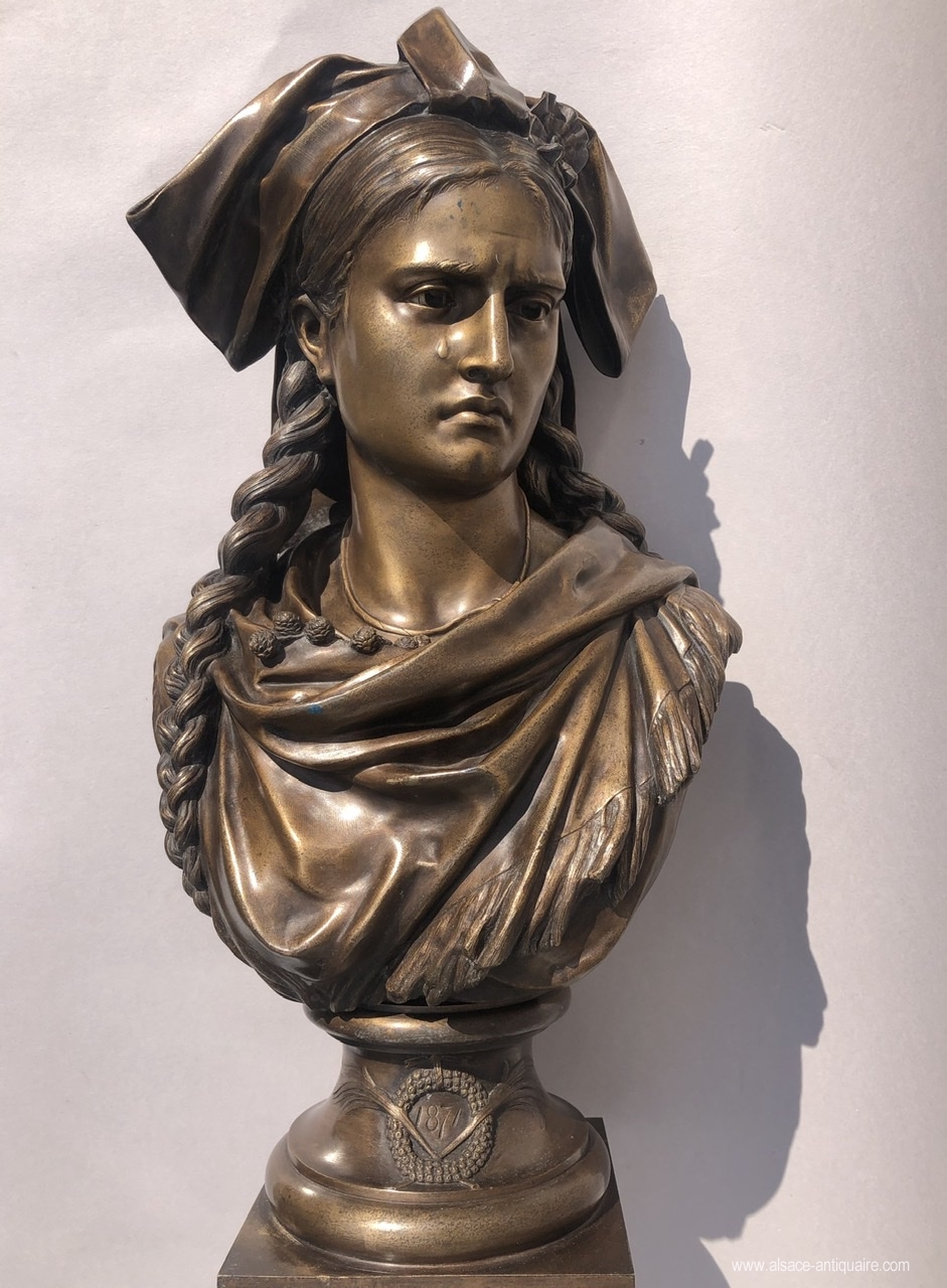 Jean-Louis Grégoire (1840-1890) French artist and sculptor, born in Paris, attended Jean Samson's courses at the Ecole des Beaux Arts in Paris and exhibited regularly in the Salons. Specialist in mythological scenes, he produced several patriotic subjects after the defeat of 1870. In this context, he sculpts, among other things, this superb bust of a young girl in tears symbolizing the suffering of the lost Alsace. This patriotism, widely developed during political debates by Gambetta, a fervent opponent of the abandonment of Alsace, is a theme taken up by many artists of the time. The painting signed by Jean Jacques Henner, "L’Alsace, elle attend", one of the most significant works of this period, was even included in all the history books made available to middle school students. Grégoire produced this work in 1871 and presented a marble version of his "Alsace" in the salon of 1873 and a bronze version in the salon of 1874. Henri d'Orleans, Duke of Aumale, donated in 1897 an identical bust in terracotta at the Condé Chateau Museum in Chantilly.
